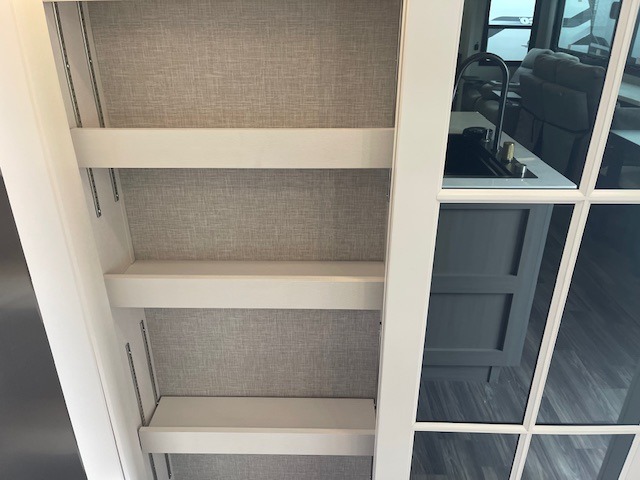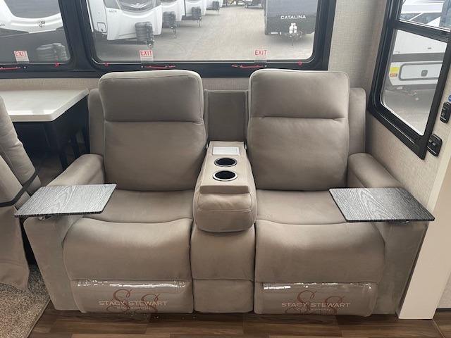 Prepare for great adventures in this fifth wheel! The rear living area features a massive L-shaped sofa which includes a hide-a-bed as well as recliner seats! Plus there's an additional set of theater seats all facing the entertainment center with fireplace and 50" Smart TV. A flexible desk/coffee bar connects the living room to the kitchen so you can work or relax as needed. Meals will be easy to prepare with the island with sink and pull-out cutting board, plus pantry, microwave, and residential refrigerator. Up front you will find the private bedroom with its king bed, closet with drawers and hamper, and even a second TV. The full bath features a shower with seat and a linen closet for convenient storage. Outside you'll find a pair of awnings and a pull-out griddle.