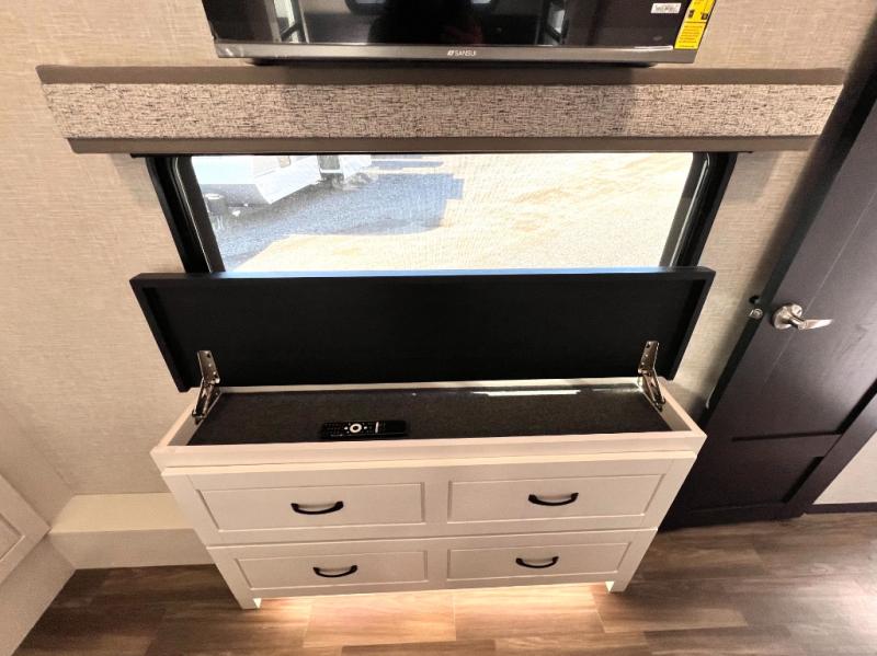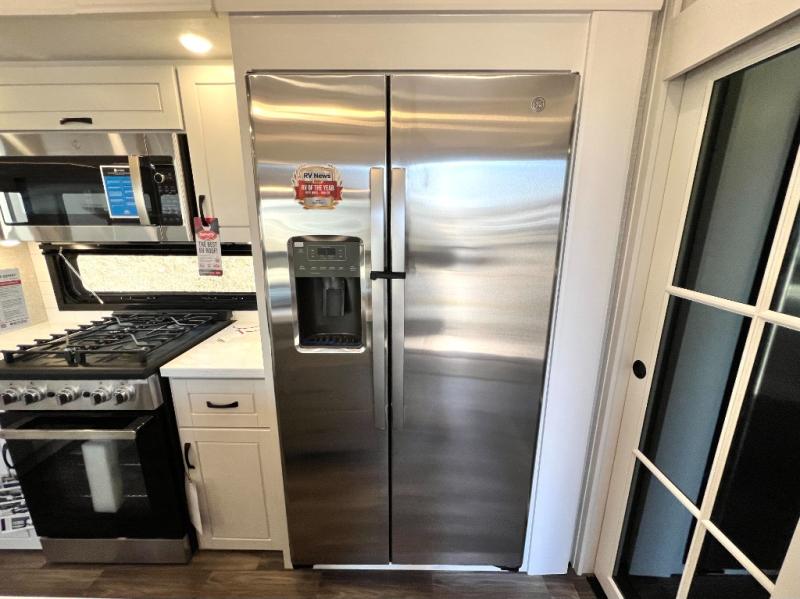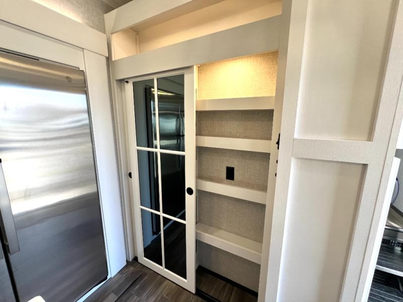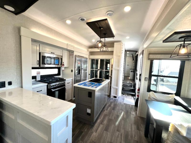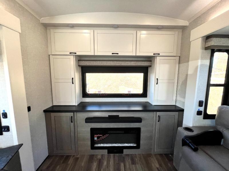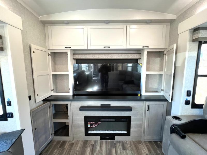 Prepare for great adventures in this fifth wheel! The rear living area features a massive L-shaped sofa which includes a hide-a-bed as well as recliner seats! Plus there's an additional set of theater seats all facing the entertainment center with a fireplace and 50" Smart TV. A flexible desk/coffee bar connects the living room to the kitchen so you can work or relax as needed. Meals will be easy to prepare with the island with sink and pull-out cutting board, plus pantry, microwave, and residential refrigerator. Up front you will find the private bedroom with its king bed, closet with drawers and hamper, and even a second TV. The full bath features a shower with seat and a linen closet for convenient storage. Outside you'll find a pair of awnings and a pull-out griddle.
