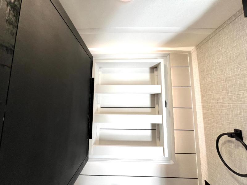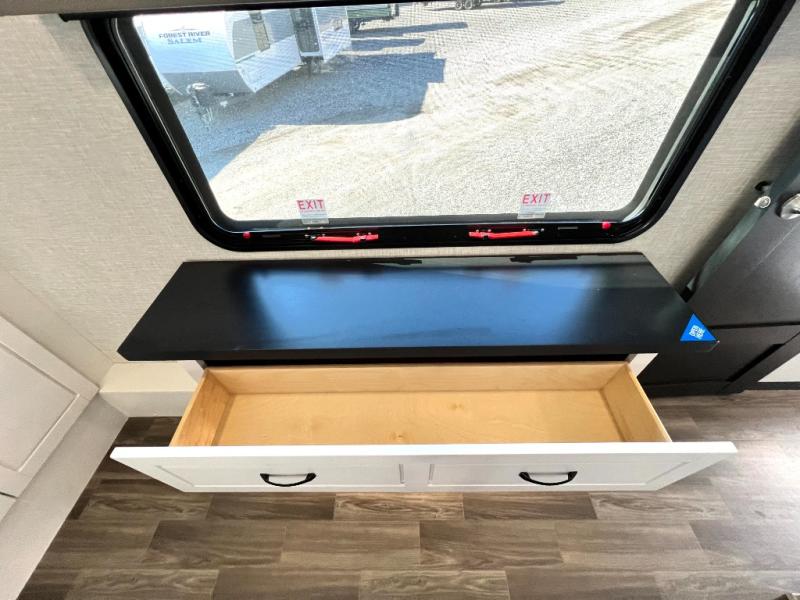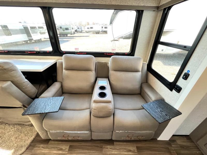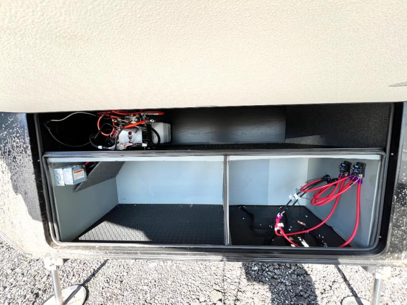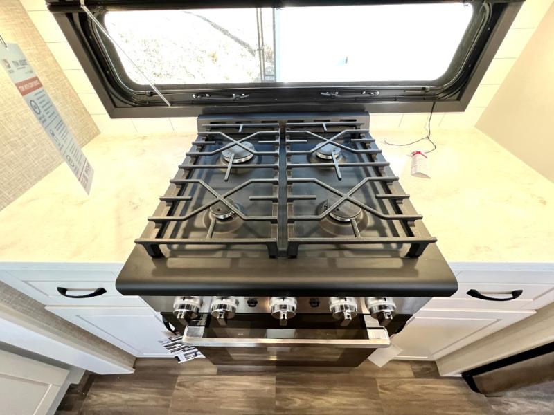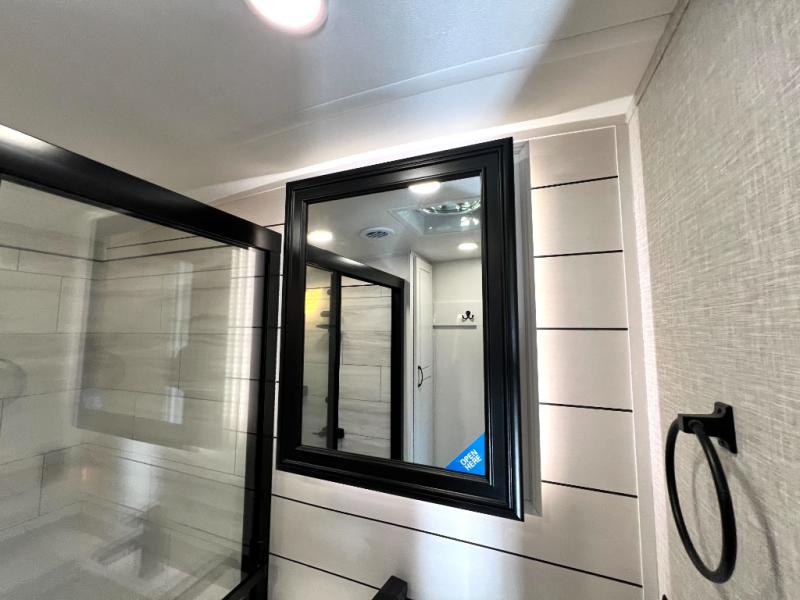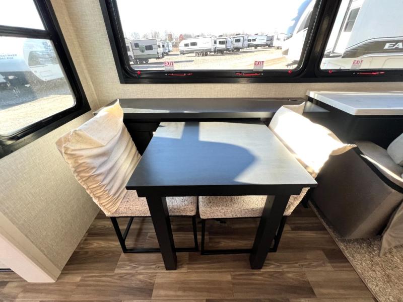 Prepare for great adventures in this fifth wheel! The rear living area features a massive L-shaped sofa which includes a hide-a-bed as well as recliner seats! Plus there's an additional set of theater seats all facing the entertainment center with a fireplace and 50" Smart TV. A flexible desk/coffee bar connects the living room to the kitchen so you can work or relax as needed. Meals will be easy to prepare with the island with sink and pull-out cutting board, plus pantry, microwave, and residential refrigerator. Up front you will find the private bedroom with its king bed, closet with drawers and hamper, and even a second TV. The full bath features a shower with seat and a linen closet for convenient storage. Outside you'll find a pair of awnings and a pull-out griddle.