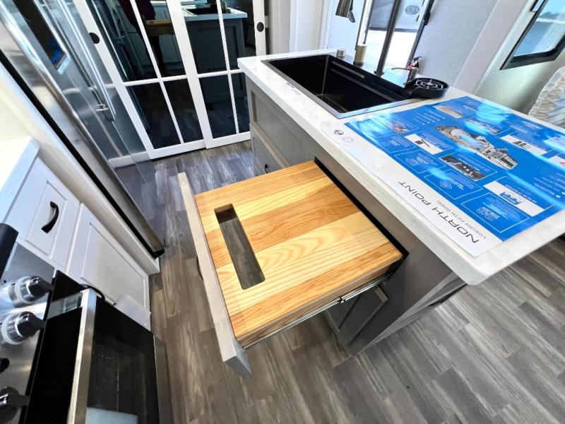 With any North Point fifth wheel by Jayco you begin with a strong foundation with a custom frame, designed and sized specifically to best support each unit. Constructed with Stronghold VBL™ aluminum framed, vacuum bond laminated walls and the Magnum Truss™ XL6™ roof system with a one-piece, seamless roof material, which is the strongest tested roof in the industry. The 5-Star Handling package is included with Uniroyal tires, a MORryde rubber pin box, Dexter axles with Nev-R-Adjust brakes, MORryde CRE-3000 rubberized suspension and wet bolt fasteners and bronze bushings. The interior has handcrafted hardwood glazed doors and drawers, vinyl flooring throughout, an integrated under-mount sink in the main bathroom, plus so much more you just have to see one to believe it all!