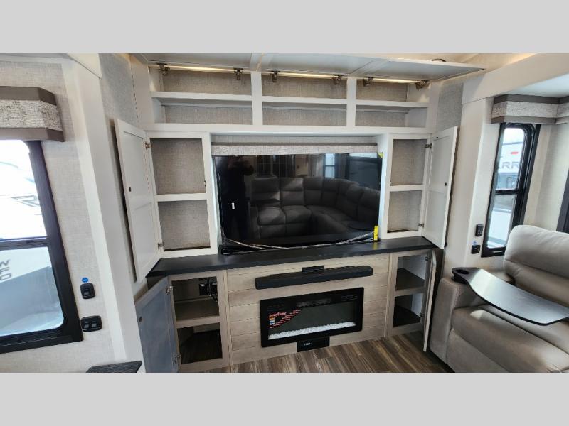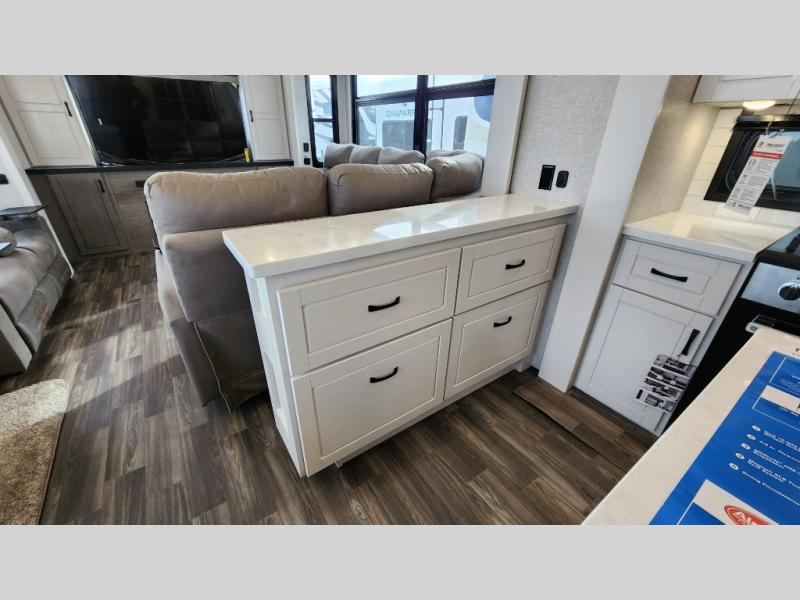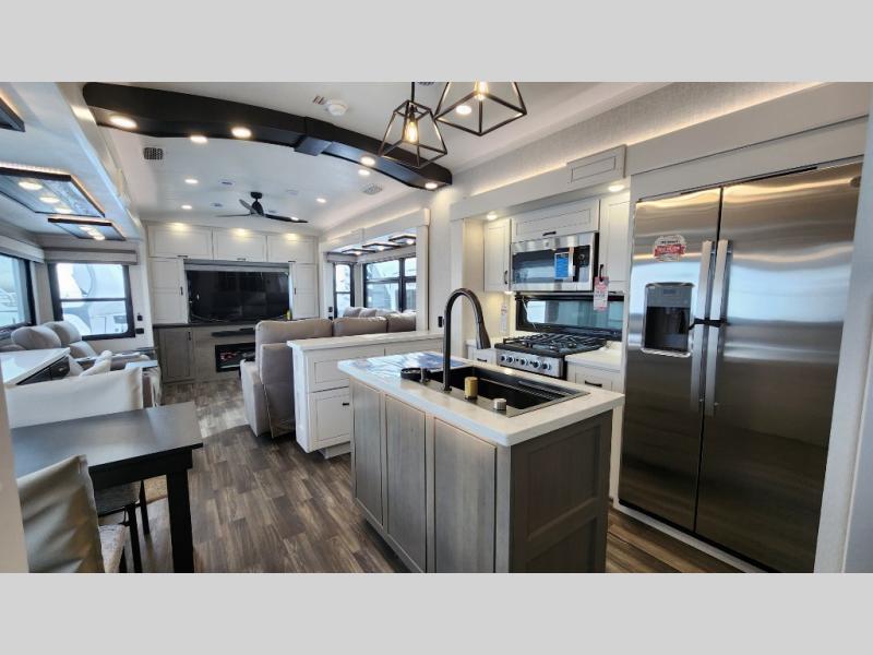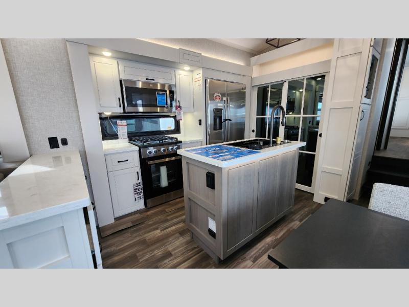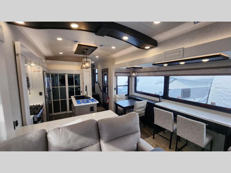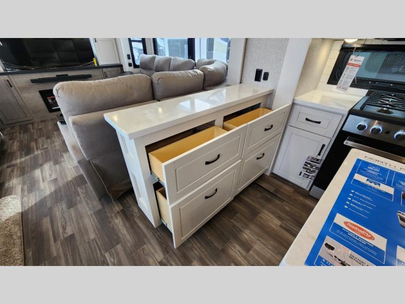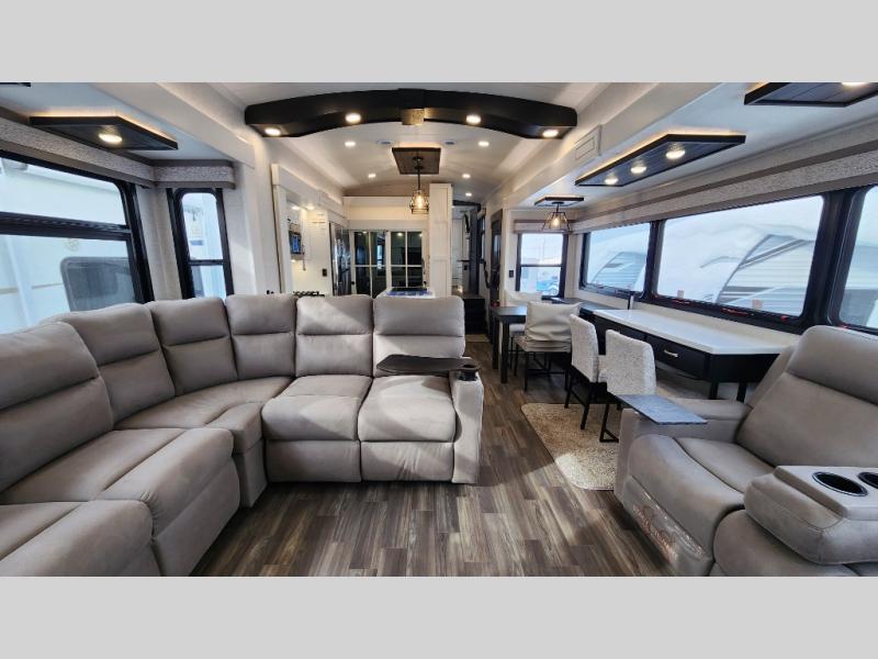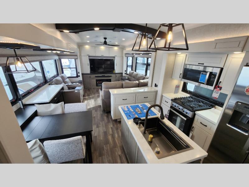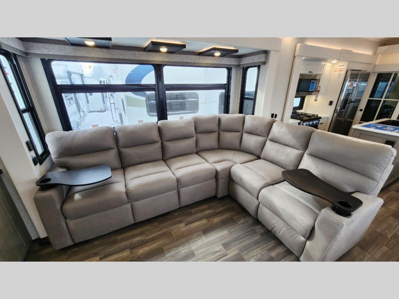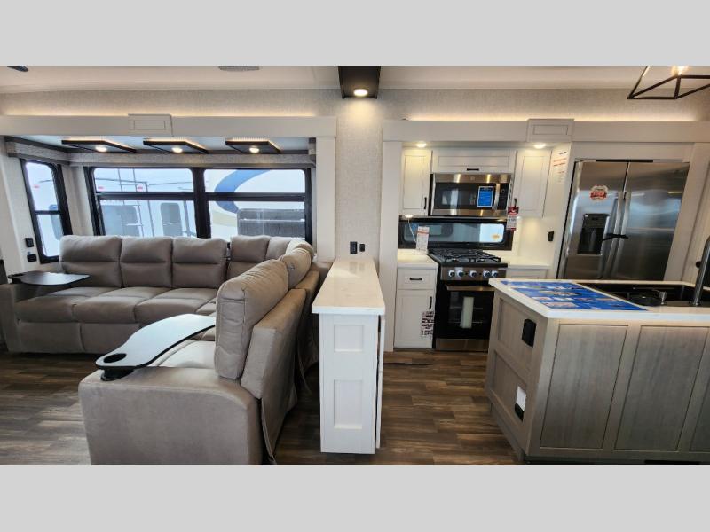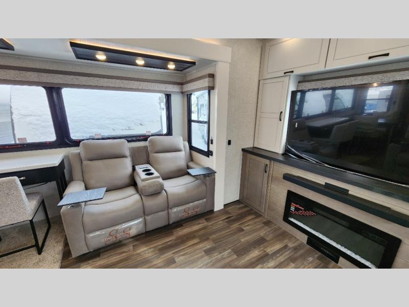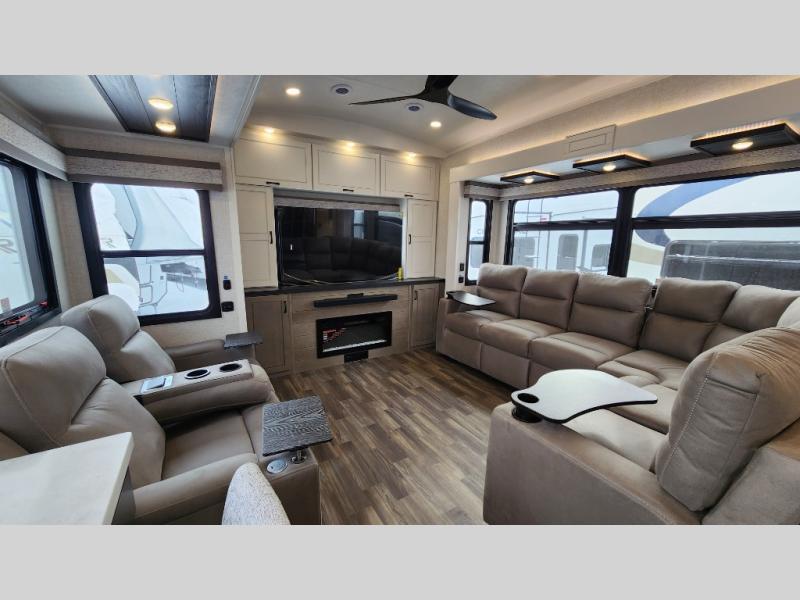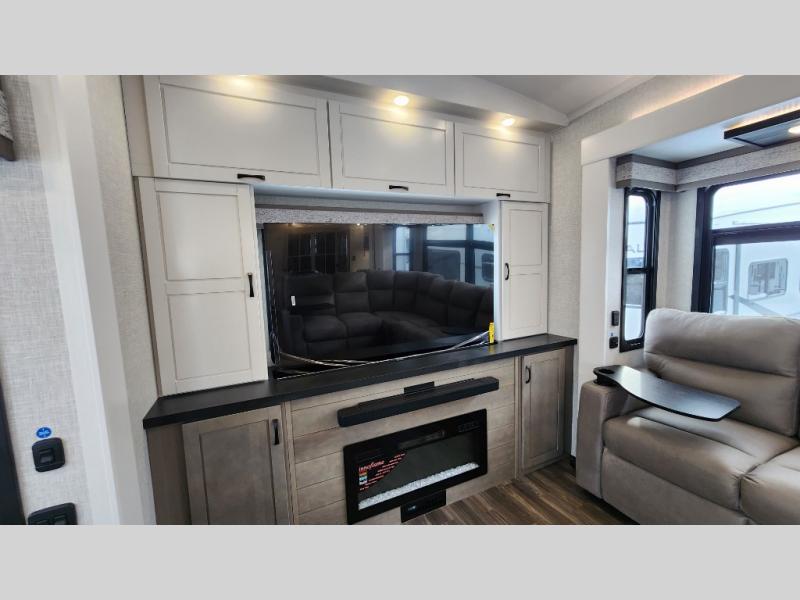 Prepare for great adventures in this fifth wheel! The rear living area features a massive L-shaped sofa which includes a hide-a-bed as well as recliner seats! Plus there's an additional set of theater seats all facing the entertainment center with a fireplace and 50" Smart TV. A flexible desk/coffee bar connects the living room to the kitchen so you can work or relax as needed. Meals will be easy to prepare with the island with sink and pull-out cutting board, plus pantry, microwave, and residential refrigerator. Up front you will find the private bedroom with its king bed, closet with drawers and hamper, and even a second TV. The full bath features a shower with seat and a linen closet for convenient storage. Outside you'll find a pair of awnings and a pull-out griddle.