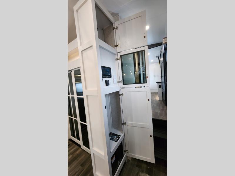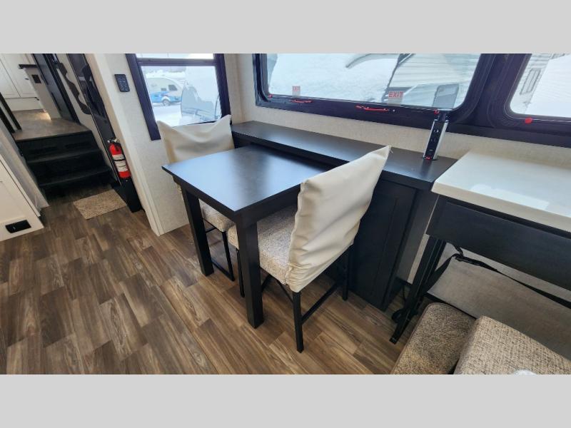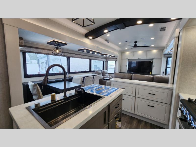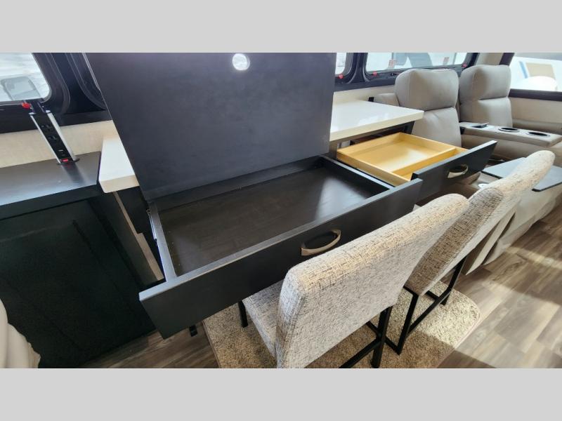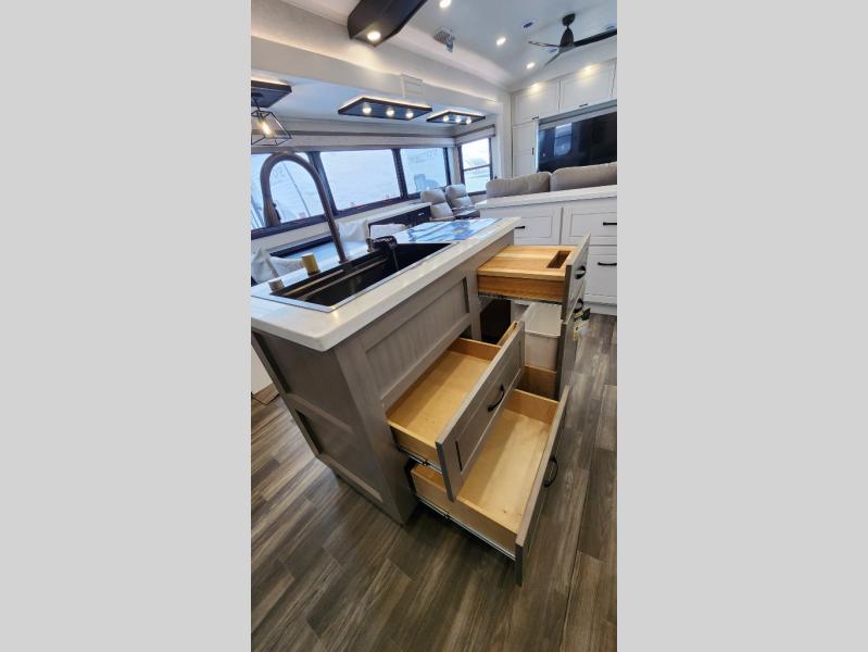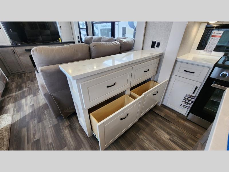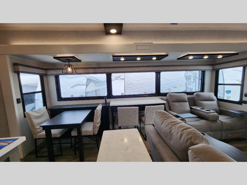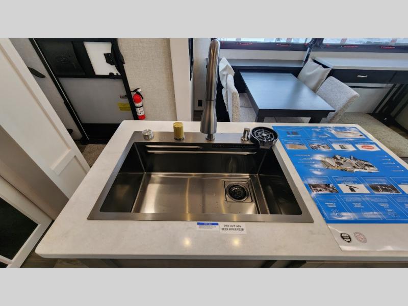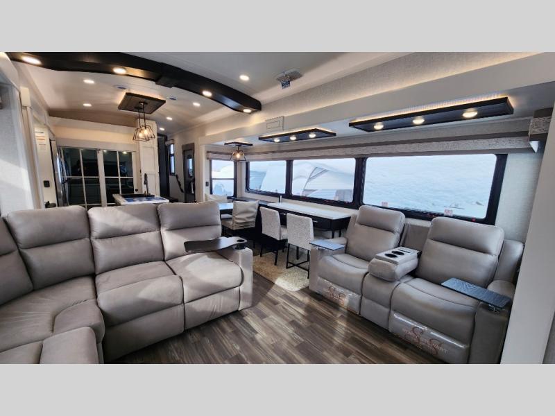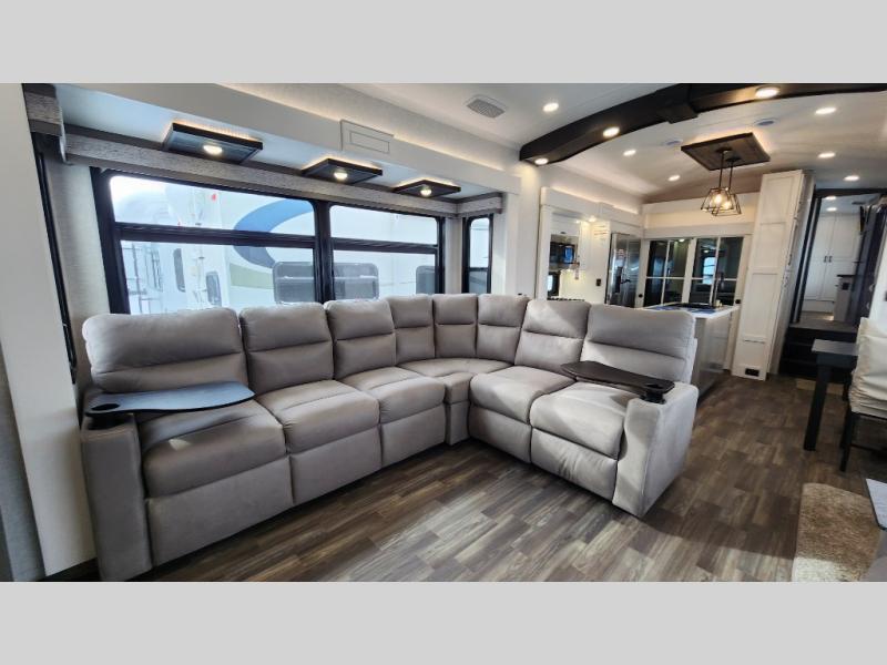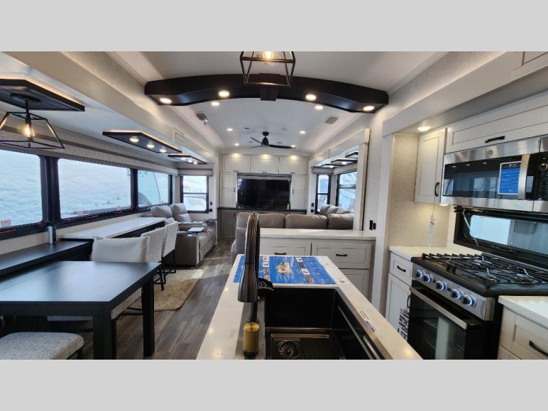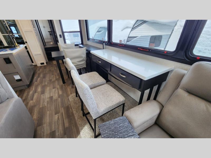 Prepare for great adventures in this fifth wheel! The rear living area features a massive L-shaped sofa which includes a hide-a-bed as well as recliner seats! Plus there's an additional set of theater seats all facing the entertainment center with a fireplace and 50" Smart TV. A flexible desk/coffee bar connects the living room to the kitchen so you can work or relax as needed. Meals will be easy to prepare with the island with sink and pull-out cutting board, plus pantry, microwave, and residential refrigerator. Up front you will find the private bedroom with its king bed, closet with drawers and hamper, and even a second TV. The full bath features a shower with seat and a linen closet for convenient storage. Outside you'll find a pair of awnings and a pull-out griddle.