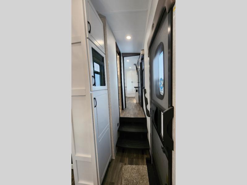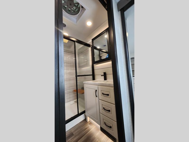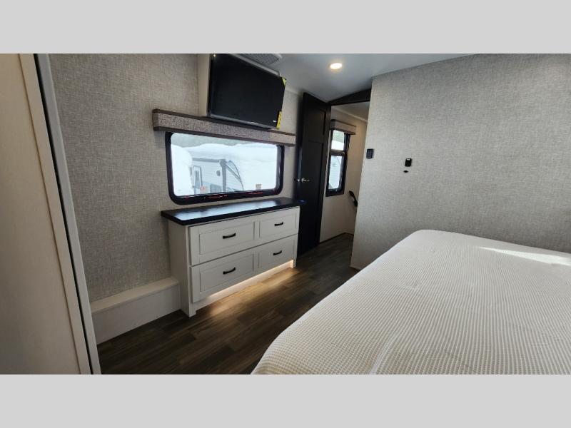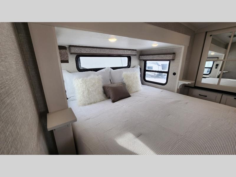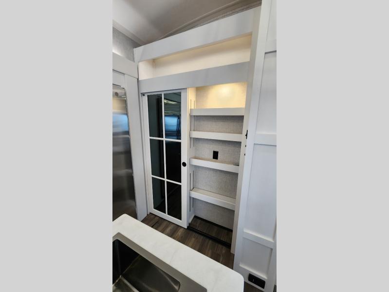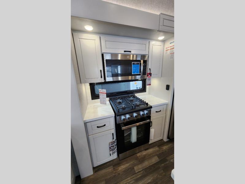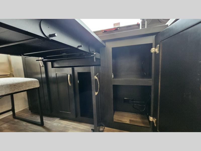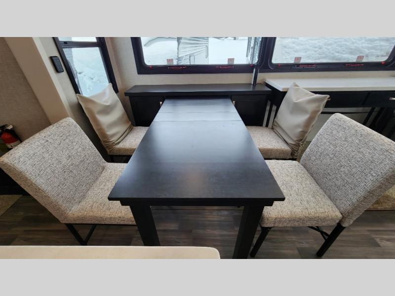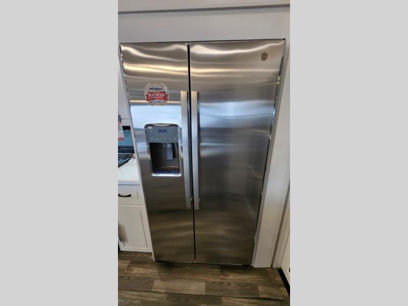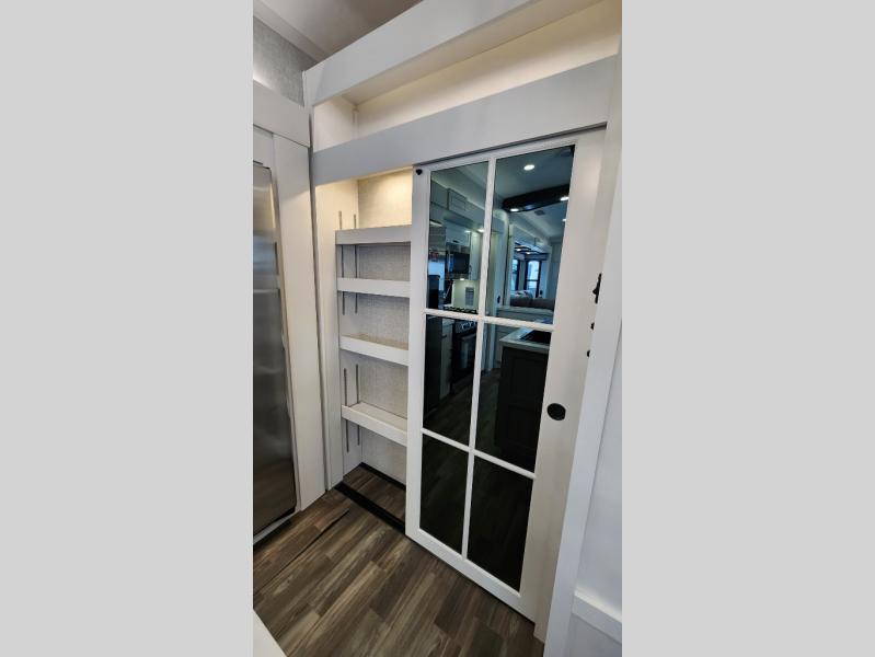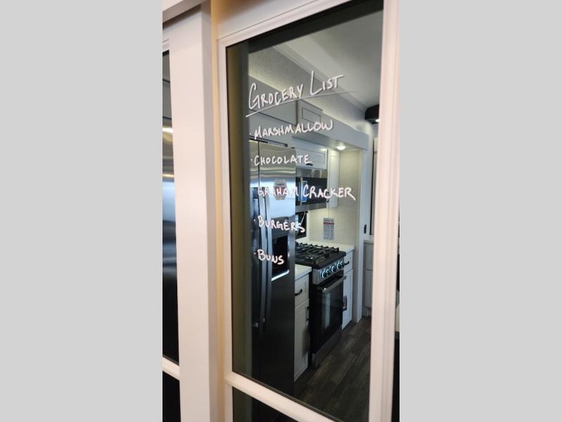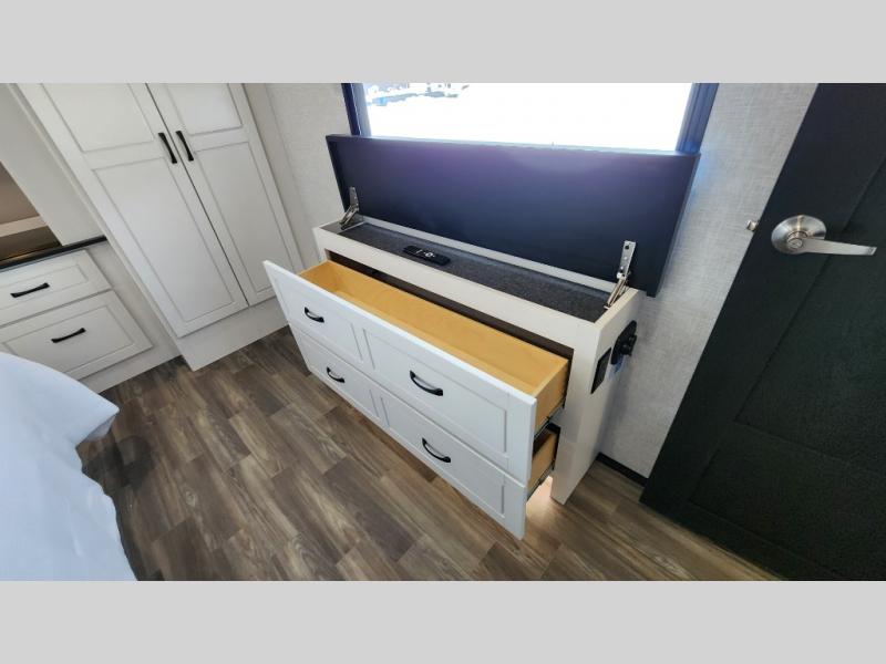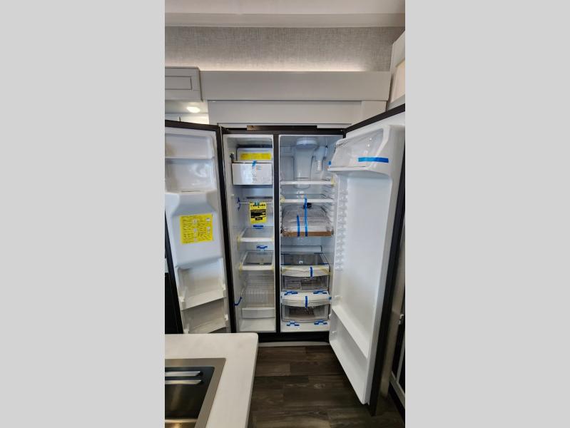 Prepare for great adventures in this fifth wheel! The rear living area features a massive L-shaped sofa which includes a hide-a-bed as well as recliner seats! Plus there's an additional set of theater seats all facing the entertainment center with a fireplace and 50" Smart TV. A flexible desk/coffee bar connects the living room to the kitchen so you can work or relax as needed. Meals will be easy to prepare with the island with sink and pull-out cutting board, plus pantry, microwave, and residential refrigerator. Up front you will find the private bedroom with its king bed, closet with drawers and hamper, and even a second TV. The full bath features a shower with seat and a linen closet for convenient storage. Outside you'll find a pair of awnings and a pull-out griddle.