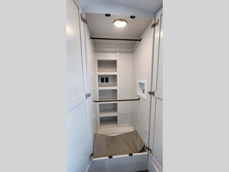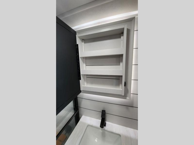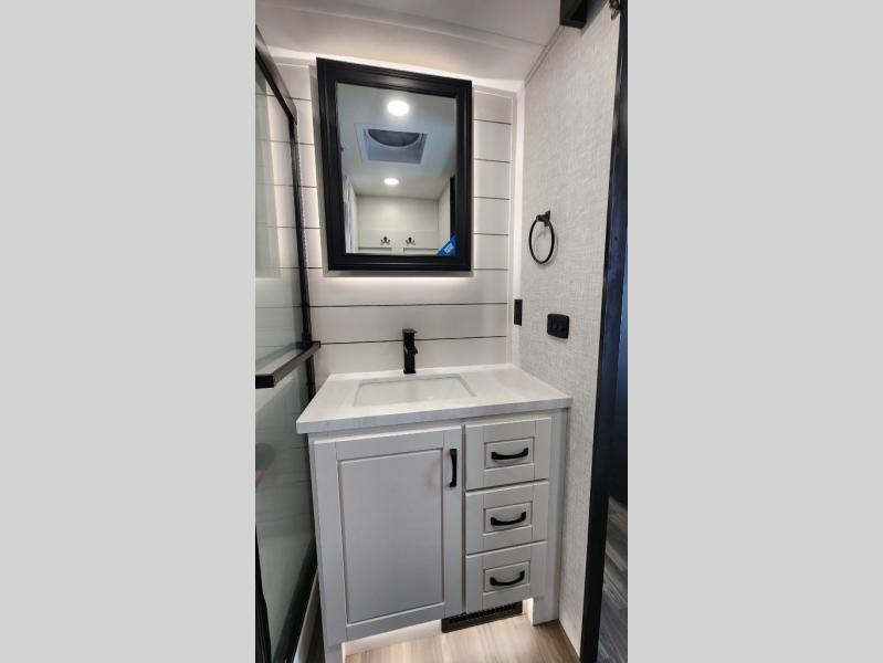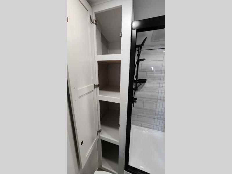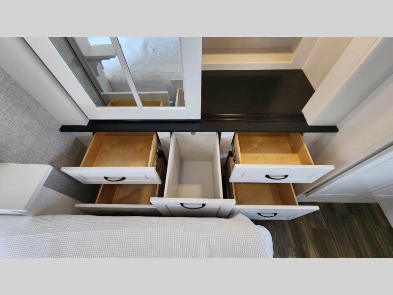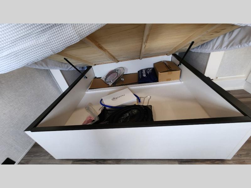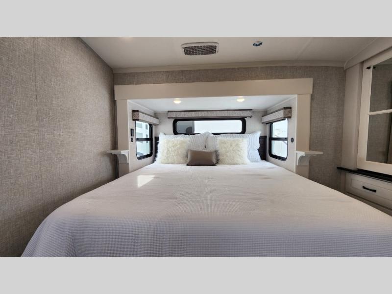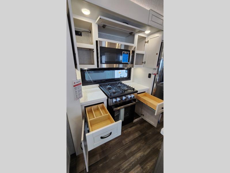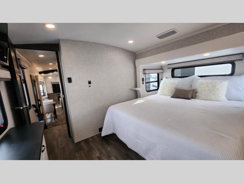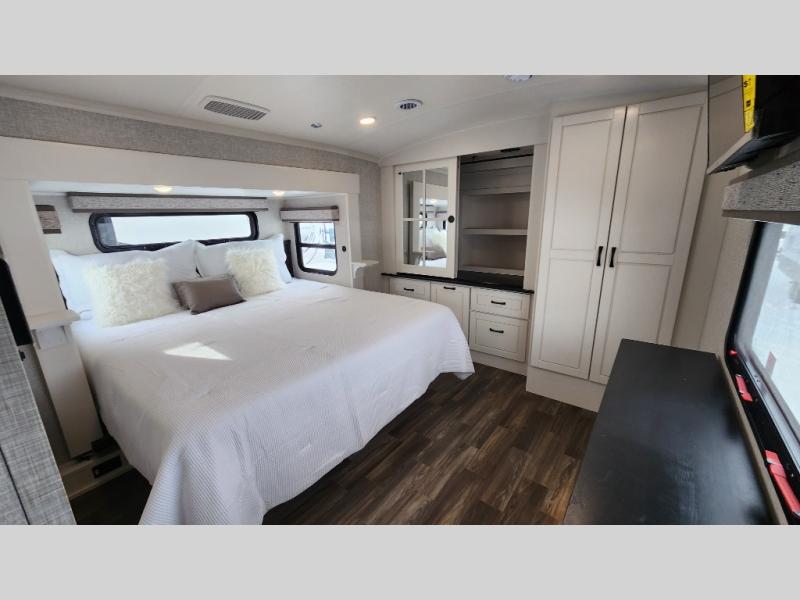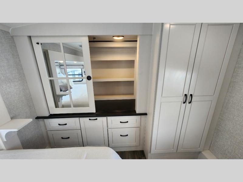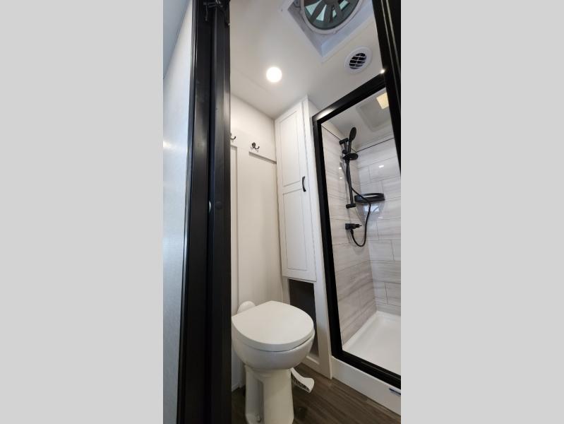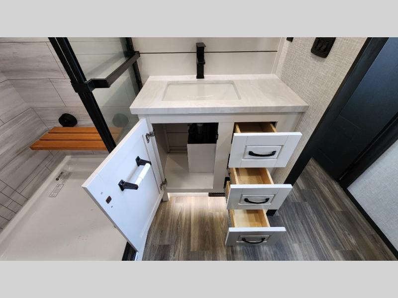 Prepare for great adventures in this fifth wheel! The rear living area features a massive L-shaped sofa which includes a hide-a-bed as well as recliner seats! Plus there's an additional set of theater seats all facing the entertainment center with a fireplace and 50" Smart TV. A flexible desk/coffee bar connects the living room to the kitchen so you can work or relax as needed. Meals will be easy to prepare with the island with sink and pull-out cutting board, plus pantry, microwave, and residential refrigerator. Up front you will find the private bedroom with its king bed, closet with drawers and hamper, and even a second TV. The full bath features a shower with seat and a linen closet for convenient storage. Outside you'll find a pair of awnings and a pull-out griddle.