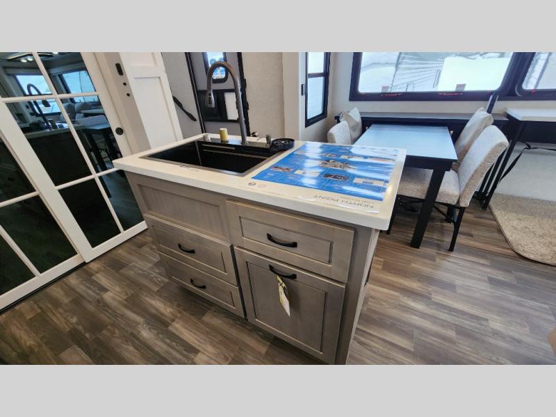 With any North Point fifth wheel by Jayco you begin with a strong foundation with a custom frame, designed and sized specifically to best support each unit. Constructed with Stronghold VBL™ aluminum framed, vacuum bond laminated walls and the Magnum Truss™ XL6™ roof system with a one-piece, seamless roof material, which is the strongest tested roof in the industry. The 5-Star Handling package is included with Uniroyal tires, a MORryde rubber pin box, Dexter axles with Nev-R-Adjust brakes, MORryde CRE-3000 rubberized suspension and wet bolt fasteners and bronze bushings. The interior has handcrafted hardwood glazed doors and drawers, vinyl flooring throughout, an integrated under-mount sink in the main bathroom, plus so much more you just have to see one to believe it all!