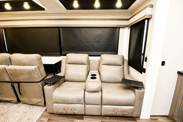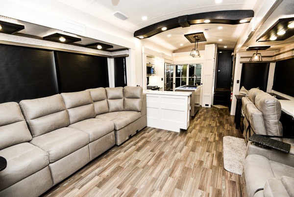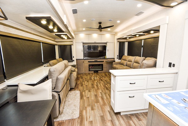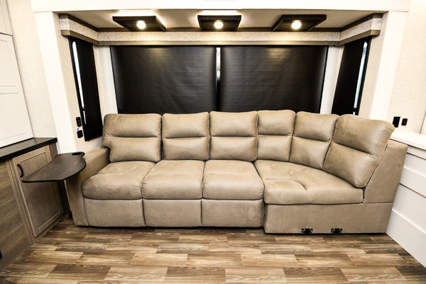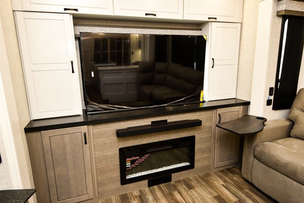 Prepare for great adventures in this fifth wheel! The rear living area features a massive L-shaped sofa which includes a hide-a-bed as well as recliner seats! Plus there's an additional set of theater seats all facing the entertainment center with a fireplace and 50" Smart TV. A flexible desk/coffee bar connects the living room to the kitchen so you can work or relax as needed. Meals will be easy to prepare with the island with sink and pull-out cutting board, plus pantry, microwave, and residential refrigerator. Up front you will find the private bedroom with its king bed, closet with drawers and hamper, and even a second TV. The full bath features a shower with seat and a linen closet for convenient storage. Outside you'll find a pair of awnings and a pull-out griddle.