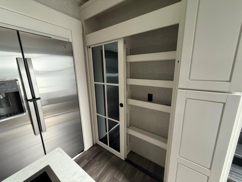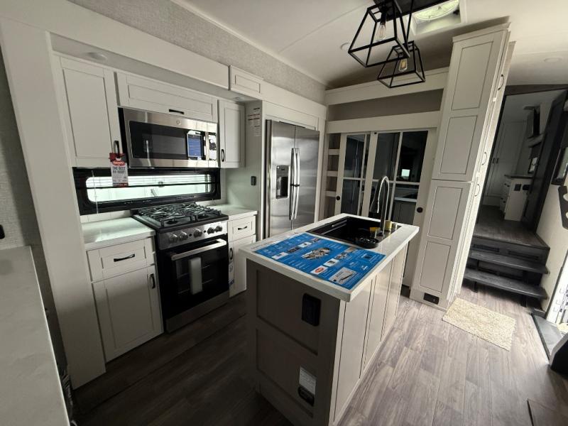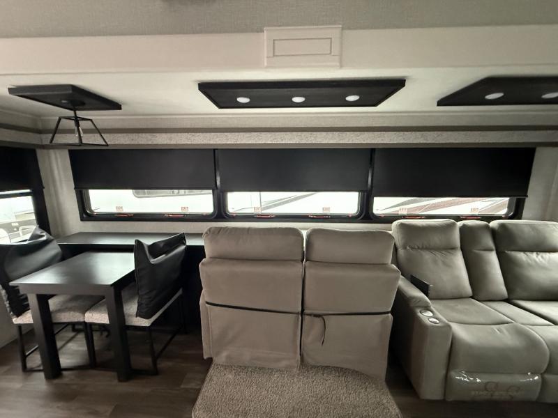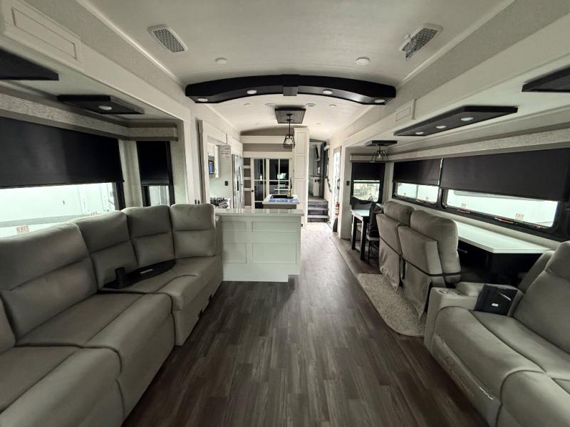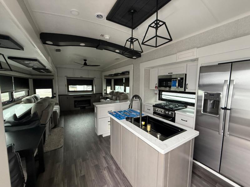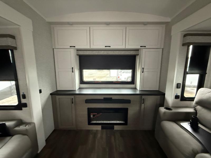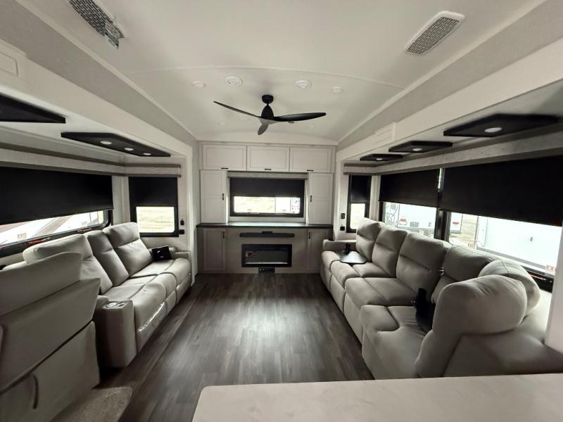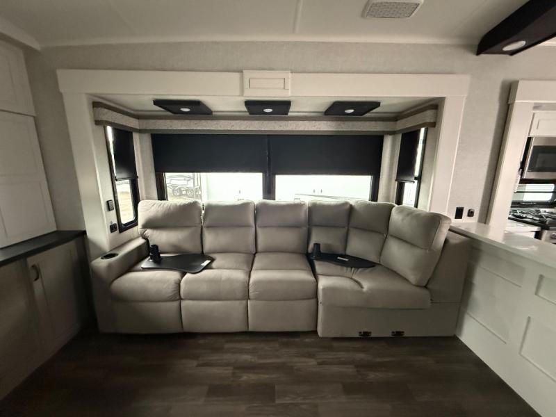 Prepare for great adventures in this fifth wheel! The rear living area features a massive L-shaped sofa which includes a hide-a-bed as well as recliner seats! Plus there's an additional set of theater seats all facing the entertainment center with a fireplace and 50" Smart TV. A flexible desk/coffee bar connects the living room to the kitchen so you can work or relax as needed. Meals will be easy to prepare with the island with sink and pull-out cutting board, plus pantry, microwave, and residential refrigerator. Up front you will find the private bedroom with its king bed, closet with drawers and hamper, and even a second TV. The full bath features a shower with seat and a linen closet for convenient storage. Outside you'll find a pair of awnings and a pull-out griddle.
