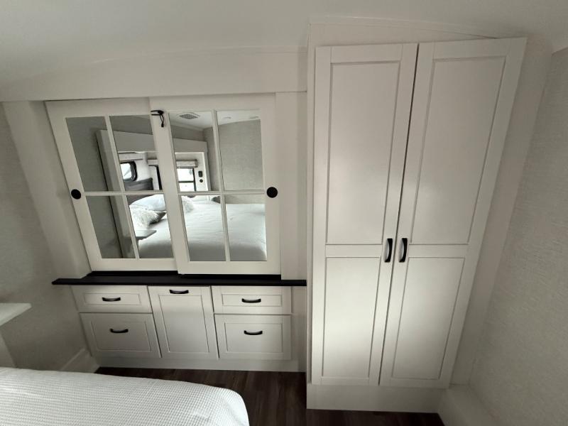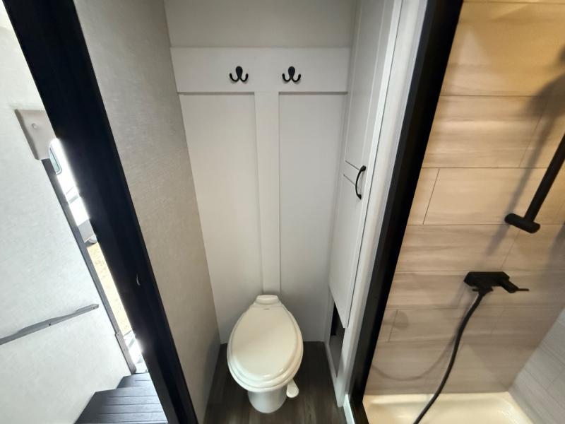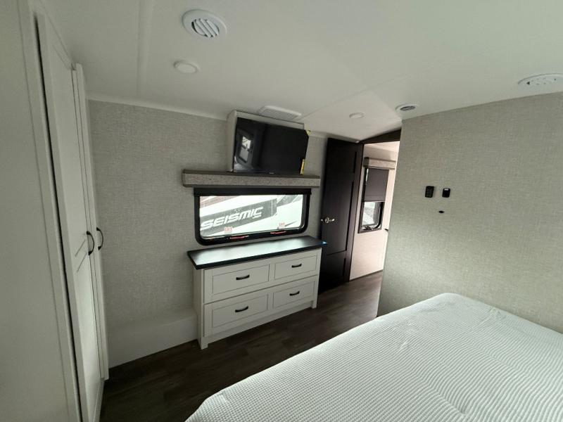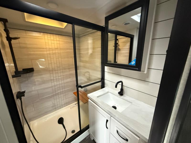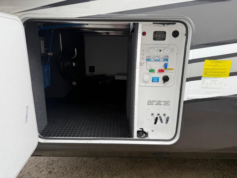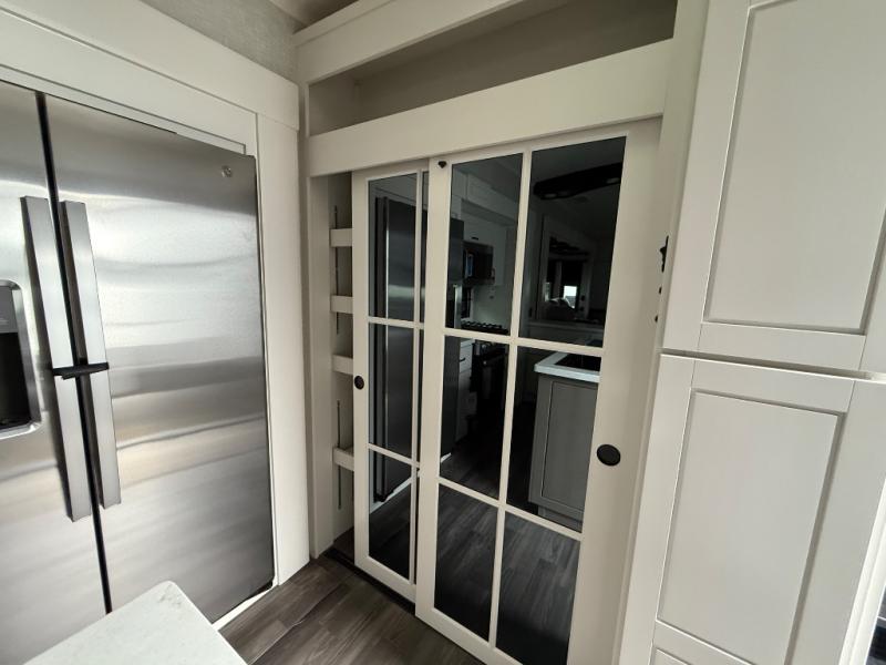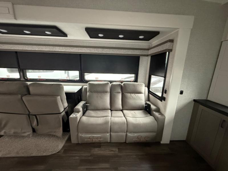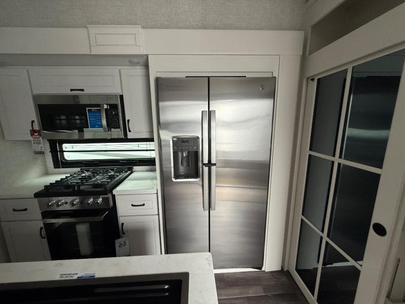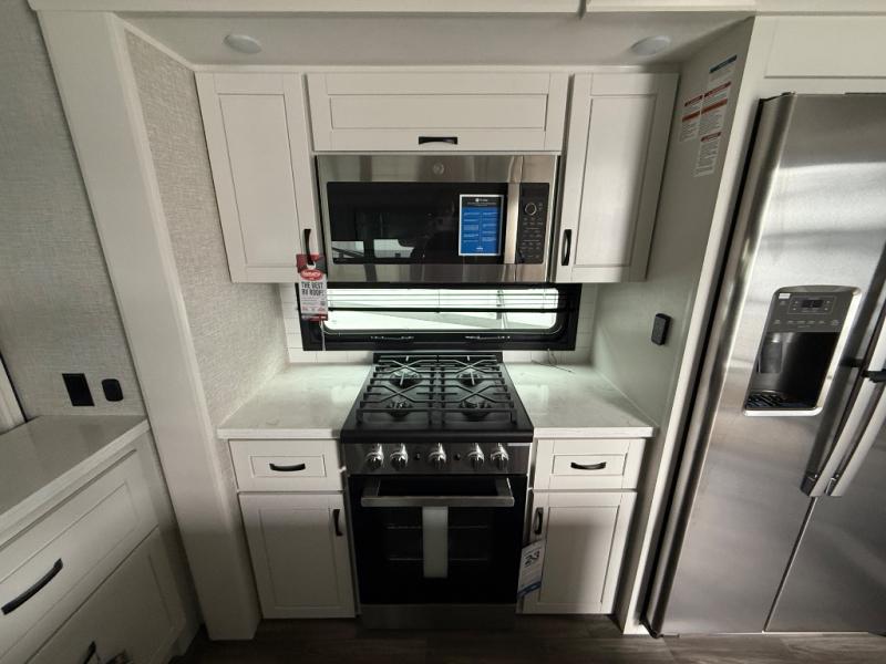Prepare for great adventures in this fifth wheel! The rear living area features a massive L-shaped sofa which includes a hide-a-bed as well as recliner seats! Plus there's an additional set of theater seats all facing the entertainment center with a fireplace and 50" Smart TV. A flexible desk/coffee bar connects the living room to the kitchen so you can work or relax as needed. Meals will be easy to prepare with the island with sink and pull-out cutting board, plus pantry, microwave, and residential refrigerator. Up front you will find the private bedroom with its king bed, closet with drawers and hamper, and even a second TV. The full bath features a shower with seat and a linen closet for convenient storage. Outside you'll find a pair of awnings and a pull-out griddle.