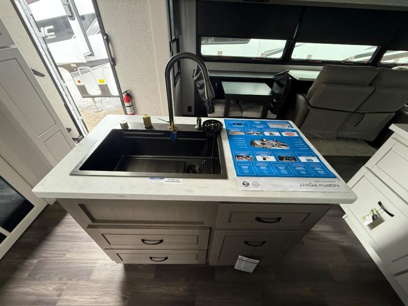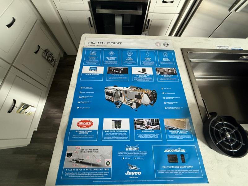With any North Point fifth wheel by Jayco you begin with a strong foundation with a custom frame, designed and sized specifically to best support each unit. Constructed with Stronghold VBL™ aluminum framed, vacuum bond laminated walls and the Magnum Truss™ XL6™ roof system with a one-piece, seamless roof material, which is the strongest tested roof in the industry. The 5-Star Handling package is included with Uniroyal tires, a MORryde rubber pin box, Dexter axles with Nev-R-Adjust brakes, MORryde CRE-3000 rubberized suspension and wet bolt fasteners and bronze bushings. The interior has handcrafted hardwood glazed doors and drawers, vinyl flooring throughout, an integrated under-mount sink in the main bathroom, plus so much more you just have to see one to believe it all!