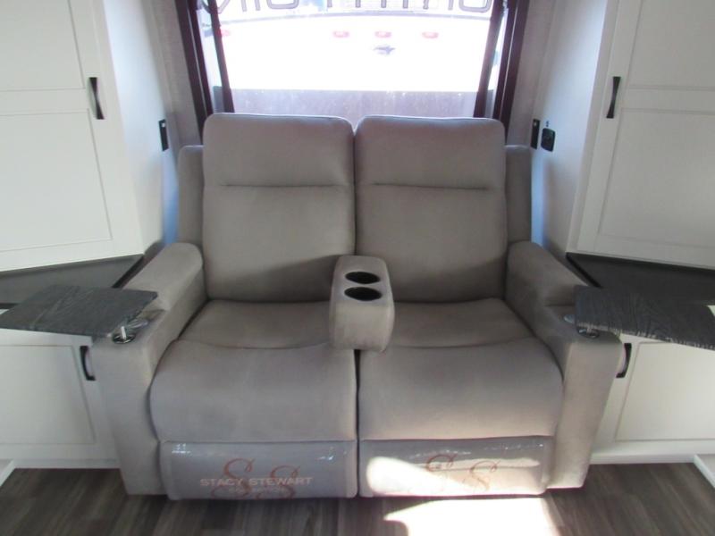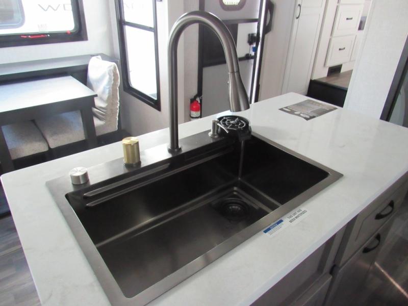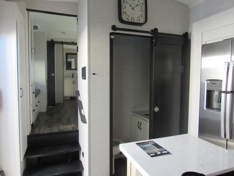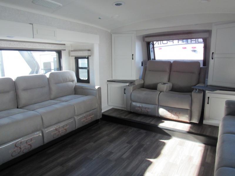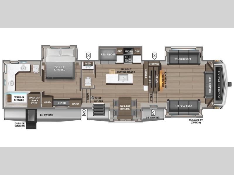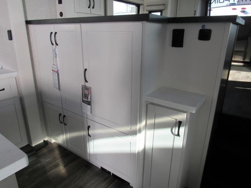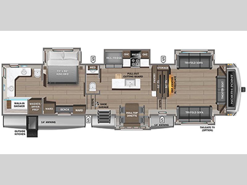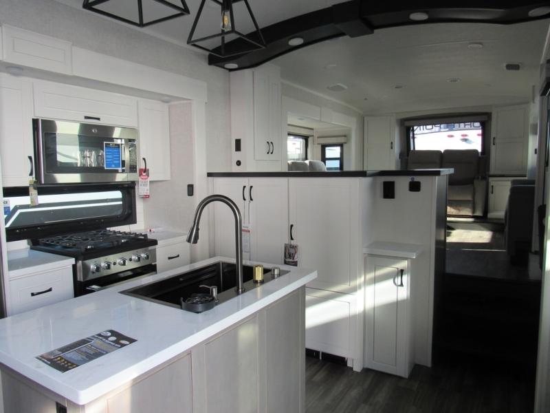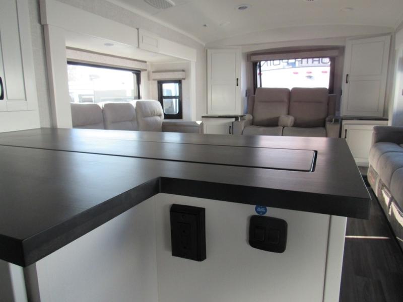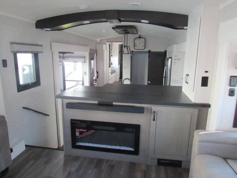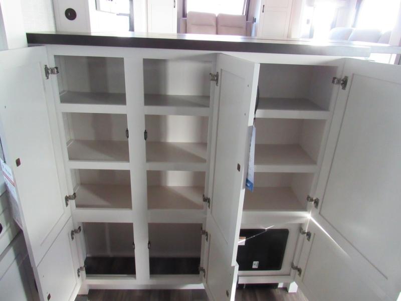 Entertainment can be found throughout this fifth wheel from the front living area with a 50" Smart LED HDTV with fully digital HDMI output and home entertainment system with subwoofer including a fireplace below that you can enjoy while relaxing on theater seats and two tri-fold sofas, a 32" TV in the middle kitchen and there is a bedroom 32" TV. You might even like to add the tailgate TV option along the exterior. Back inside the kitchen, the cook will love the center island, the pantry, the residential refrigerator, and the roll-top dinette. The half bath is a few steps away as an added convenience. The master bedroom includes a king bed slide, a bench, two wardrobes and a sliding door into the bathroom which offers two sinks, a space prepped for a washer/dryer option, and a walk-in shower. And don't forget about the exterior features such as the outside kitchen for more choices when making meals, the storage for your outdoor gear and chairs, and two awnings with integrated LED lighting.