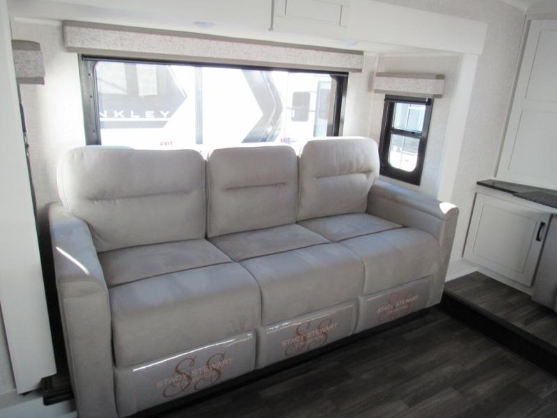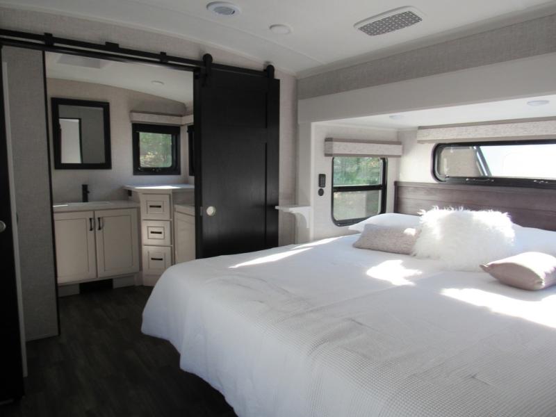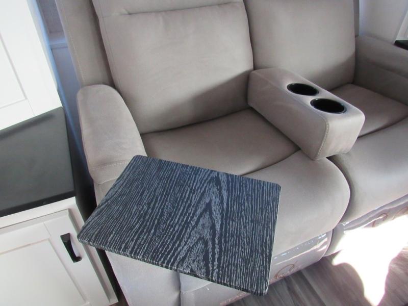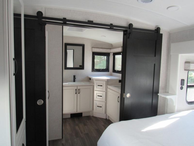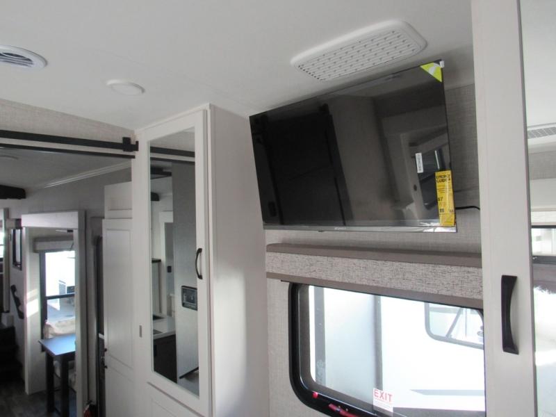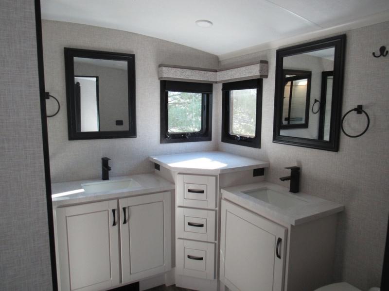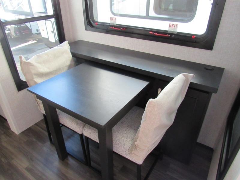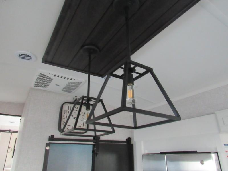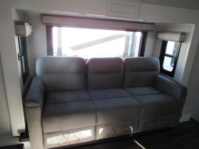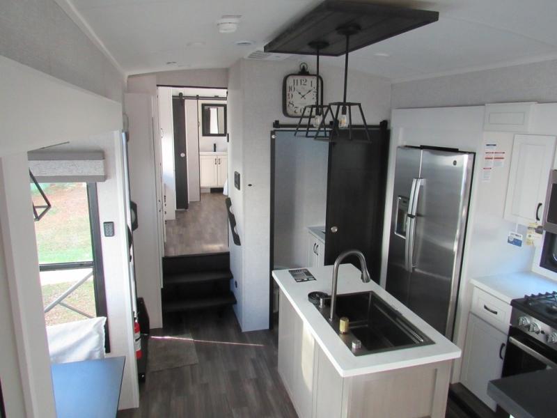 Entertainment can be found throughout this fifth wheel from the front living area with a 50" Smart LED HDTV with fully digital HDMI output and home entertainment system with subwoofer including a fireplace below that you can enjoy while relaxing on theater seats and two tri-fold sofas, a 32" TV in the middle kitchen and there is a bedroom 32" TV. You might even like to add the tailgate TV option along the exterior. Back inside the kitchen, the cook will love the center island, the pantry, the residential refrigerator, and the roll-top dinette. The half bath is a few steps away as an added convenience. The master bedroom includes a king bed slide, a bench, two wardrobes and a sliding door into the bathroom which offers two sinks, a space prepped for a washer/dryer option, and a walk-in shower. And don't forget about the exterior features such as the outside kitchen for more choices when making meals, the storage for your outdoor gear and chairs, and two awnings with integrated LED lighting.