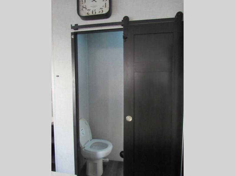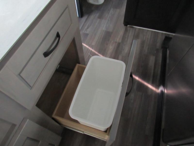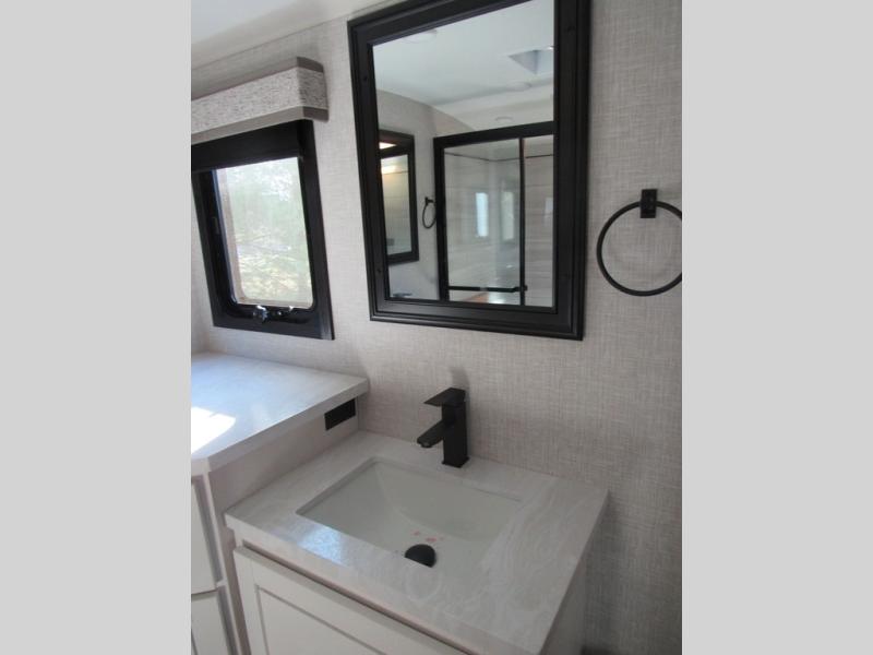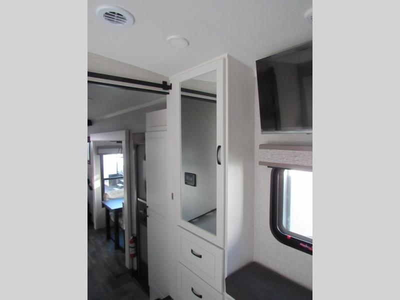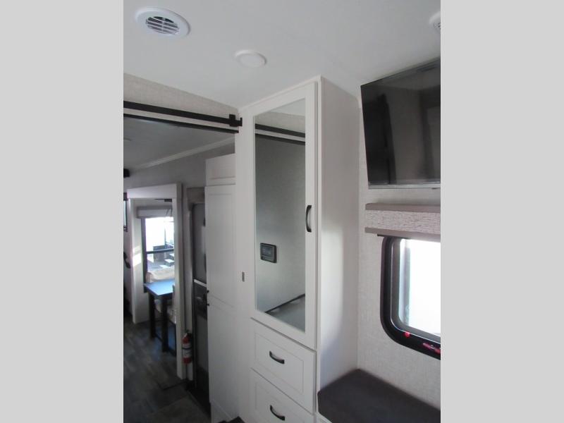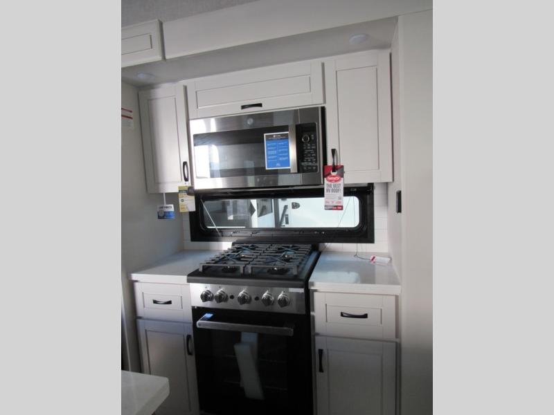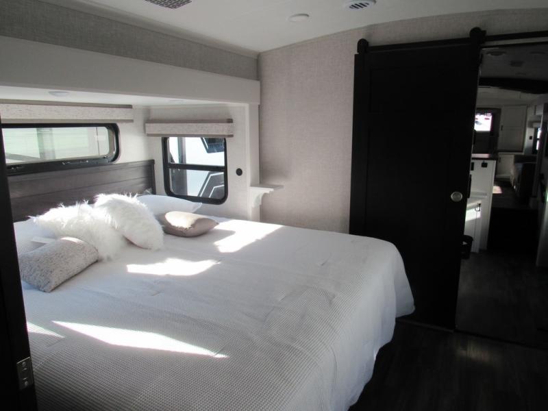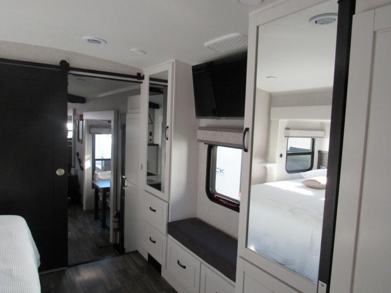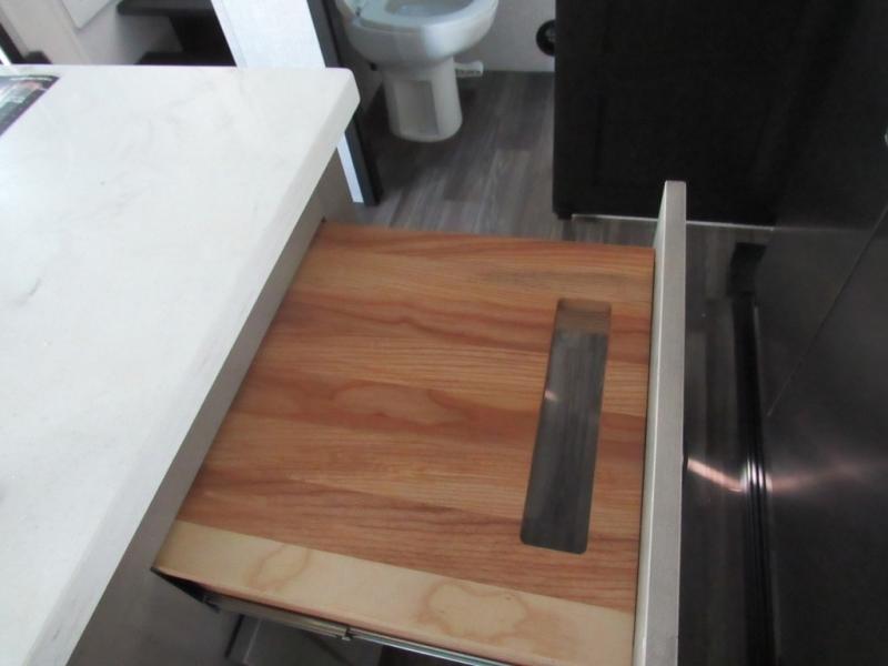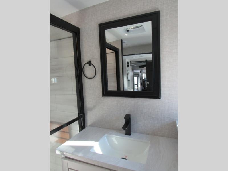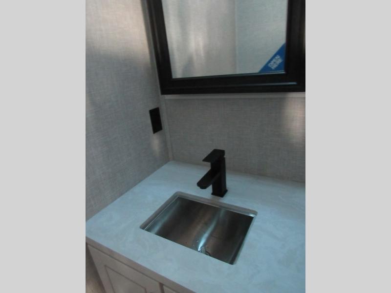Entertainment can be found throughout this fifth wheel from the front living area with a 50" Smart LED HDTV with fully digital HDMI output and home entertainment system with subwoofer including a fireplace below that you can enjoy while relaxing on theater seats and two tri-fold sofas, a 32" TV in the middle kitchen and there is a bedroom 32" TV. You might even like to add the tailgate TV option along the exterior. Back inside the kitchen, the cook will love the center island, the pantry, the residential refrigerator, and the roll-top dinette. The half bath is a few steps away as an added convenience. The master bedroom includes a king bed slide, a bench, two wardrobes and a sliding door into the bathroom which offers two sinks, a space prepped for a washer/dryer option, and a walk-in shower. And don't forget about the exterior features such as the outside kitchen for more choices when making meals, the storage for your outdoor gear and chairs, and two awnings with integrated LED lighting.