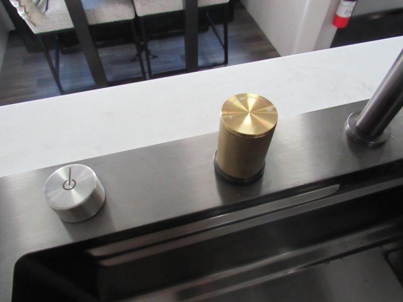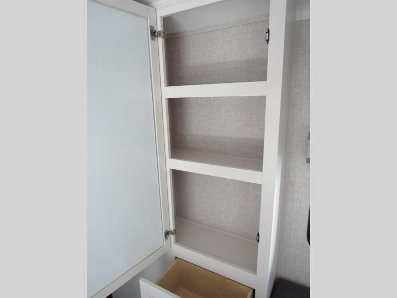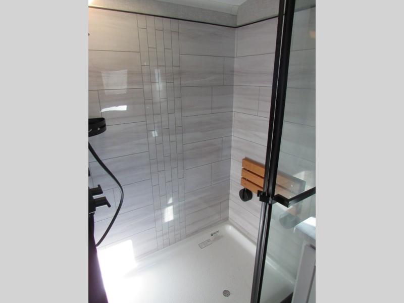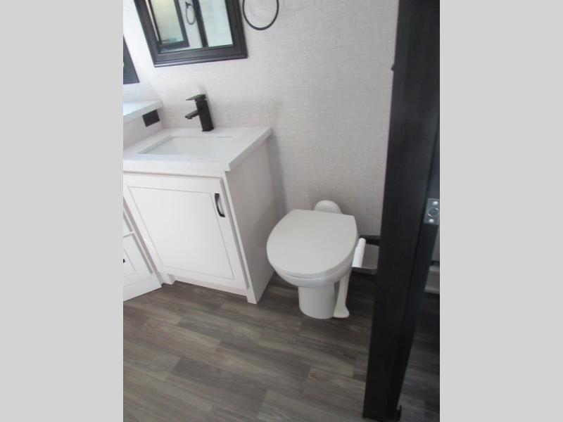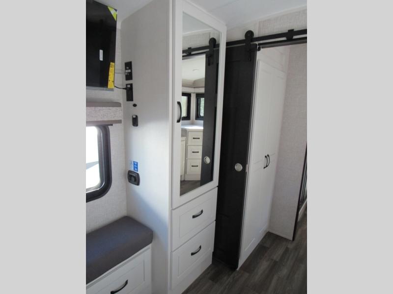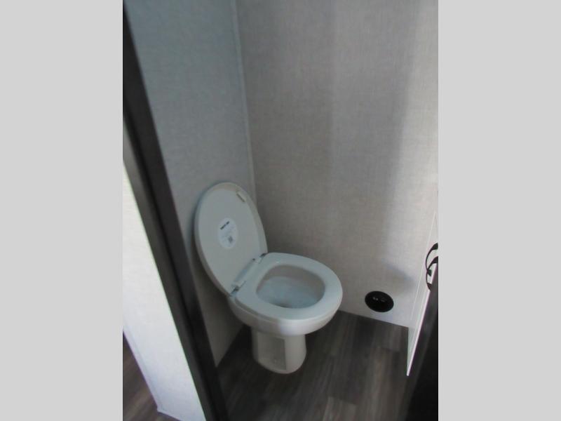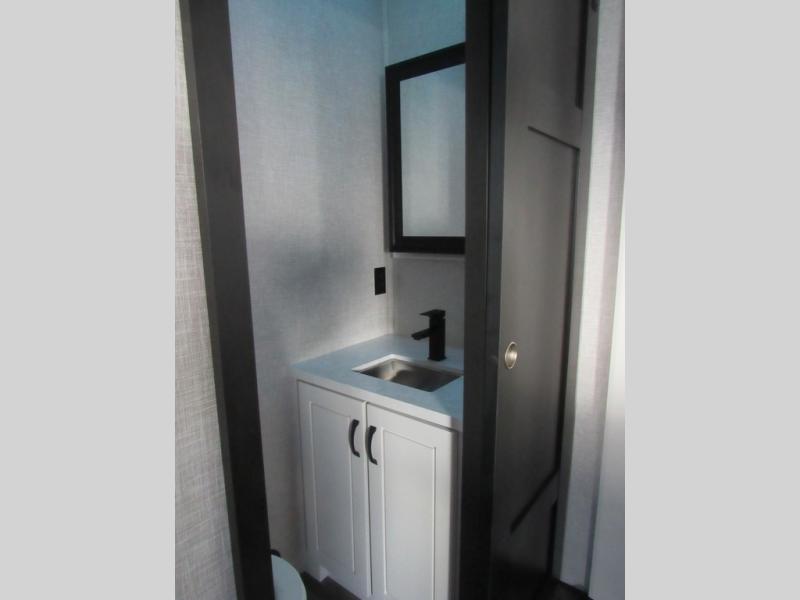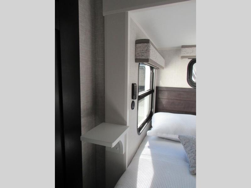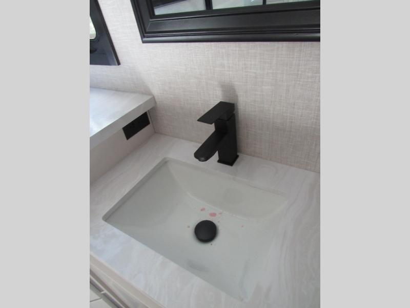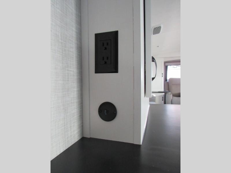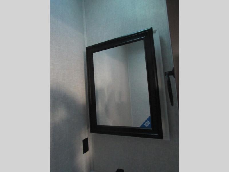 Entertainment can be found throughout this fifth wheel from the front living area with a 50" Smart LED HDTV with fully digital HDMI output and home entertainment system with subwoofer including a fireplace below that you can enjoy while relaxing on theater seats and two tri-fold sofas, a 32" TV in the middle kitchen and there is a bedroom 32" TV. You might even like to add the tailgate TV option along the exterior. Back inside the kitchen, the cook will love the center island, the pantry, the residential refrigerator, and the roll-top dinette. The half bath is a few steps away as an added convenience. The master bedroom includes a king bed slide, a bench, two wardrobes and a sliding door into the bathroom which offers two sinks, a space prepped for a washer/dryer option, and a walk-in shower. And don't forget about the exterior features such as the outside kitchen for more choices when making meals, the storage for your outdoor gear and chairs, and two awnings with integrated LED lighting.