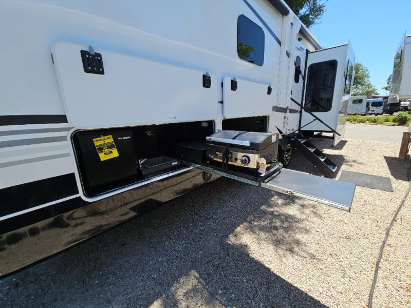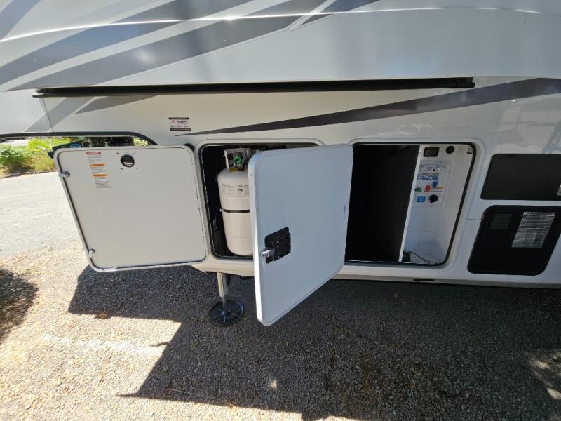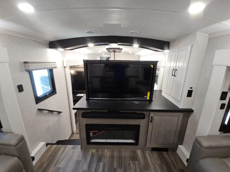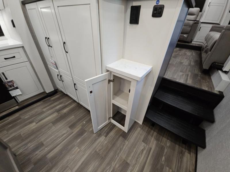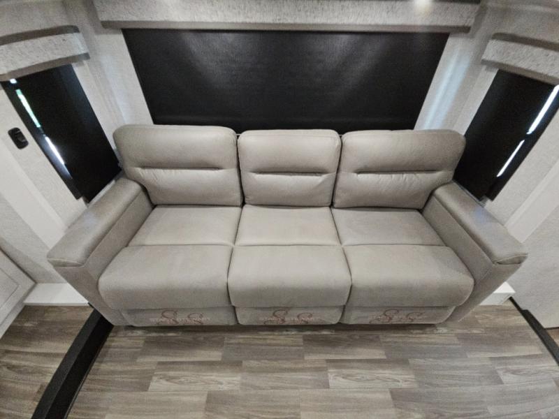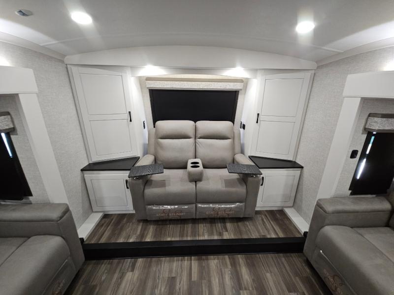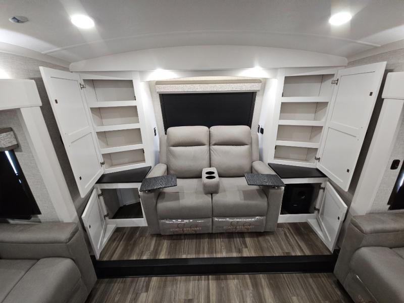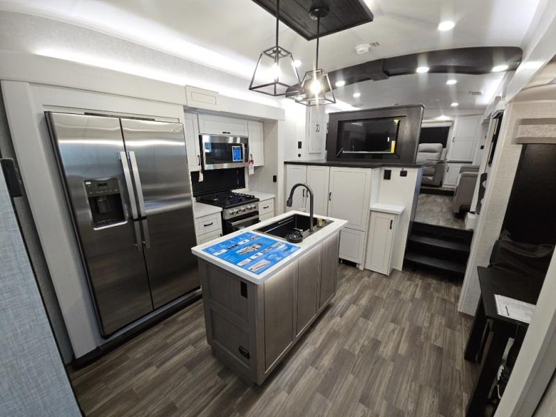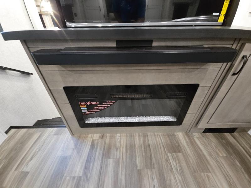 Entertainment can be found throughout this fifth wheel from the front living area with a 50" Smart LED HDTV with fully digital HDMI output and home entertainment system with subwoofer including a fireplace below that you can enjoy while relaxing on theater seats and two tri-fold sofas, a 32" TV in the middle kitchen and there is a bedroom 32" TV. You might even like to add the tailgate TV option along the exterior. Back inside the kitchen, the cook will love the center island, the pantry, the residential refrigerator, and the roll-top dinette. The half bath is a few steps away as an added convenience. The master bedroom includes a king bed slide, a bench, two wardrobes and a sliding door into the bathroom which offers two sinks, a space prepped for a washer/dryer option, and a walk-in shower. And don't forget about the exterior features such as the outside kitchen for more choices when making meals, the storage for your outdoor gear and chairs, and two awnings with integrated LED lighting.