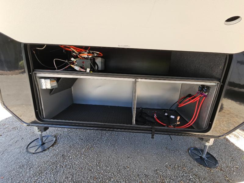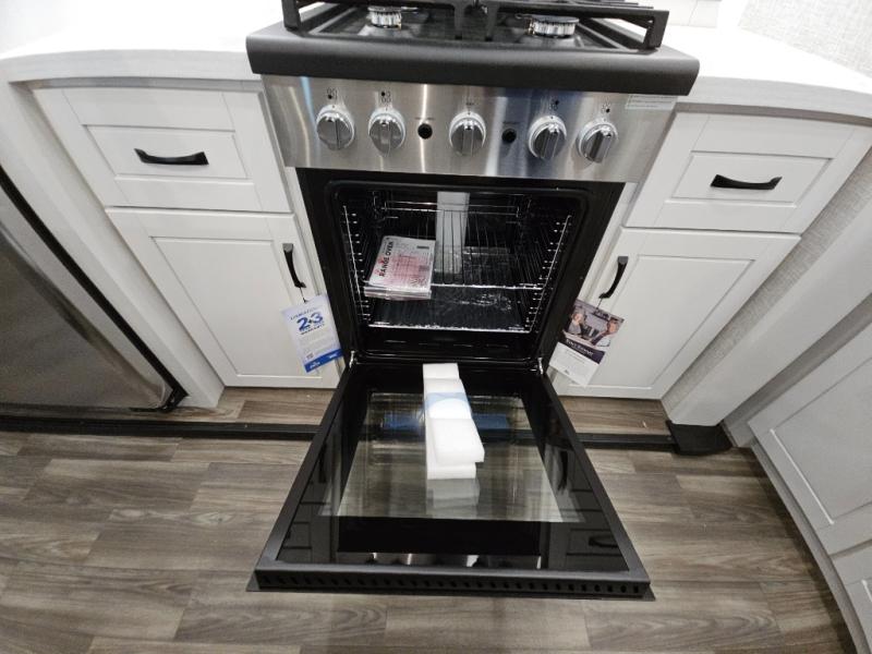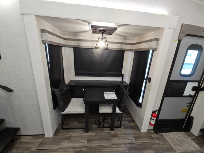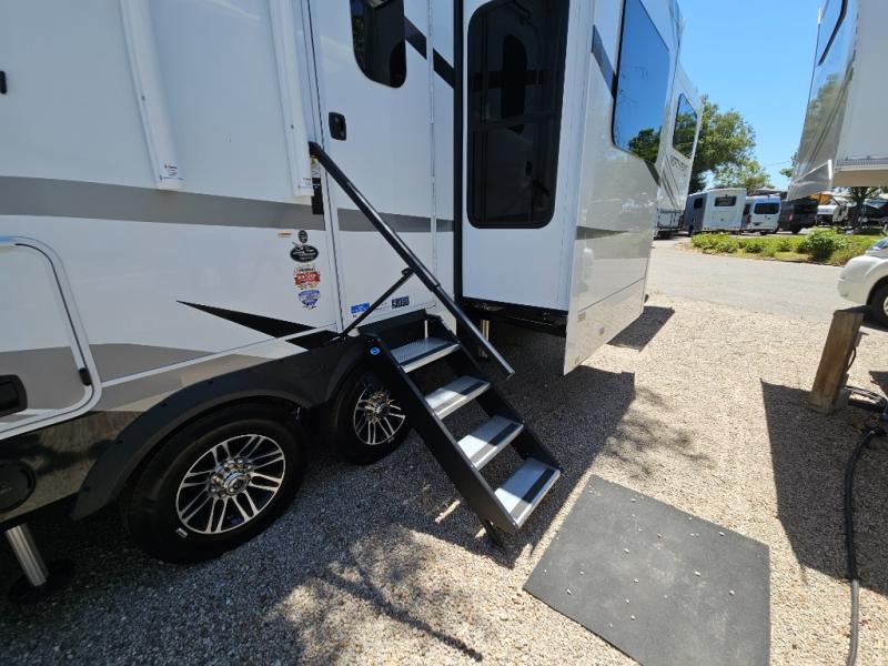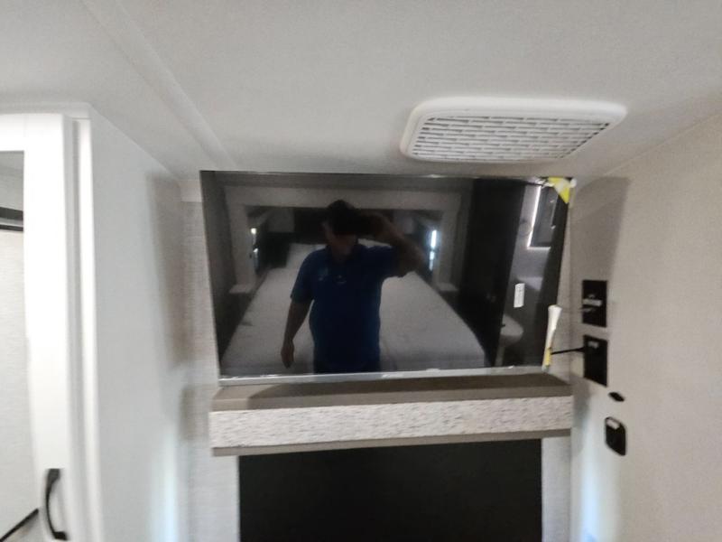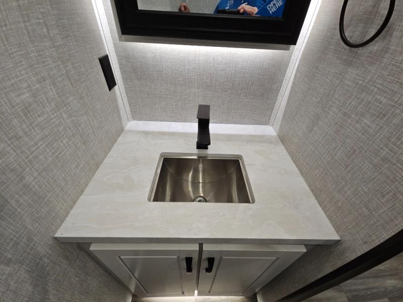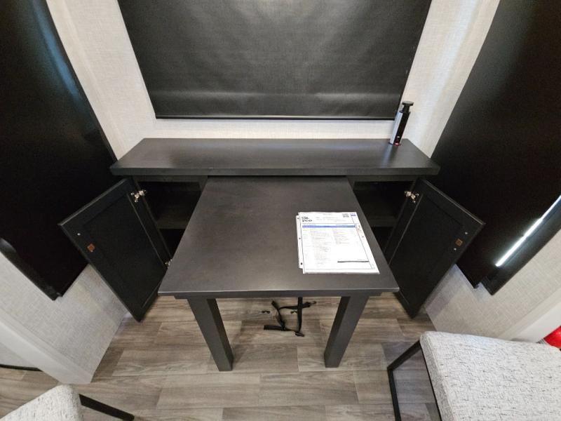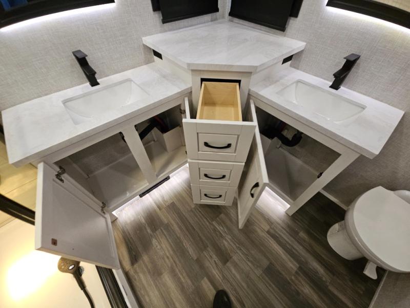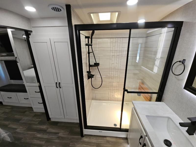 Entertainment can be found throughout this fifth wheel from the front living area with a 50" Smart LED HDTV with fully digital HDMI output and home entertainment system with subwoofer including a fireplace below that you can enjoy while relaxing on theater seats and two tri-fold sofas, a 32" TV in the middle kitchen and there is a bedroom 32" TV. You might even like to add the tailgate TV option along the exterior. Back inside the kitchen, the cook will love the center island, the pantry, the residential refrigerator, and the roll-top dinette. The half bath is a few steps away as an added convenience. The master bedroom includes a king bed slide, a bench, two wardrobes and a sliding door into the bathroom which offers two sinks, a space prepped for a washer/dryer option, and a walk-in shower. And don't forget about the exterior features such as the outside kitchen for more choices when making meals, the storage for your outdoor gear and chairs, and two awnings with integrated LED lighting.