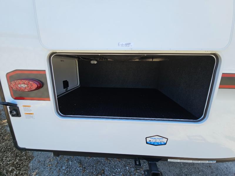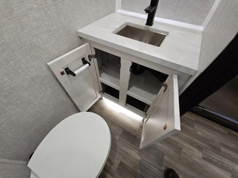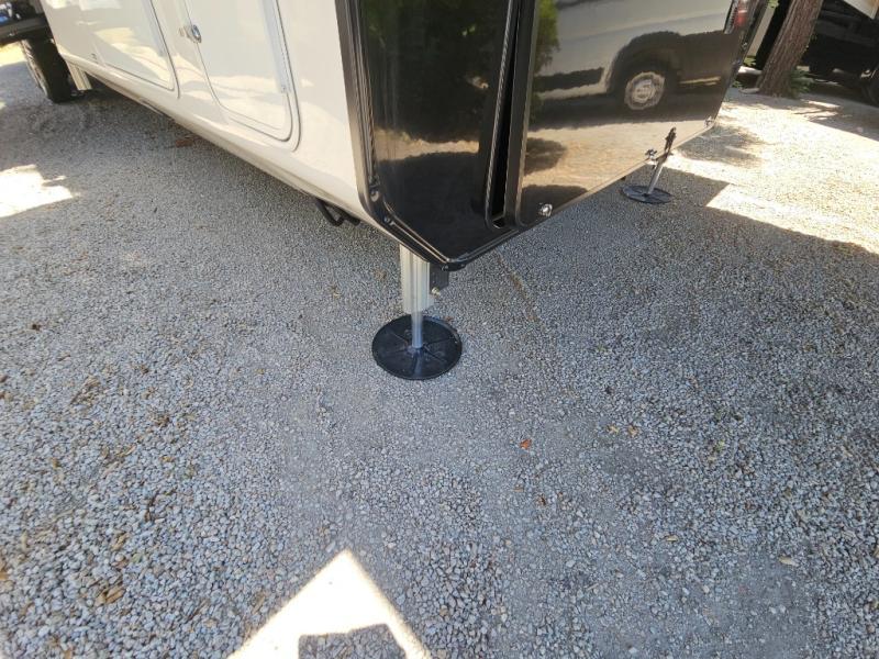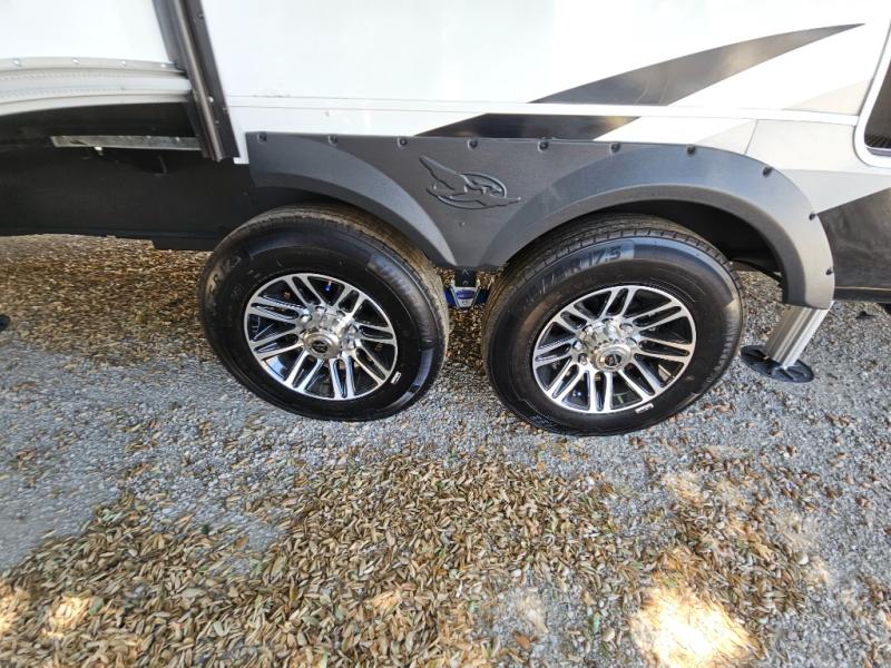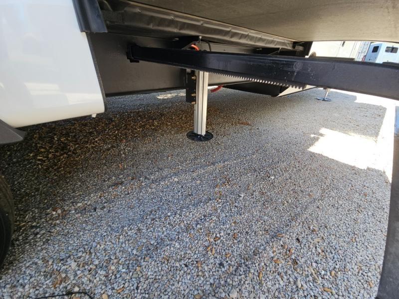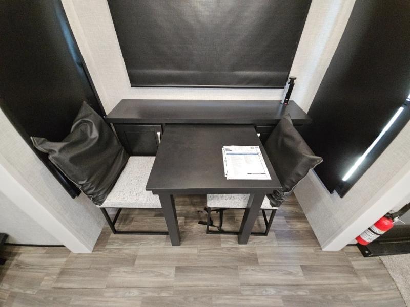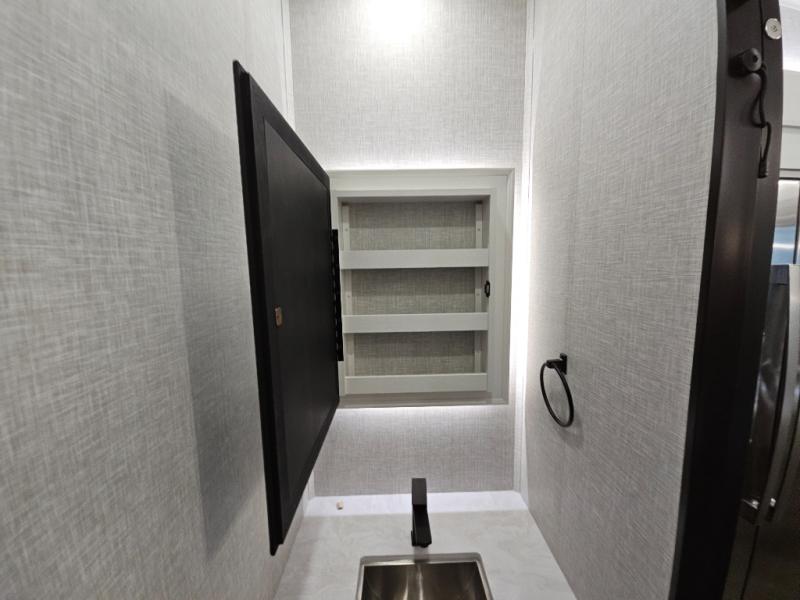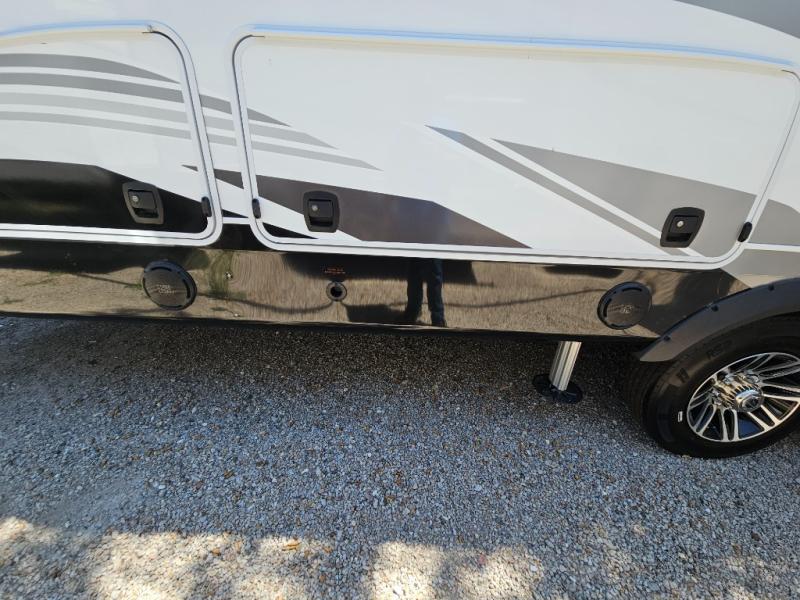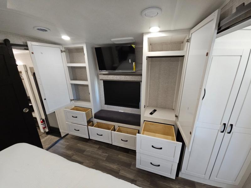 Entertainment can be found throughout this fifth wheel from the front living area with a 50" Smart LED HDTV with fully digital HDMI output and home entertainment system with subwoofer including a fireplace below that you can enjoy while relaxing on theater seats and two tri-fold sofas, a 32" TV in the middle kitchen and there is a bedroom 32" TV. You might even like to add the tailgate TV option along the exterior. Back inside the kitchen, the cook will love the center island, the pantry, the residential refrigerator, and the roll-top dinette. The half bath is a few steps away as an added convenience. The master bedroom includes a king bed slide, a bench, two wardrobes and a sliding door into the bathroom which offers two sinks, a space prepped for a washer/dryer option, and a walk-in shower. And don't forget about the exterior features such as the outside kitchen for more choices when making meals, the storage for your outdoor gear and chairs, and two awnings with integrated LED lighting.