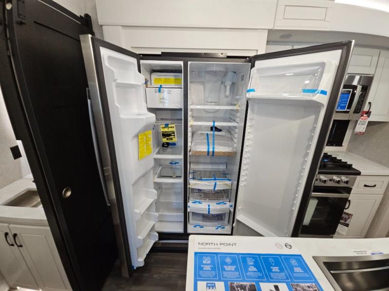 With any North Point fifth wheel by Jayco you begin with a strong foundation with a custom frame, designed and sized specifically to best support each unit. Constructed with Stronghold VBL™ aluminum framed, vacuum bond laminated walls and the Magnum Truss™ XL6™ roof system with a one-piece, seamless roof material which is the strongest tested roof in the industry. The 5-Star Handling package is included with Uniroyal tires, a MORryde rubber pin box, Dexter axles with Nev-R-Adjust brakes, MORryde CRE-3000 rubberized suspension and wet bolt fasteners and bronze bushings. The interior has handcrafted hardwood glazed doors and drawers, vinyl flooring throughout, an integrated under-mount sink in the main bathroom, plus so much more you just have to see one to believe it all!