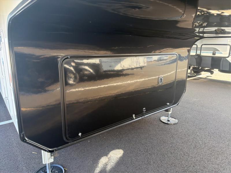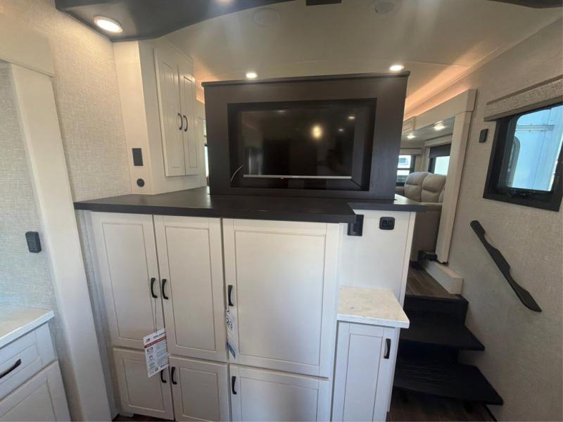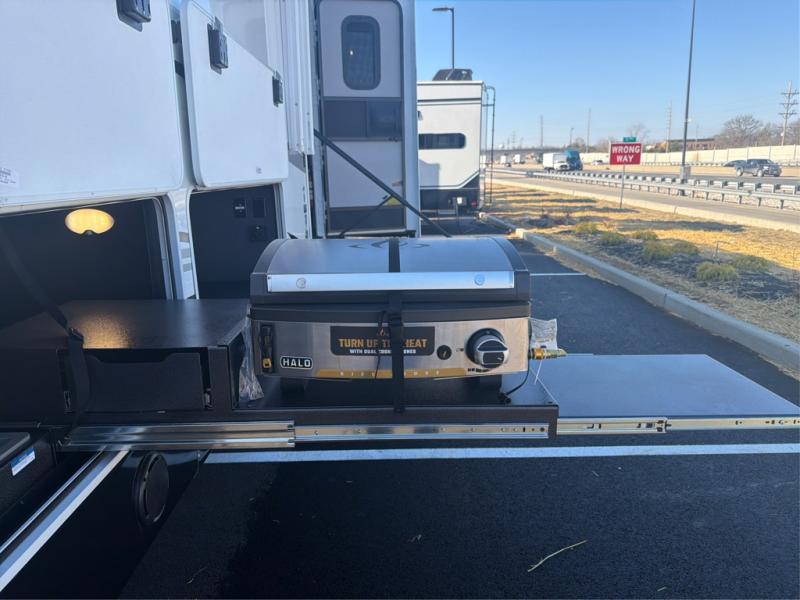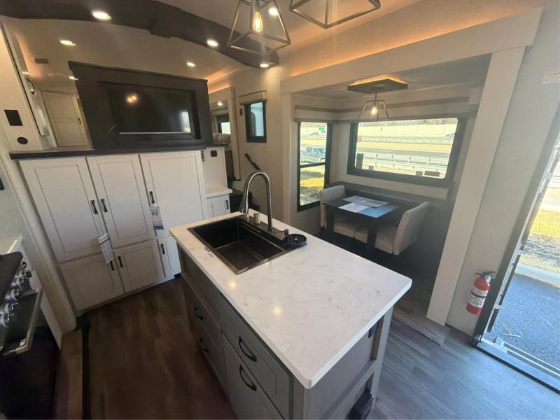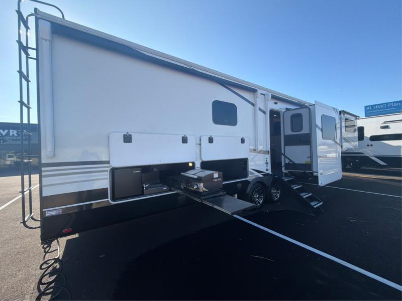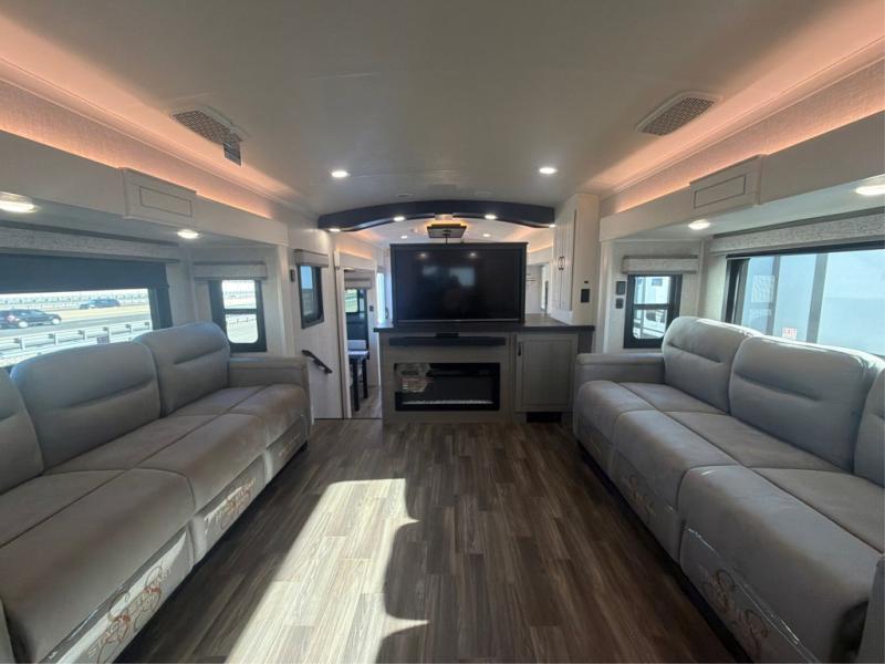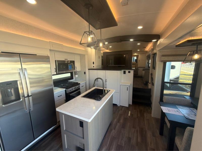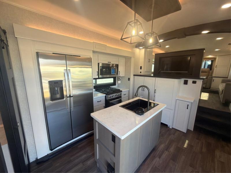Entertainment can be found throughout this fifth wheel from the front living area with a 50" Smart LED HDTV with fully digital HDMI output and home entertainment system with subwoofer including a fireplace below that you can enjoy while relaxing on theater seats and two tri-fold sofas, a 32" TV in the middle kitchen and there is a bedroom 32" TV. You might even like to add the tailgate TV option along the exterior. Back inside the kitchen, the cook will love the center island, the pantry, the residential refrigerator, and the roll-top dinette. The half bath is a few steps away as an added convenience. The master bedroom includes a king bed slide, a bench, two wardrobes and a sliding door into the bathroom which offers two sinks, a space prepped for a washer/dryer option, and a walk-in shower. And don't forget about the exterior features such as the outside kitchen for more choices when making meals, the storage for your outdoor gear and chairs, and two awnings with integrated LED lighting.