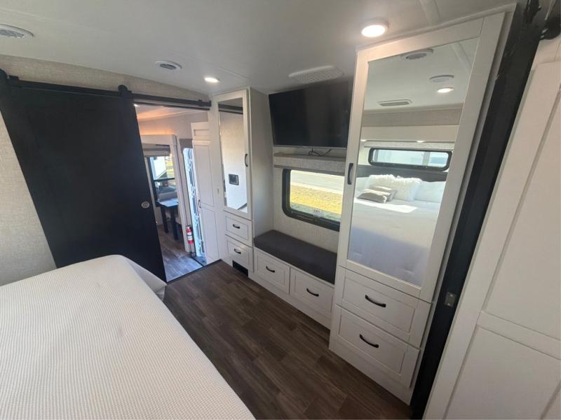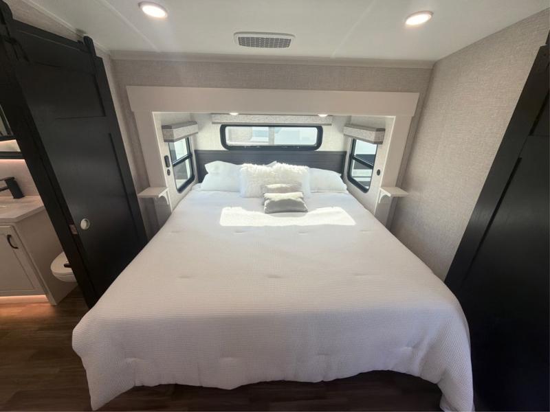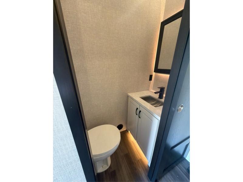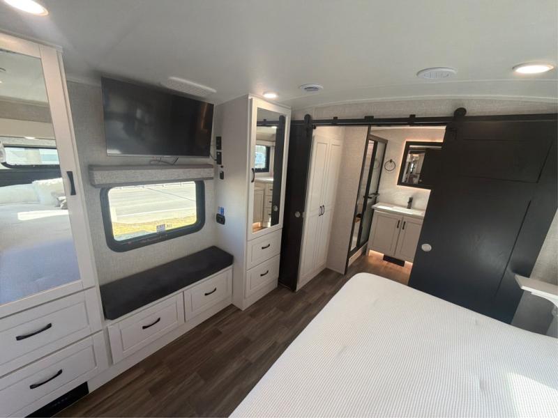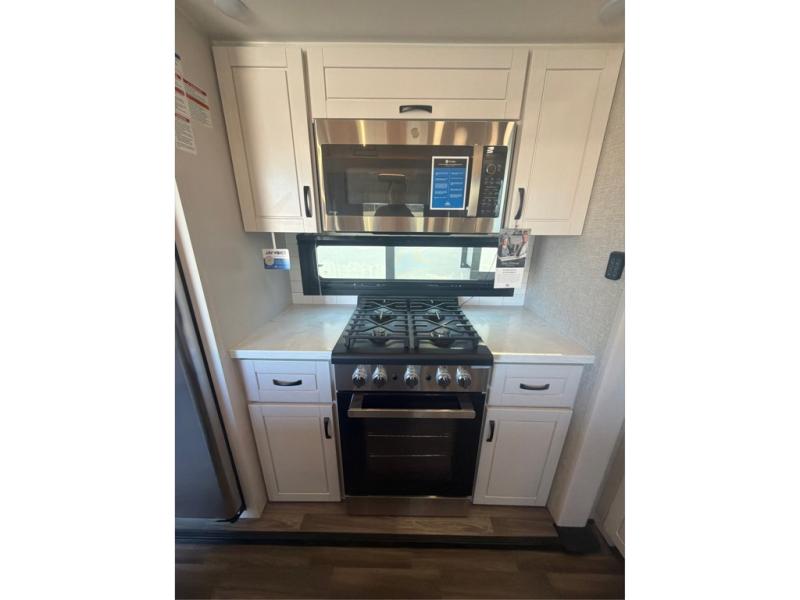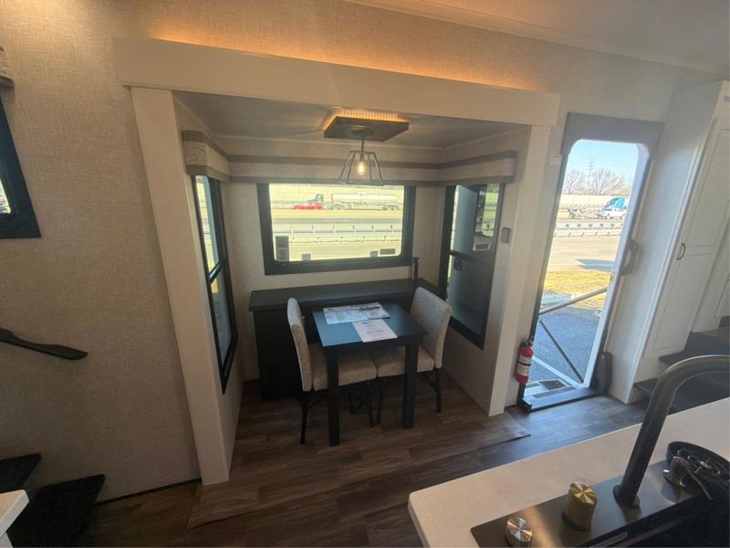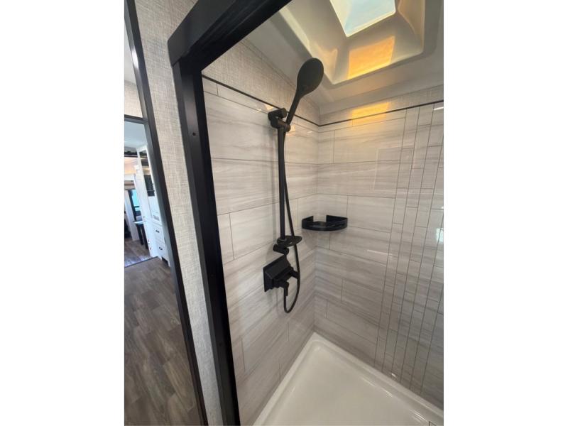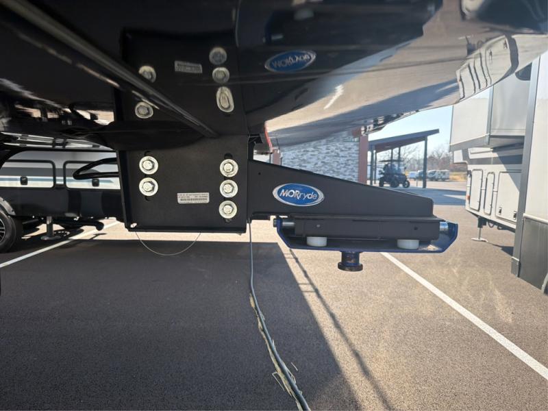 Entertainment can be found throughout this fifth wheel from the front living area with a 50" Smart LED HDTV with fully digital HDMI output and home entertainment system with subwoofer including a fireplace below that you can enjoy while relaxing on theater seats and two tri-fold sofas, a 32" TV in the middle kitchen and there is a bedroom 32" TV. You might even like to add the tailgate TV option along the exterior. Back inside the kitchen, the cook will love the center island, the pantry, the residential refrigerator, and the roll-top dinette. The half bath is a few steps away as an added convenience. The master bedroom includes a king bed slide, a bench, two wardrobes and a sliding door into the bathroom which offers two sinks, a space prepped for a washer/dryer option, and a walk-in shower. And don't forget about the exterior features such as the outside kitchen for more choices when making meals, the storage for your outdoor gear and chairs, and two awnings with integrated LED lighting.
