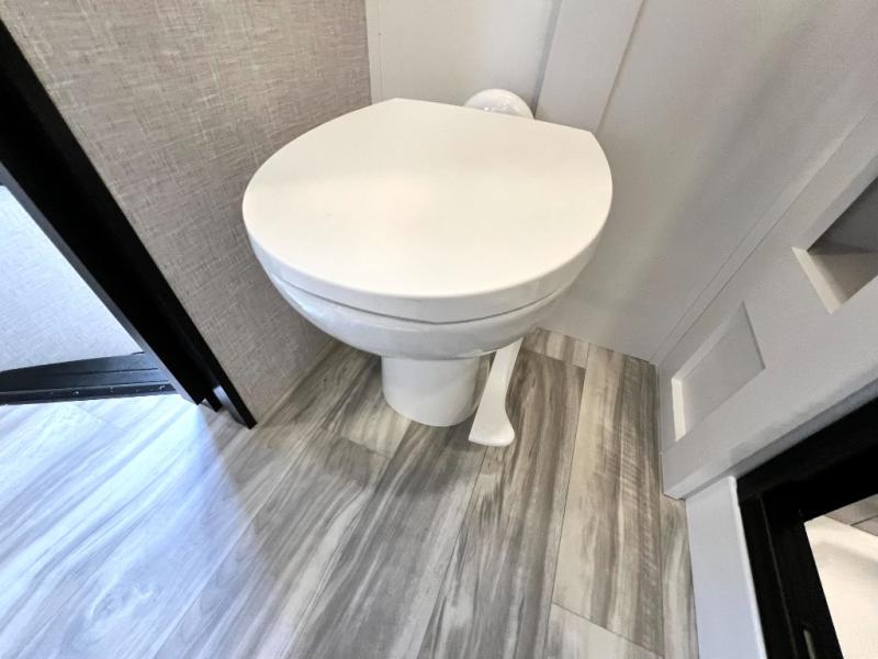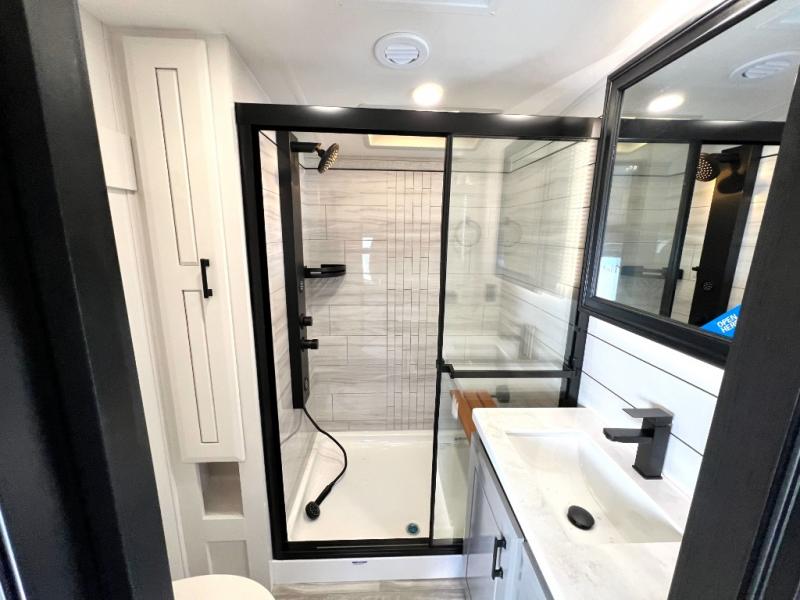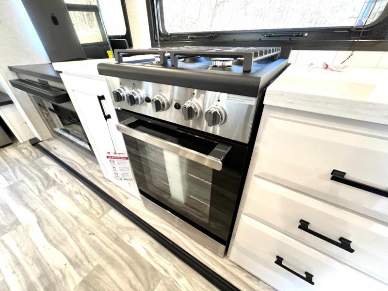 Trips to the lake are made comfortable in this triple slide out fifth wheel. Once you arrive at the campground, set up the two power awnings with LED lights, and there is an exterior TV for the big game. Head inside to relax on the theater seats directly across from the TV and fireplace, or play a game at the roll-top dinette. The chef of your group will love this kitchen with its residential refrigerator, kitchen island, and pantry, plus additional storage for canned goods or paper products. The full bath will allow you to stay clean throughout your trip, and you'll find a residential style backsplash in the bath, plus a walk-in shower. Nothing says luxury like your own king bed slide out in the front bedroom, a large front closet with hamper and drawers for wrinkle-free clothes, and a flip-up dresser featuring a 32" TV!