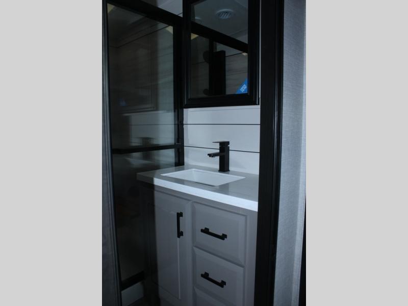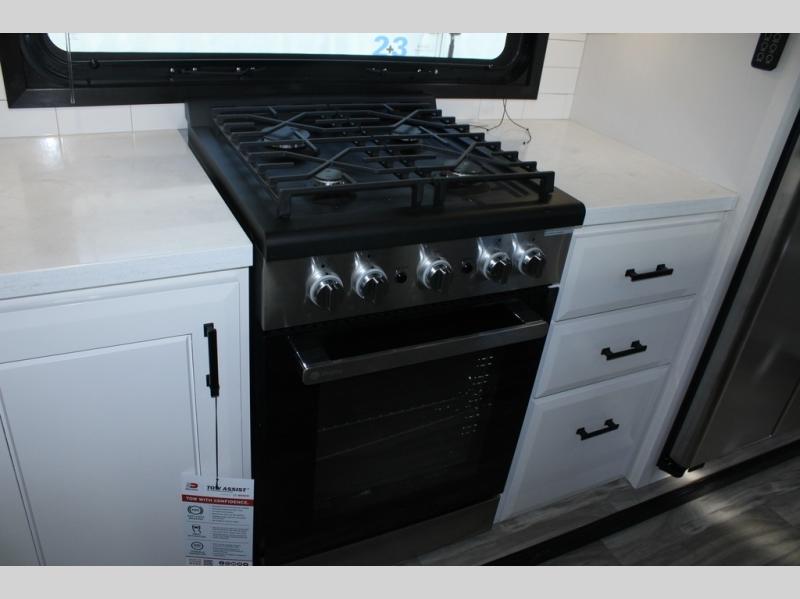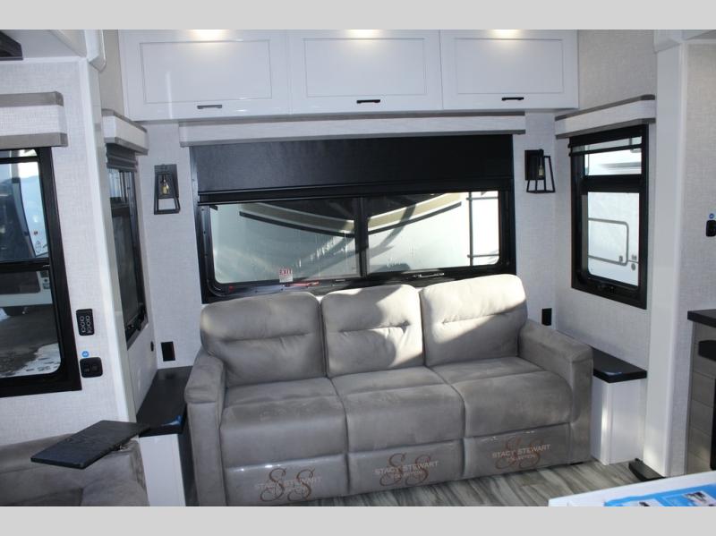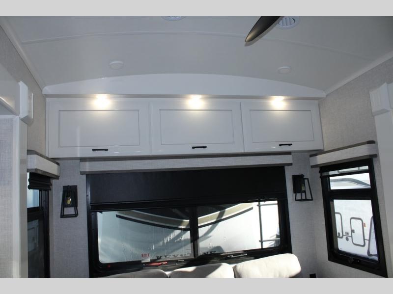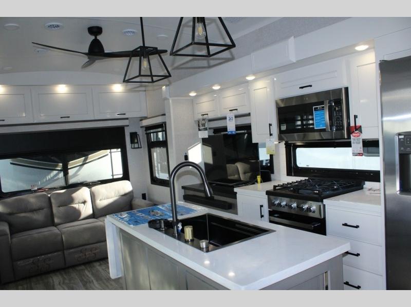 Each Pinnacle fifth wheel features Stronghold VBL lamination for the lightest, yet strongest construction in the RV industry. Add that to the Magnum Truss XL6 roof system and Climate Shield zero-degree tested weather protection and you'll be enjoying your fifth wheel for years to come. Some of the exterior conveniences you will appreciate are the Keyed-Alike lock system, the fully enclosed, universal docking center, and the 6-point hydraulic auto-leveling system for quick and easy set up. The 5 Star Handling Package will make towing a fifth wheel a walk in the park, and the two Whisper Quiet A/C units will keep you comfortable during the hot summer months. Inside, you'll enjoy the residential "Do it all" sink with pull-out kitchen faucet, glass rinse, and vegetable rinse, the handcrafted hardwood glazed cabinetry, the vinyl flooring throughout, plus many more comforts. There is even a central vacuum system, a wireless remote control system, USB ports throughout, plus many more conveniences to make each trip enjoyable.