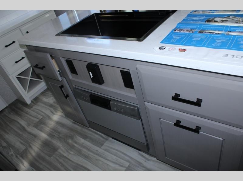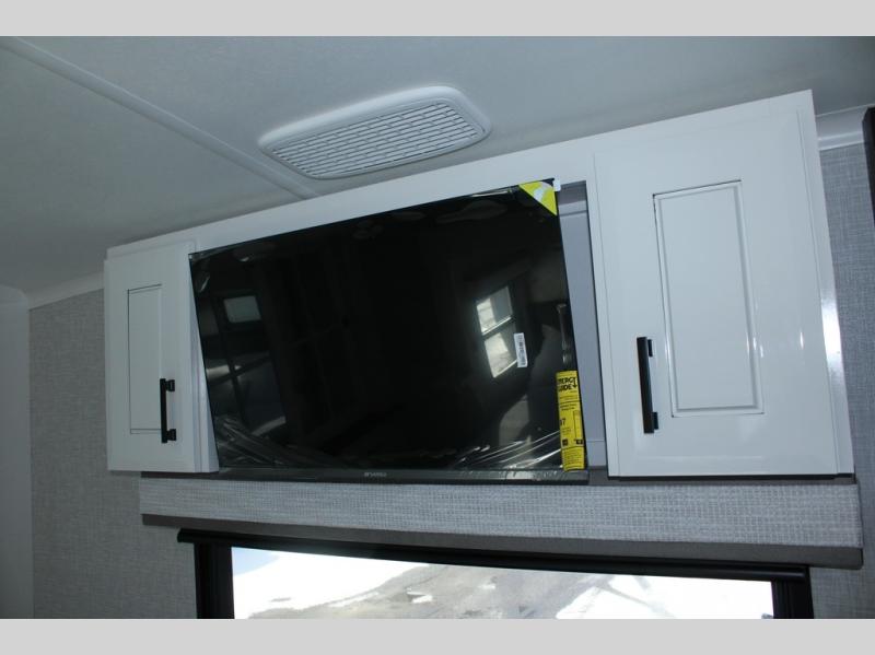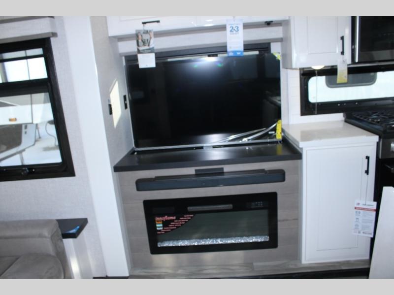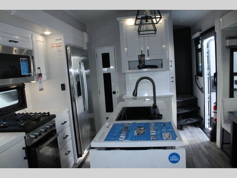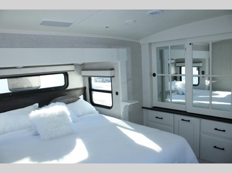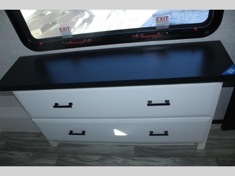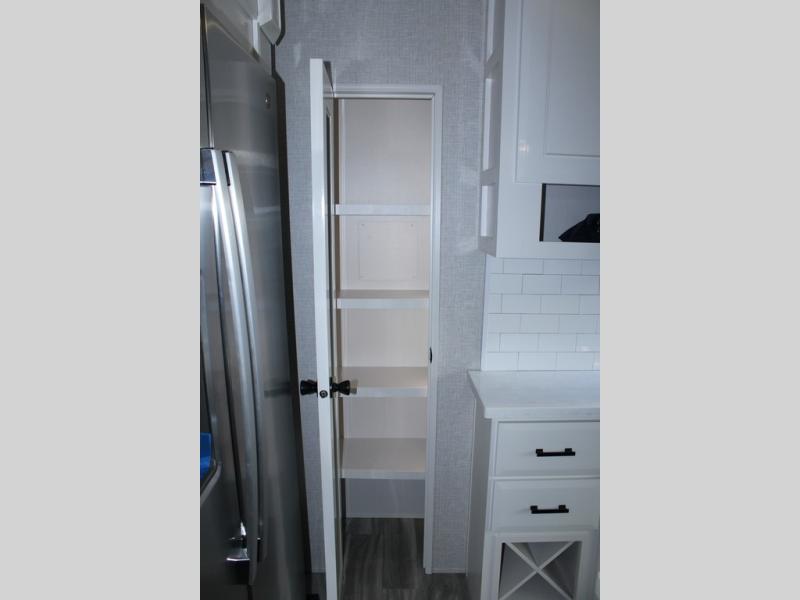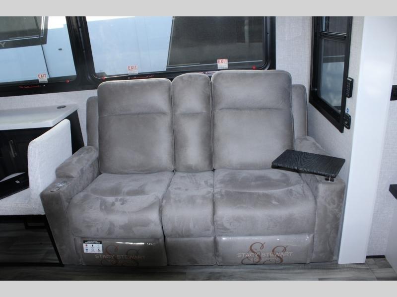 Trips to the lake are made comfortable in this triple slide out fifth wheel. Once you arrive at the campground, set up the two power awnings with LED lights, and there is an exterior TV for the big game. Head inside to relax on the theater seats directly across from the TV and fireplace, or play a game at the roll-top dinette. The chef of your group will love this kitchen with its residential refrigerator, kitchen island, and pantry, plus additional storage for canned goods or paper products. The full bath will allow you to stay clean throughout your trip, and you'll find a residential style backsplash in the bath, plus a walk-in shower. Nothing says luxury like your own king bed slide out in the front bedroom, a large front closet with hamper and drawers for wrinkle-free clothes, and a flip-up dresser featuring a 32" TV!