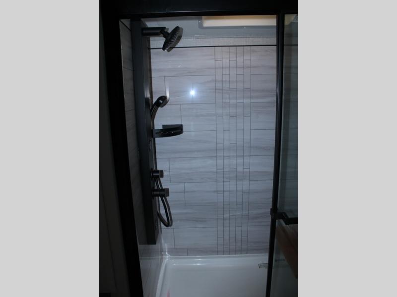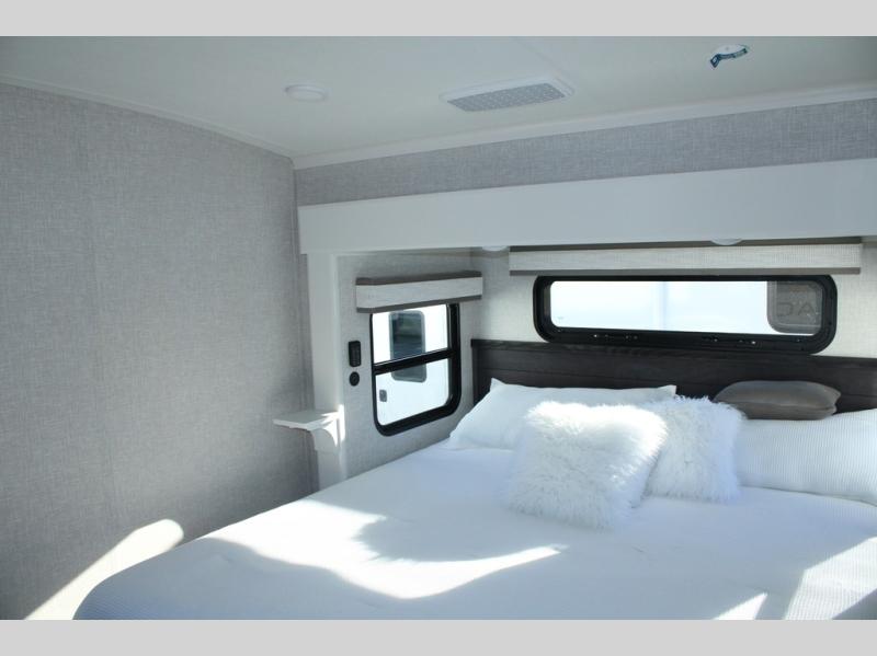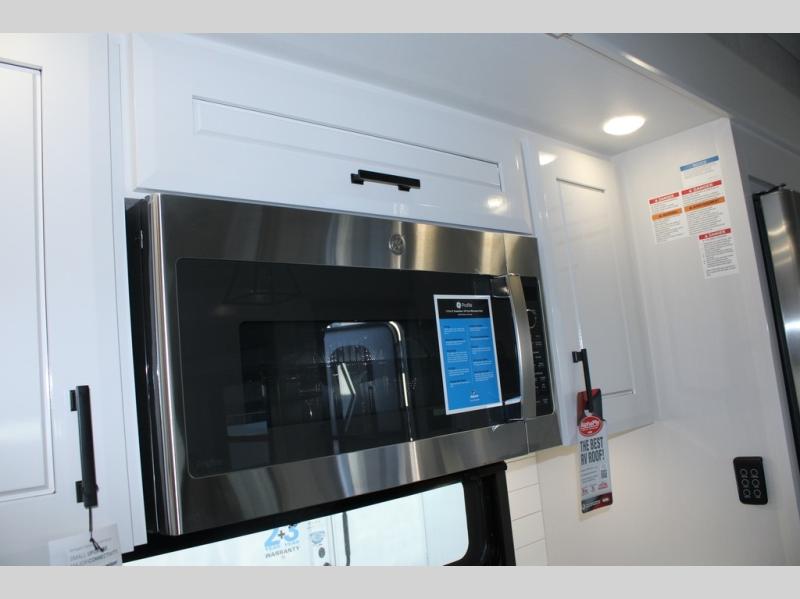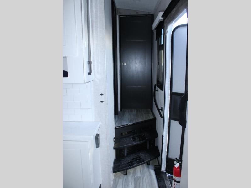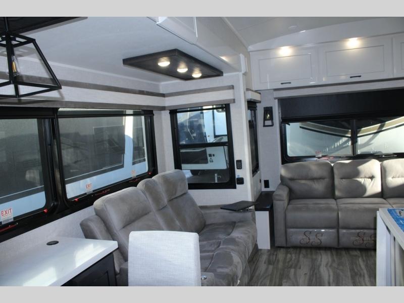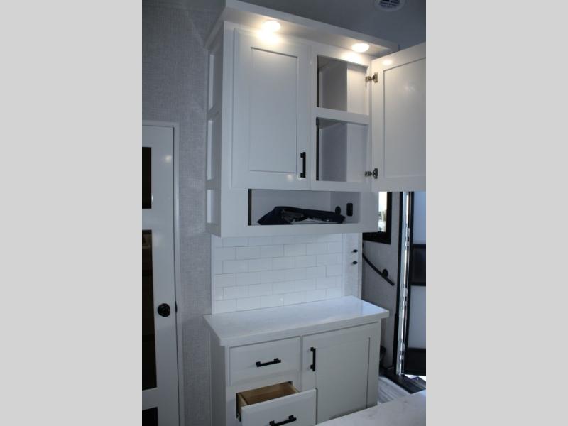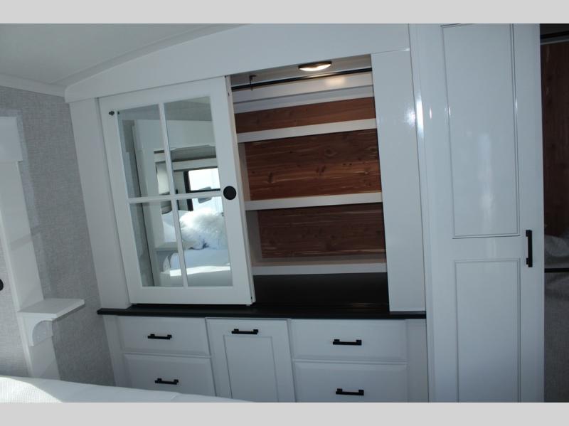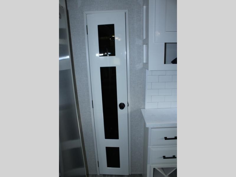 Trips to the lake are made comfortable in this triple slide out fifth wheel. Once you arrive at the campground, set up the two power awnings with LED lights, and there is an exterior TV for the big game. Head inside to relax on the theater seats directly across from the TV and fireplace, or play a game at the roll-top dinette. The chef of your group will love this kitchen with its residential refrigerator, kitchen island, and pantry, plus additional storage for canned goods or paper products. The full bath will allow you to stay clean throughout your trip, and you'll find a residential style backsplash in the bath, plus a walk-in shower. Nothing says luxury like your own king bed slide out in the front bedroom, a large front closet with hamper and drawers for wrinkle-free clothes, and a flip-up dresser featuring a 32" TV!