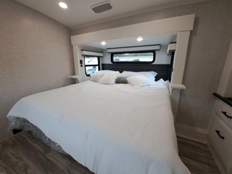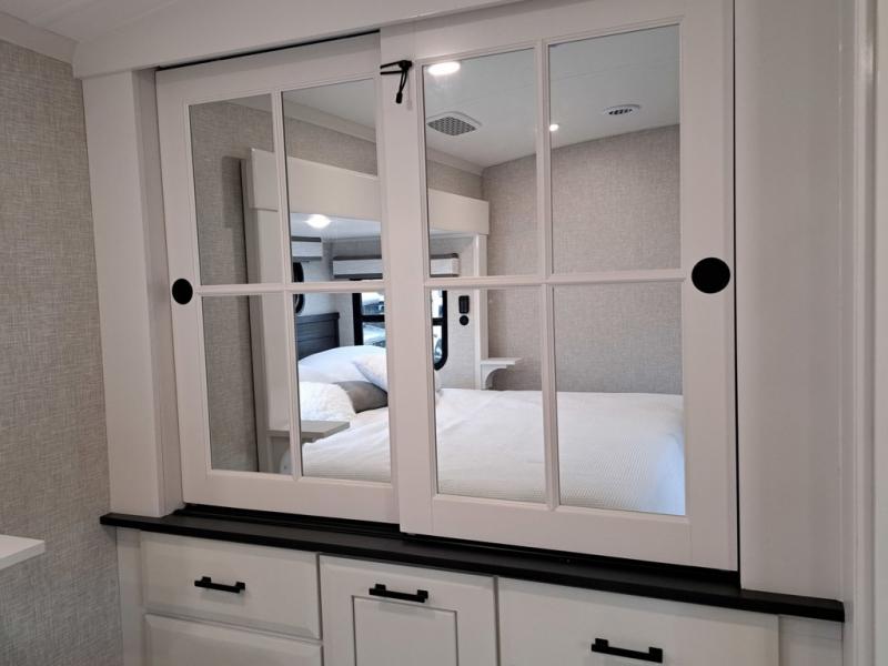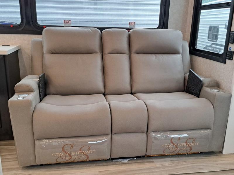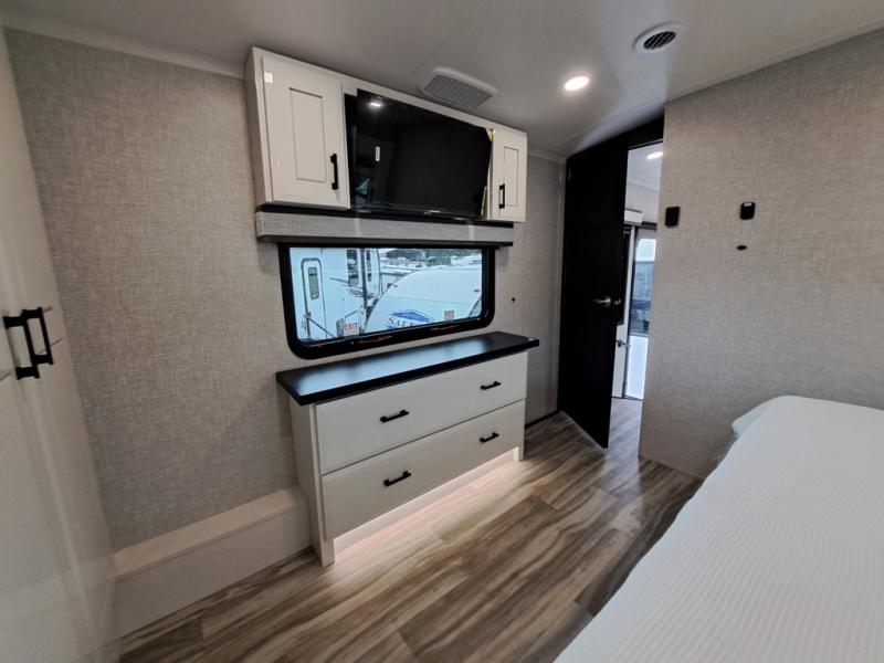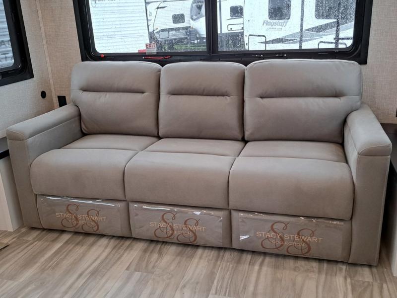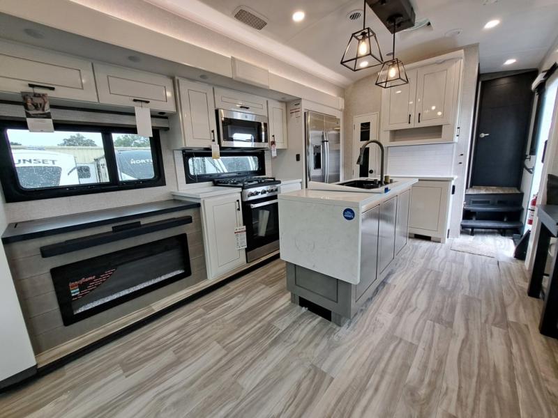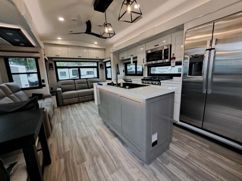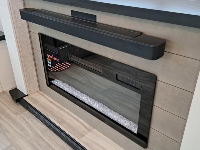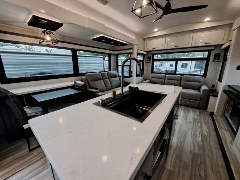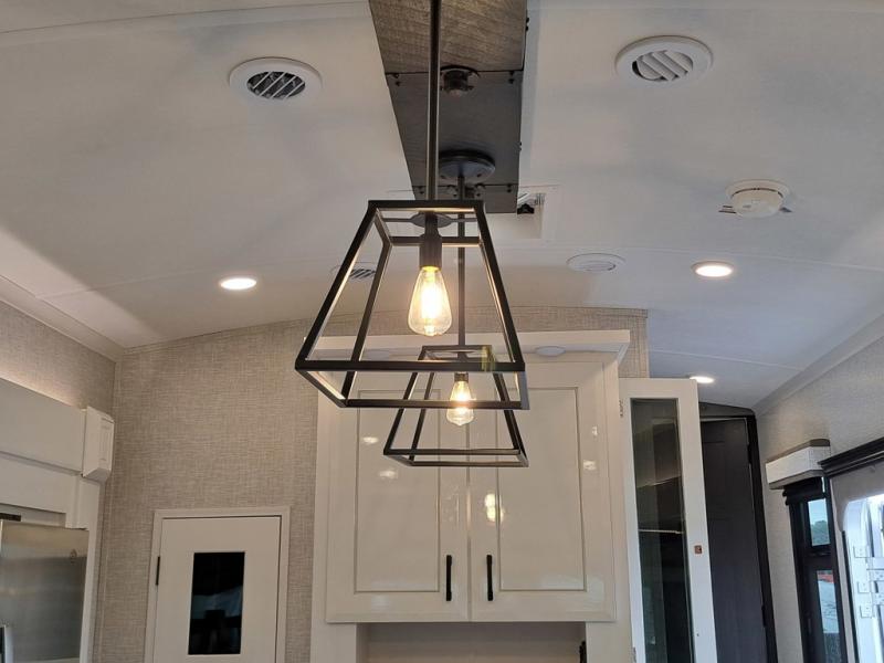 Trips to the lake are made comfortable in this triple slide out fifth wheel. Once you arrive at the campground, set up the two power awnings with LED lights, and there is an exterior TV for the big game. Head inside to relax on the theater seats directly across from the TV and fireplace, or play a game at the roll-top dinette. The chef of your group will love this kitchen with its residential refrigerator, kitchen island, and pantry, plus additional storage for canned goods or paper products. The full bath will allow you to stay clean throughout your trip, and you'll find a residential style backsplash in the bath, plus a walk-in shower. Nothing says luxury like your own king bed slide out in the front bedroom, a large front closet with hamper and drawers for wrinkle-free clothes, and a flip-up dresser featuring a 32" TV!
