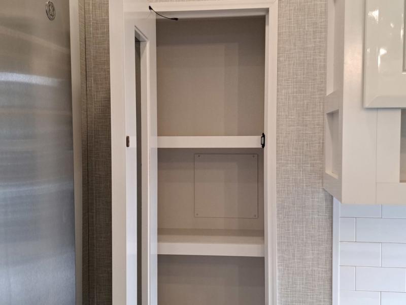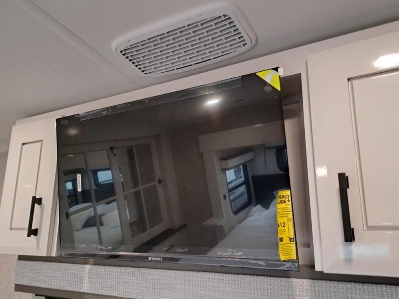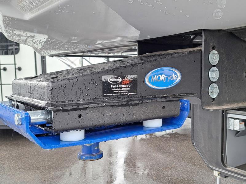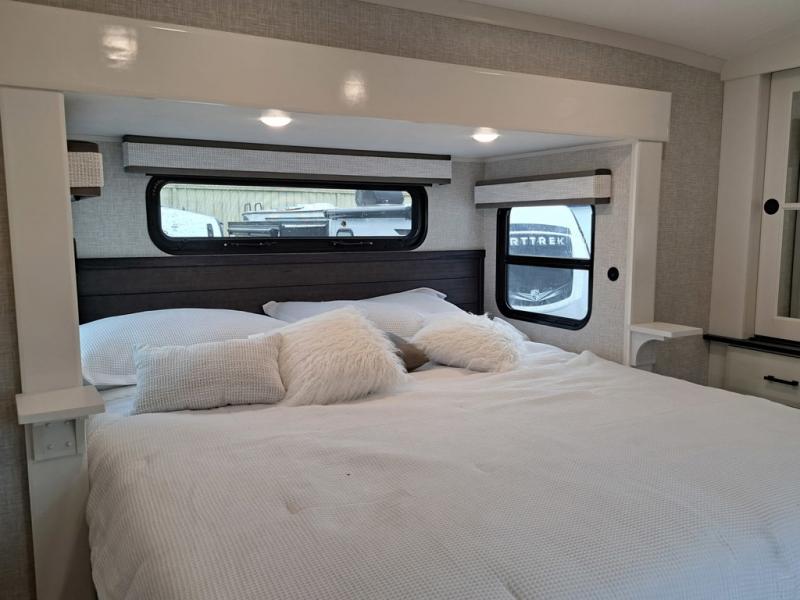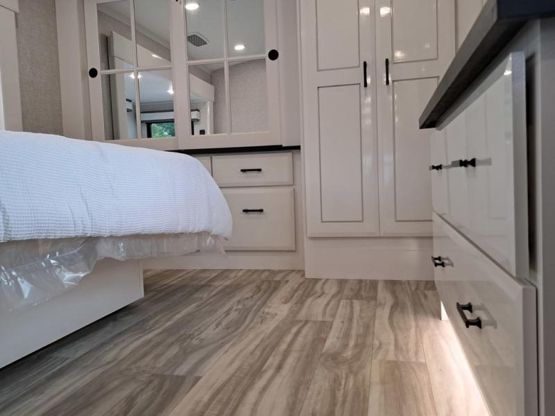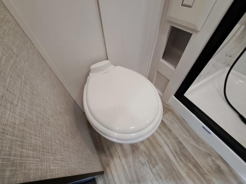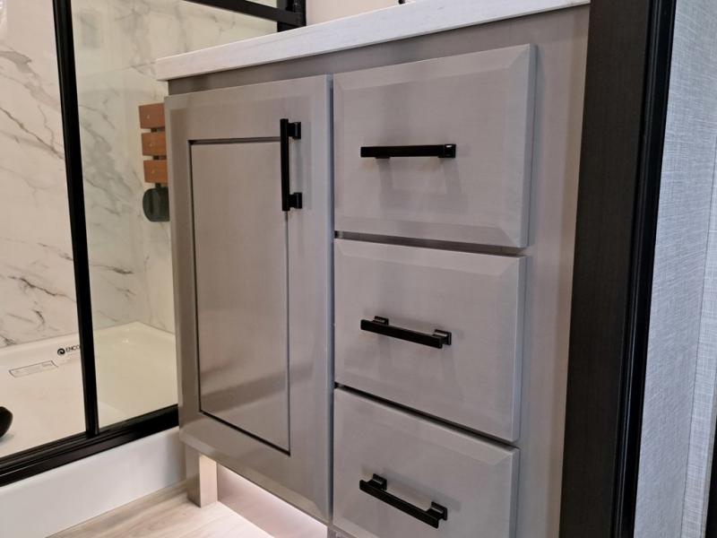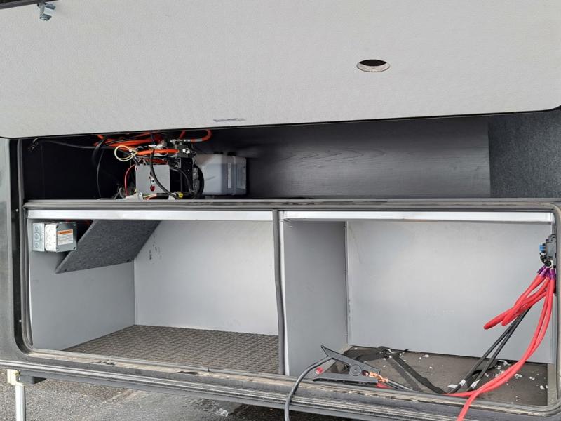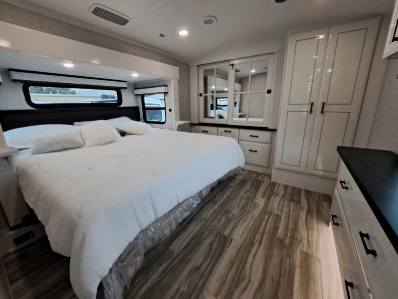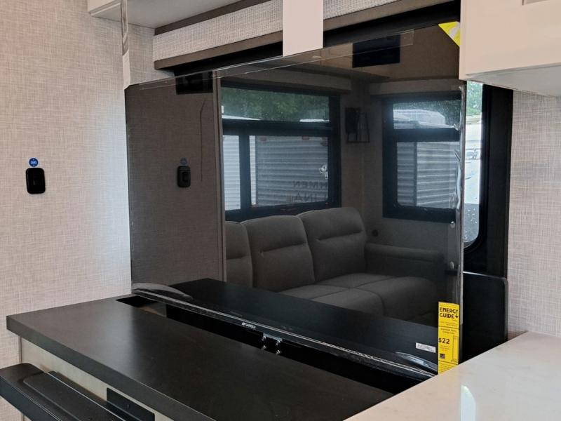 Trips to the lake are made comfortable in this triple slide out fifth wheel. Once you arrive at the campground, set up the two power awnings with LED lights, and there is an exterior TV for the big game. Head inside to relax on the theater seats directly across from the TV and fireplace, or play a game at the roll-top dinette. The chef of your group will love this kitchen with its residential refrigerator, kitchen island, and pantry, plus additional storage for canned goods or paper products. The full bath will allow you to stay clean throughout your trip, and you'll find a residential style backsplash in the bath, plus a walk-in shower. Nothing says luxury like your own king bed slide out in the front bedroom, a large front closet with hamper and drawers for wrinkle-free clothes, and a flip-up dresser featuring a 32" TV!