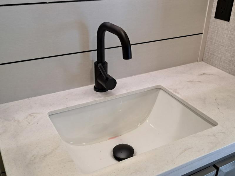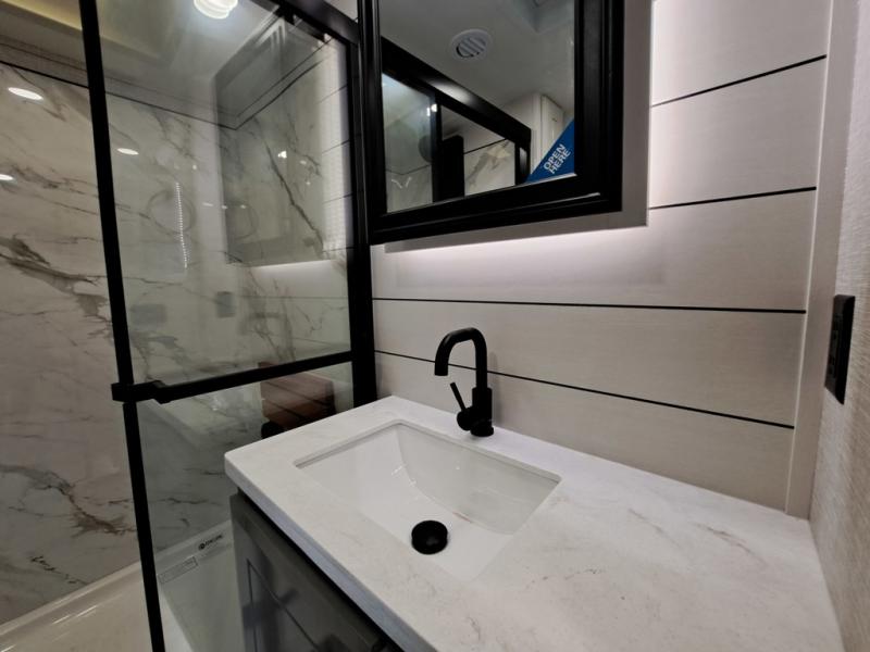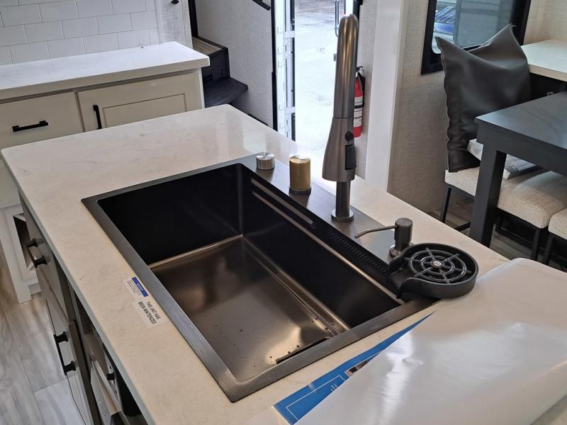 Each Pinnacle fifth wheel features Stronghold VBL lamination for the lightest, yet strongest construction in the RV industry. Add that to the Magnum Truss XL6 roof system and Climate Shield zero-degree tested weather protection and you'll be enjoying your fifth wheel for years to come. Some of the exterior conveniences you will appreciate are the Keyed-Alike lock system, the fully enclosed, universal docking center, and the 6-point hydraulic auto-leveling system for quick and easy set up. The 5 Star Handling Package will make towing a fifth wheel a walk in the park, and the two Whisper Quiet A/C units will keep you comfortable during the hot summer months. Inside, you'll enjoy the residential "Do it all" sink with pull-out kitchen faucet, glass rinse, and vegetable rinse, the handcrafted hardwood glazed cabinetry, the vinyl flooring throughout, plus many more comforts. There is even a central vacuum system, a wireless remote control system, USB ports throughout, plus many more conveniences to make each trip enjoyable.