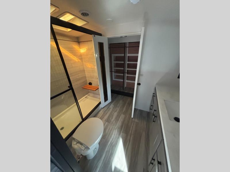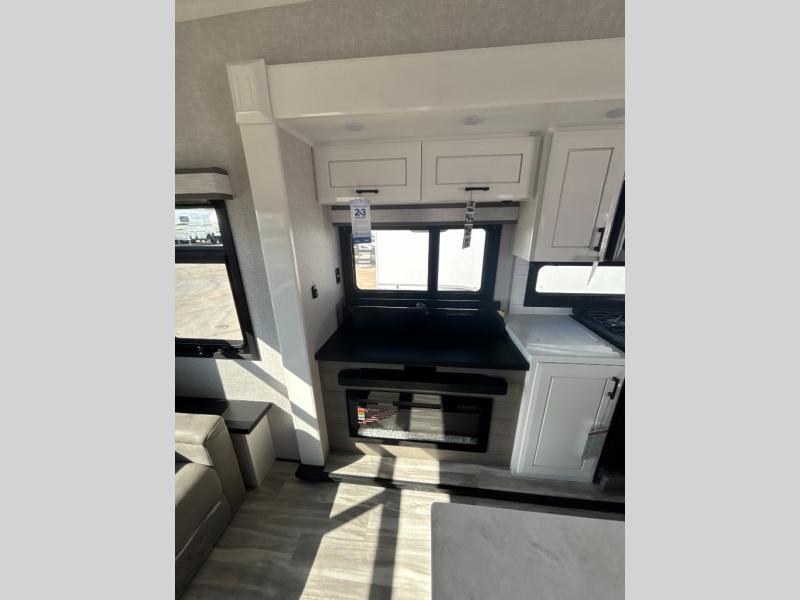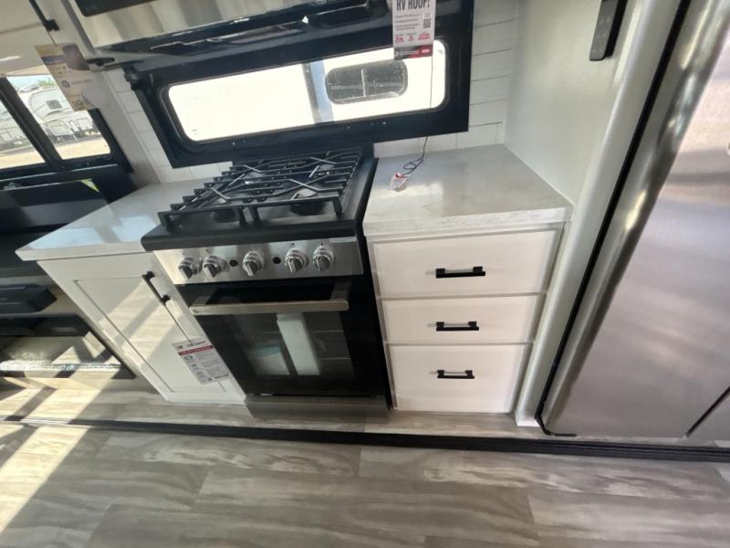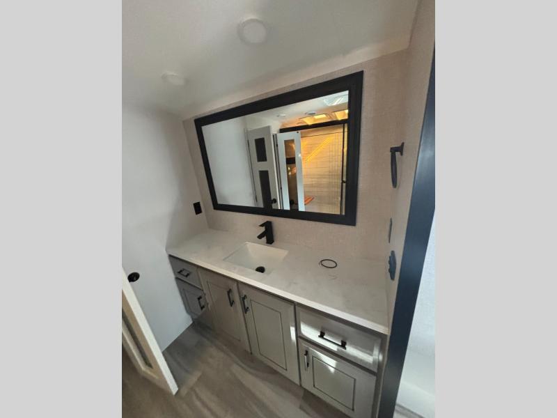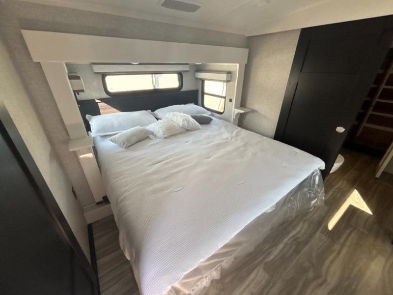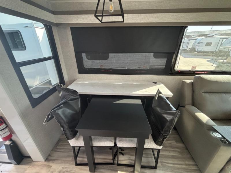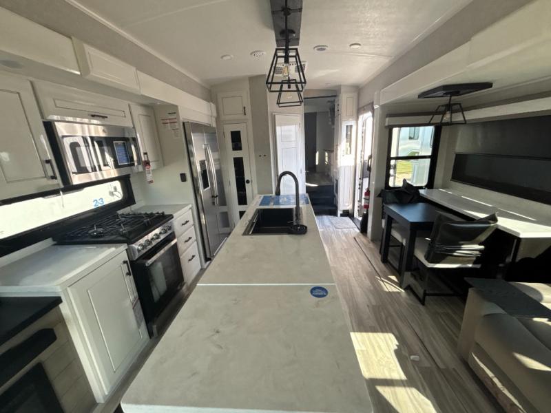 You can't go wrong with this fifth wheel that can sleep four! You will love how much space you have in the main living area thanks to the dual opposing slides, and there is a kitchen island here with a pull-out extension for added prep space. The convenient half bath is right off of the kitchen for quick restroom breaks, and you'll find a shoe garage and a wardrobe just as you enter the unit to keep the RV tidy. Head to the master bedroom for a rest on the king bed slide out, or you may want to watch a show on the 32" bedroom TV. The front master bath may be your favorite feature of this unit. Here, you'll find dual bath sinks, a walk-in shower with a seat, plus a spacious walk-in closet for your clothes. And don't overlook the exterior with its two power awnings, 32" exterior TV, and a Jayport with LP quick connect for your outdoor grill.