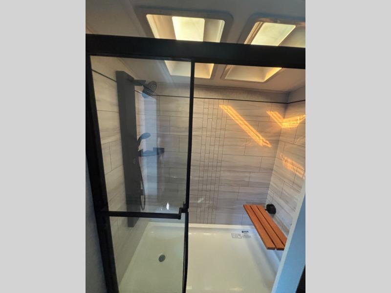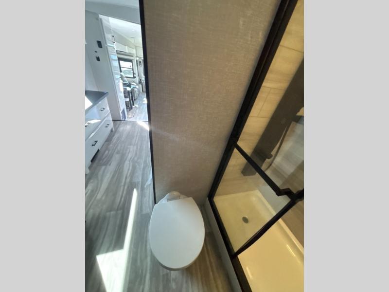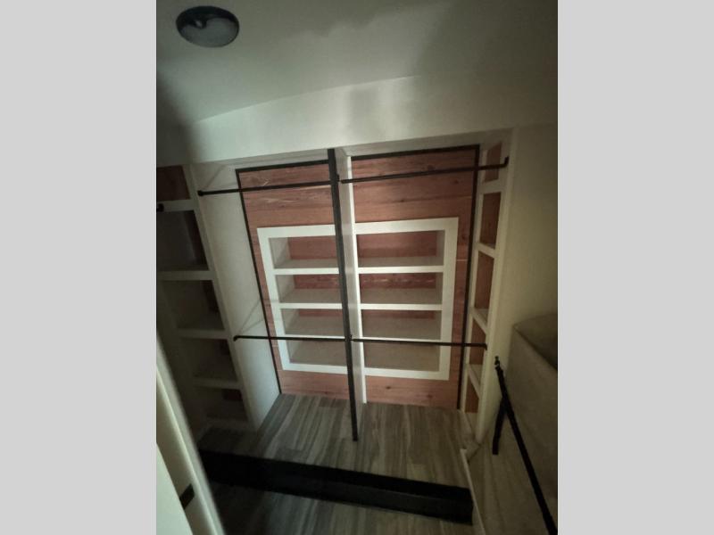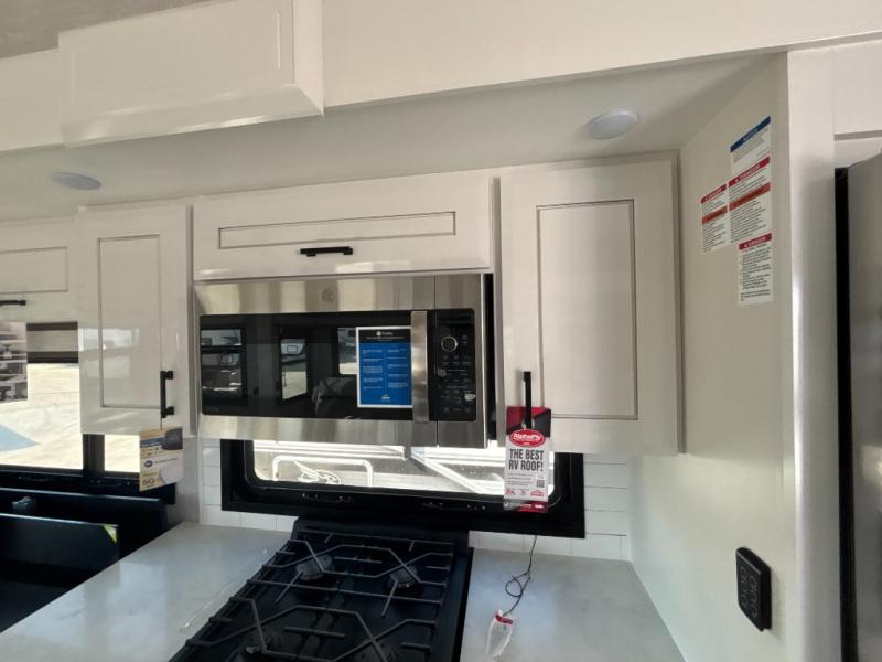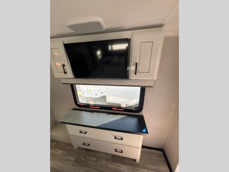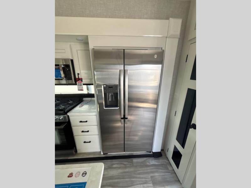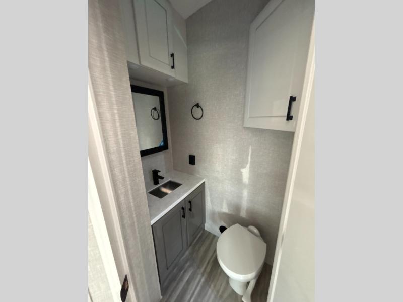 You can't go wrong with this fifth wheel that can sleep four! You will love how much space you have in the main living area thanks to the dual opposing slides, and there is a kitchen island here with a pull-out extension for added prep space. The convenient half bath is right off of the kitchen for quick restroom breaks, and you'll find a shoe garage and a wardrobe just as you enter the unit to keep the RV tidy. Head to the master bedroom for a rest on the king bed slide out, or you may want to watch a show on the 32" bedroom TV. The front master bath may be your favorite feature of this unit. Here, you'll find dual bath sinks, a walk-in shower with a seat, plus a spacious walk-in closet for your clothes. And don't overlook the exterior with its two power awnings, 32" exterior TV, and a Jayport with LP quick connect for your outdoor grill.