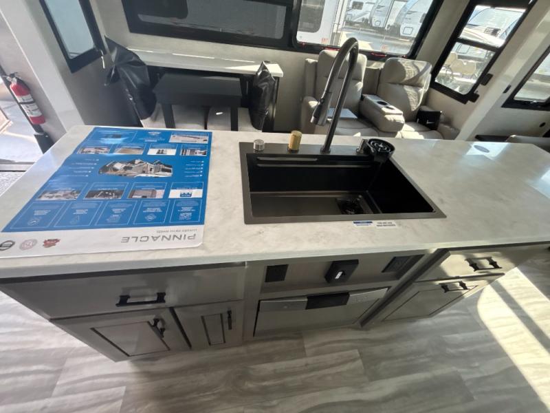 Each Pinnacle fifth wheel features Stronghold VBL lamination for the lightest, yet strongest construction in the RV industry. Add that to the Magnum Truss XL6 roof system and Climate Shield zero-degree tested weather protection and you'll be enjoying your fifth wheel for years to come. Some of the exterior conveniences you will appreciate are the Keyed-Alike lock system, the fully enclosed, universal docking center, and the 6-point hydraulic auto-leveling system for quick and easy set up. The 5 Star Handling Package will make towing a fifth wheel a walk in the park, and the two Whisper Quiet A/C units will keep you comfortable during the hot summer months. Inside, you'll enjoy the residential "Do it all" sink with pull-out kitchen faucet, glass rinse, and vegetable rinse, the handcrafted hardwood glazed cabinetry, the vinyl flooring throughout, plus many more comforts. There is even a central vacuum system, a wireless remote control system, USB ports throughout, plus many more conveniences to make each trip enjoyable.