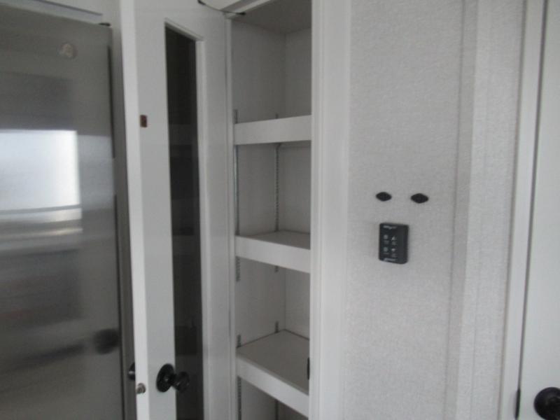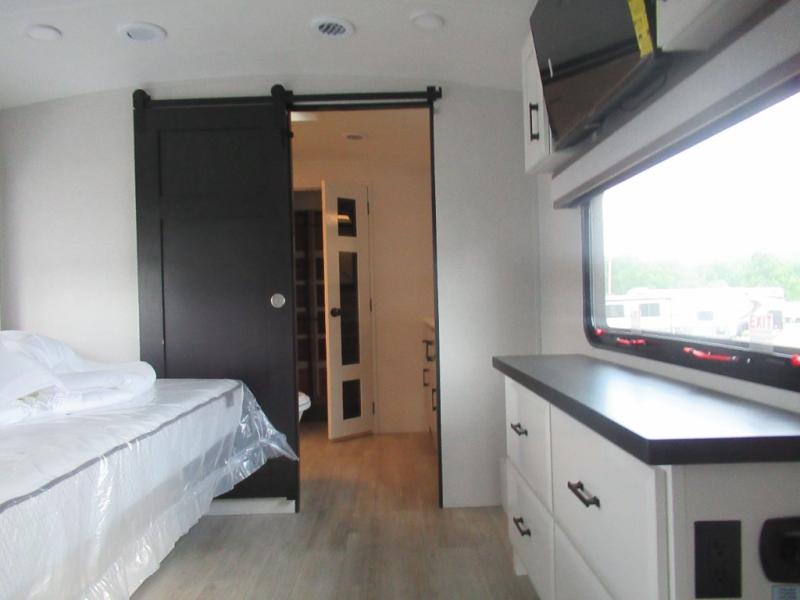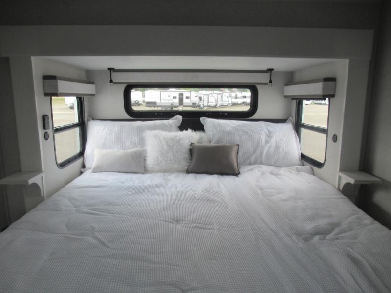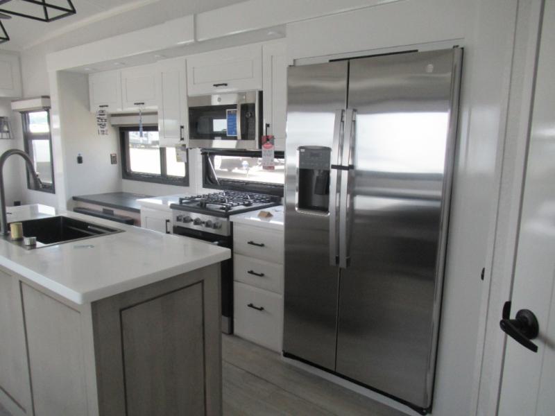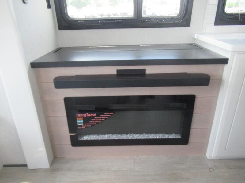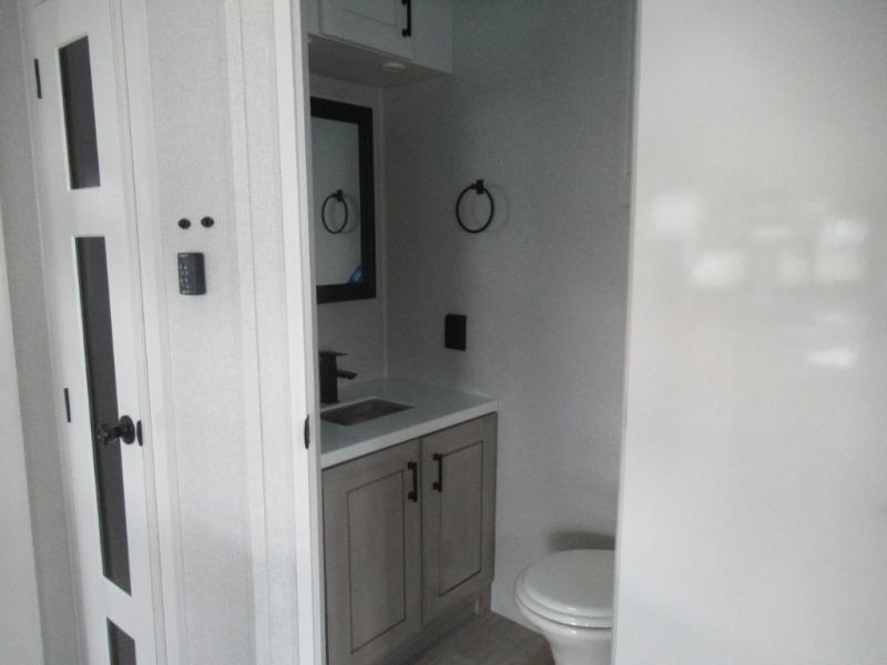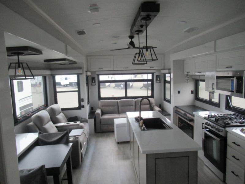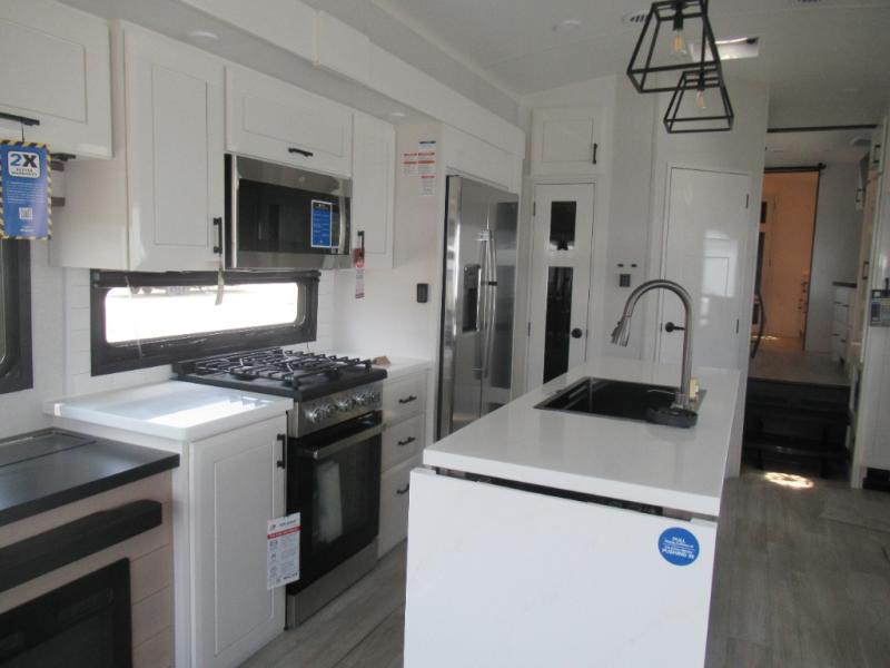 You can't go wrong with this fifth wheel that can sleep four! You will love how much space you have in the main living area thanks to the dual opposing slides, and there is a kitchen island here with a pull-out extension for added prep space. The convenient half bath is right off of the kitchen for quick restroom breaks, and you'll find a shoe garage and a wardrobe just as you enter the unit to keep the RV tidy. Head to the master bedroom for a rest on the king bed slide out, or you may want to watch a show on the 32" bedroom TV. The front master bath may be your favorite feature of this unit. Here, you'll find dual bath sinks, a walk-in shower with a seat, plus a spacious walk-in closet for your clothes. And don't overlook the exterior with its two power awnings, 32" exterior TV, and a Jayport with LP quick connect for your outdoor grill.
