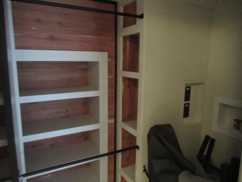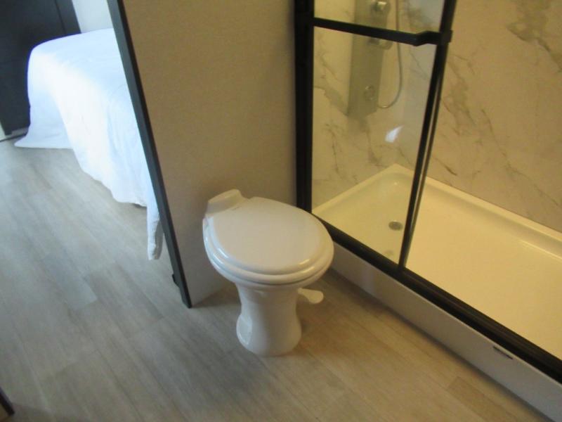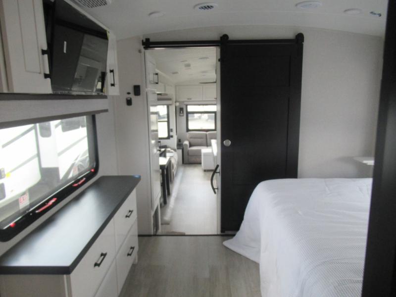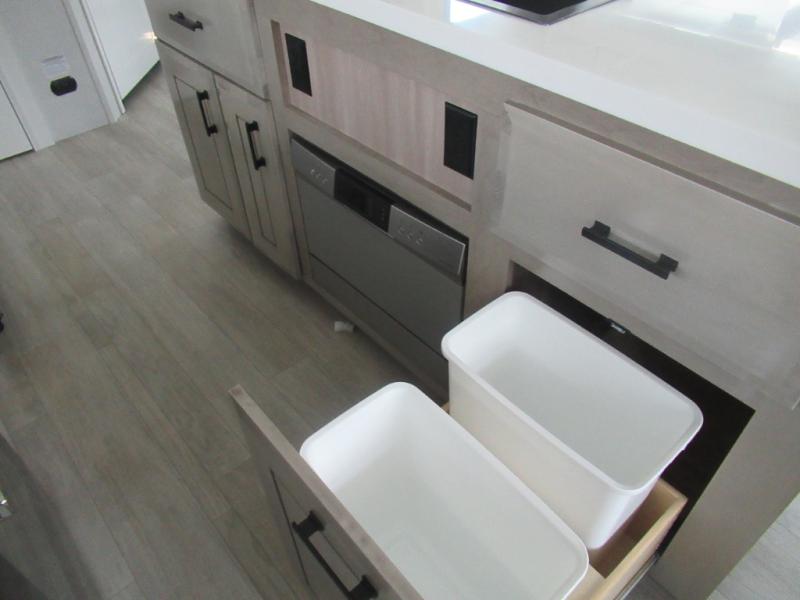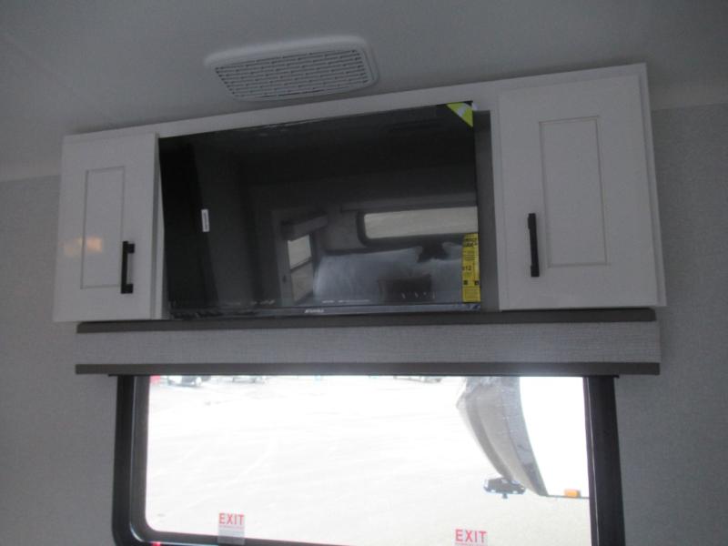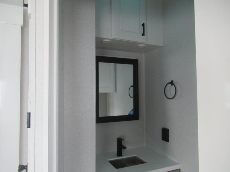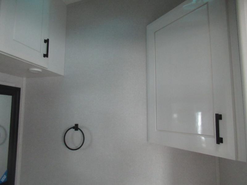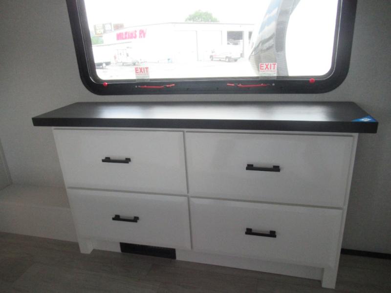 You can't go wrong with this fifth wheel that can sleep four! You will love how much space you have in the main living area thanks to the dual opposing slides, and there is a kitchen island here with a pull-out extension for added prep space. The convenient half bath is right off of the kitchen for quick restroom breaks, and you'll find a shoe garage and a wardrobe just as you enter the unit to keep the RV tidy. Head to the master bedroom for a rest on the king bed slide out, or you may want to watch a show on the 32" bedroom TV. The front master bath may be your favorite feature of this unit. Here, you'll find dual bath sinks, a walk-in shower with a seat, plus a spacious walk-in closet for your clothes. And don't overlook the exterior with its two power awnings, 32" exterior TV, and a Jayport with LP quick connect for your outdoor grill.