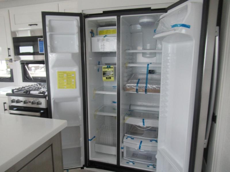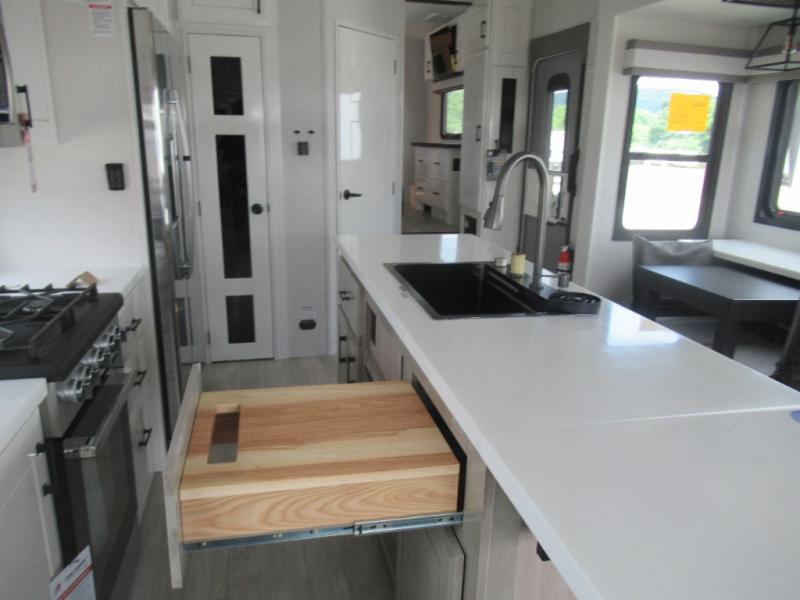 Each Pinnacle fifth wheel features Stronghold VBL lamination for the lightest, yet strongest construction in the RV industry. Add that to the Magnum Truss XL6 roof system and Climate Shield zero-degree tested weather protection and you'll be enjoying your fifth wheel for years to come. Some of the exterior conveniences you will appreciate are the Keyed-Alike lock system, the fully enclosed, universal docking center, and the 6-point hydraulic auto-leveling system for quick and easy set up. The 5 Star Handling Package will make towing a fifth wheel a walk in the park, and the two Whisper Quiet A/C units will keep you comfortable during the hot summer months. Inside, you'll enjoy the residential "Do it all" sink with pull-out kitchen faucet, glass rinse, and vegetable rinse, the handcrafted hardwood glazed cabinetry, the vinyl flooring throughout, plus many more comforts. There is even a central vacuum system, a wireless remote control system, USB ports throughout, plus many more conveniences to make each trip enjoyable.