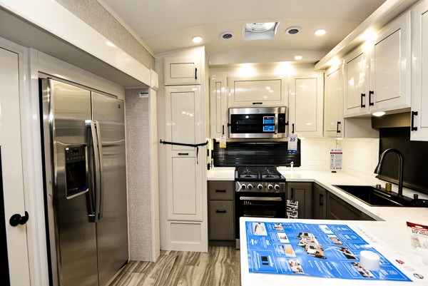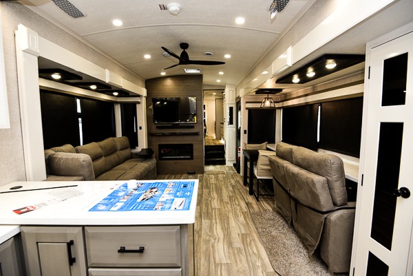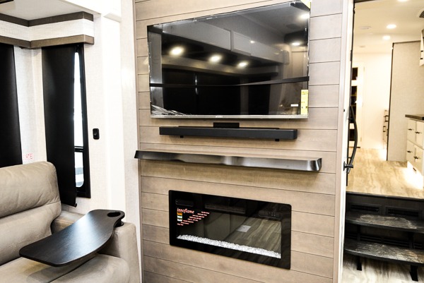 Triples slides, a desk/coffee bar, fireplace, and a huge master bath in front all indicate the kind of vacation you will experience in this Pinnacle Fifth Wheel! As you enter, a convenient half bath is located straight ahead. Slightly to your left, a nice seating area for gathering with family or friends to relax and watch TV, enjoy the fireplace while reading a book or watching a movie, and the dining table with chairs. The dinette slide also houses a 21 cu. ft. residential refrigerator and pantry. The rear kitchen features a u-shaped counter, all the appliances you need to cook like at home, even a pull-out butcher block space for chopping up your veggies. Back through and up the steps to your right in front, the master bedroom will make you feel like royalty with its king bed, plus luxurious full rear bath. A huge vanity with dual bath sinks will allow you both to get ready at the same time, plus there is a walk-in shower with a seat for added convenience. Speaking of walk-in, you will also love the spacious walk-in closet that includes washer/dryer prep.