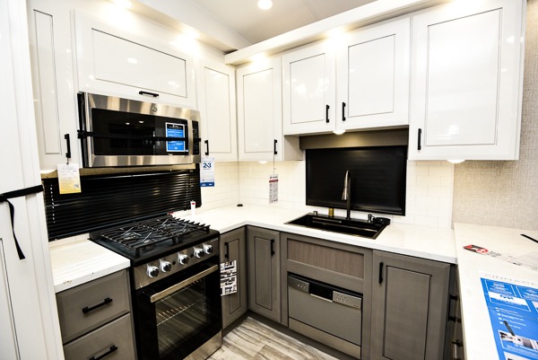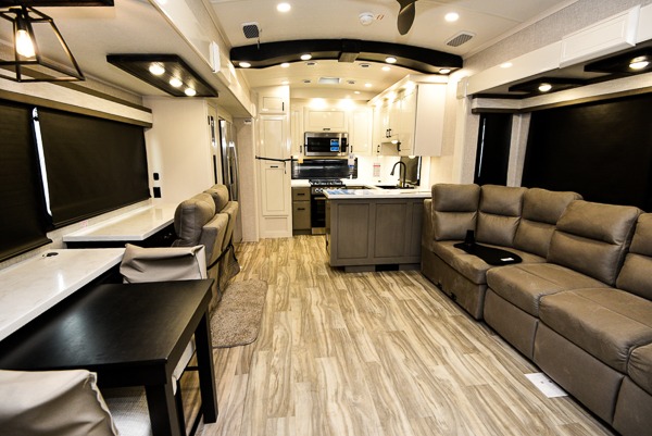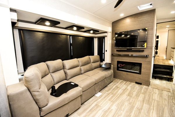 Each Pinnacle fifth wheel features Stronghold VBL lamination for the lightest, yet strongest construction in the RV industry. Add that to the Magnum Truss XL6 roof system and Climate Shield zero-degree tested weather protection and you'll be enjoying your fifth wheel for years to come. Some of the exterior conveniences you will appreciate are the Keyed-Alike lock system, the fully enclosed, universal docking center, and the 6-point hydraulic auto-leveling system for quick and easy set up. The 5 Star Handling Package will make towing a fifth wheel a walk in the park, and the two Whisper Quiet A/C units will keep you comfortable during the hot summer months. Inside, you'll enjoy the residential "Do it all" sink with pull-out kitchen faucet, glass rinse, and vegetable rinse, the handcrafted hardwood glazed cabinetry, the vinyl flooring throughout, plus many more comforts. There is even a central vacuum system, a wireless remote control system, USB ports throughout, plus many more conveniences to make each trip enjoyable.