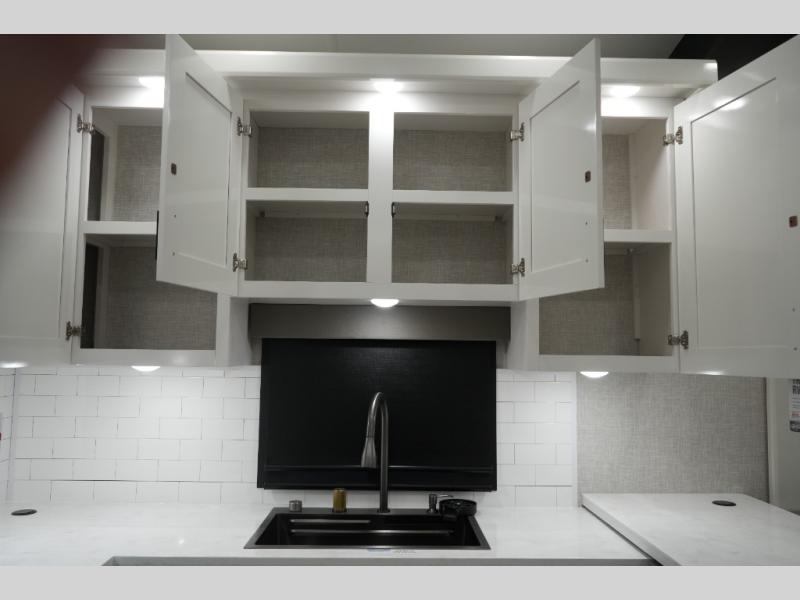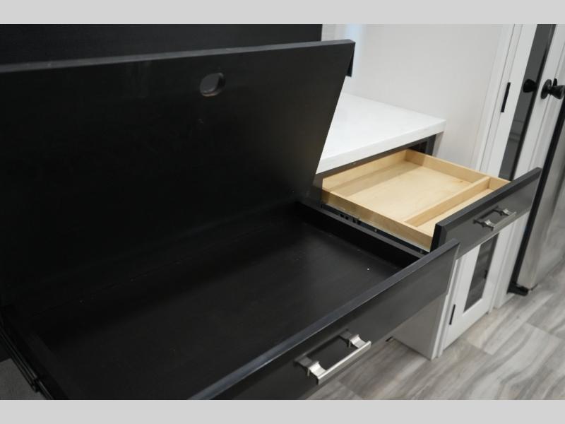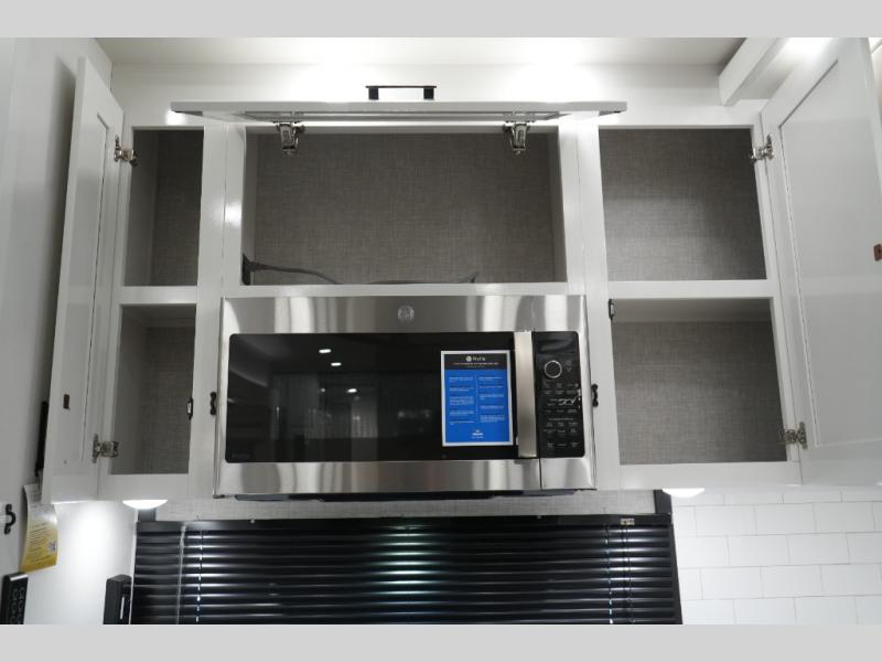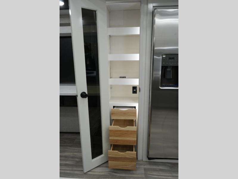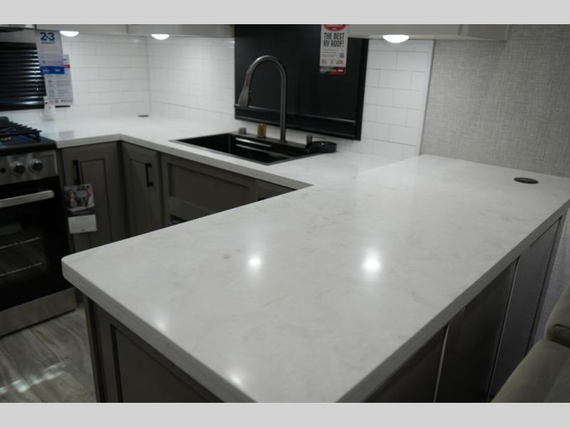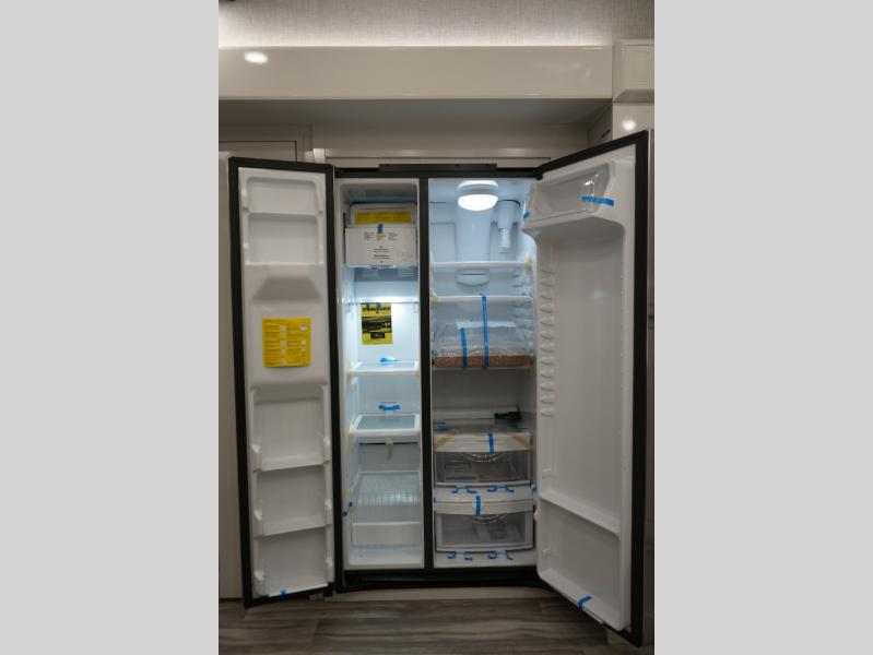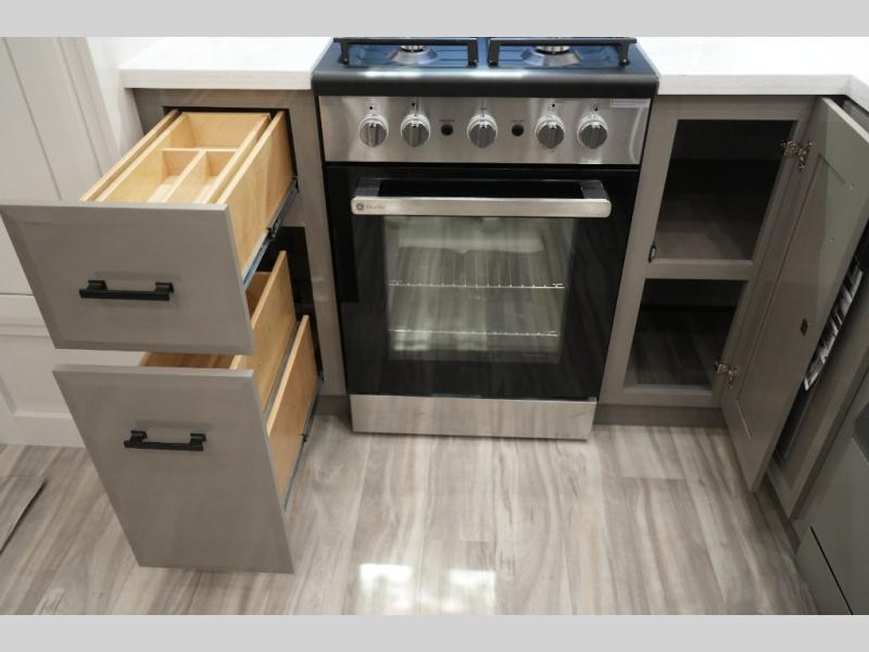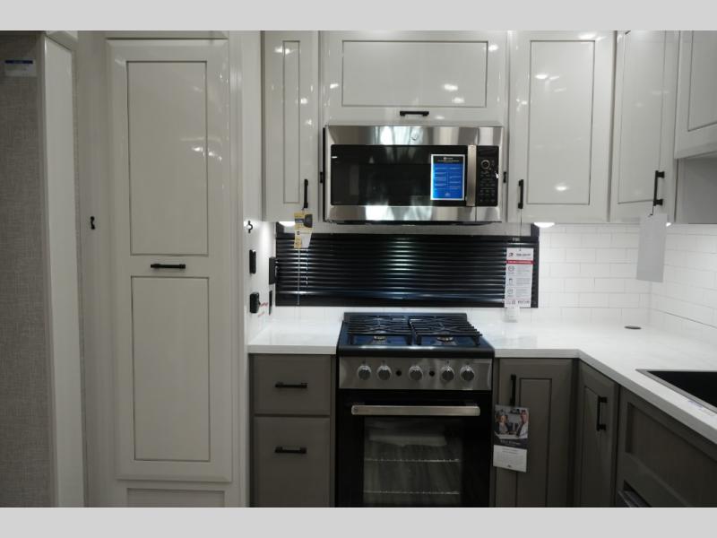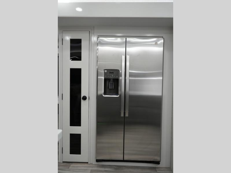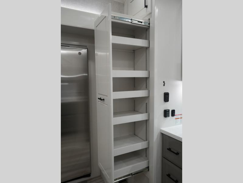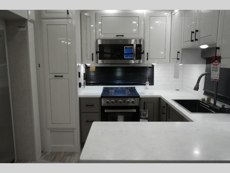 Spacious Rear Kitchen with U-shaped countertop, residential-size fridge, pull-out butcher block, and premium appliances for true home-style cooking on the go.