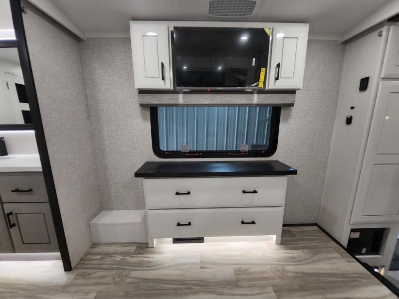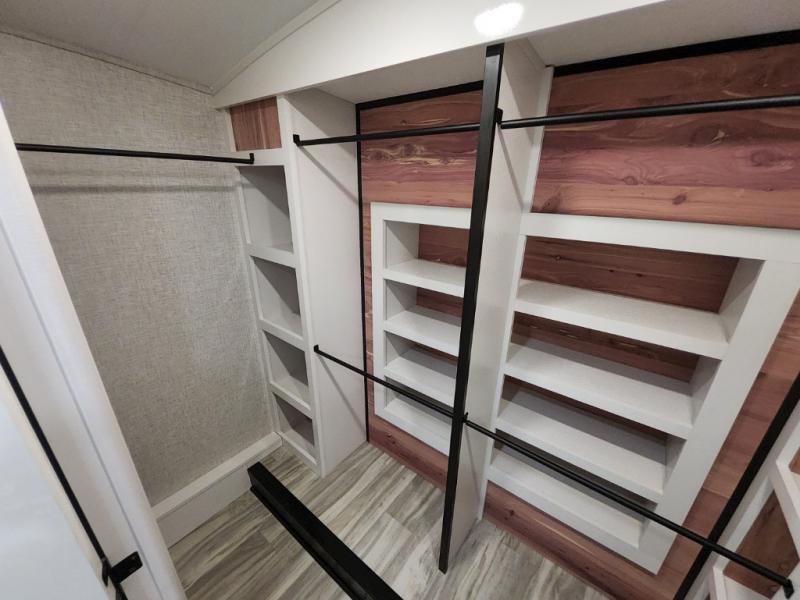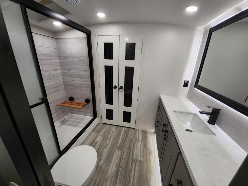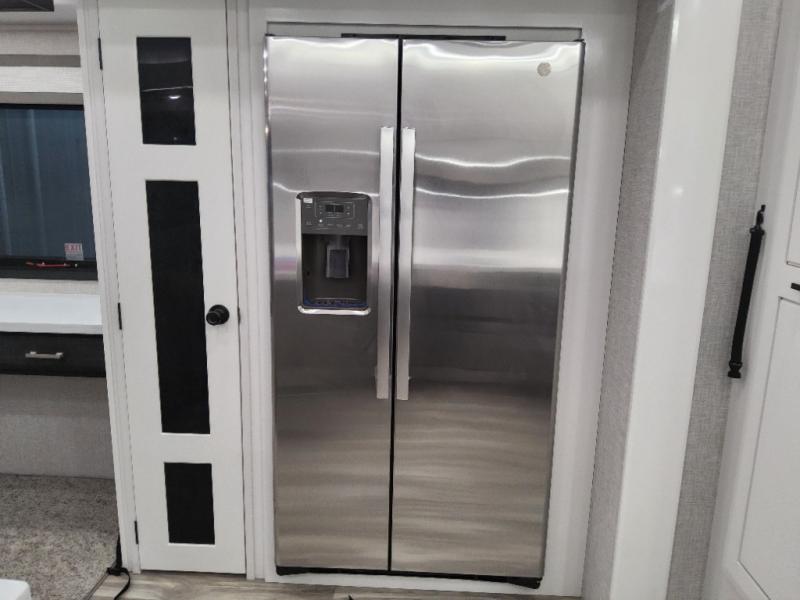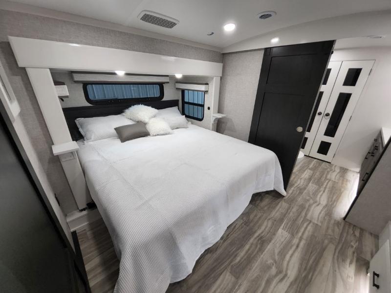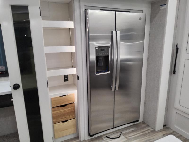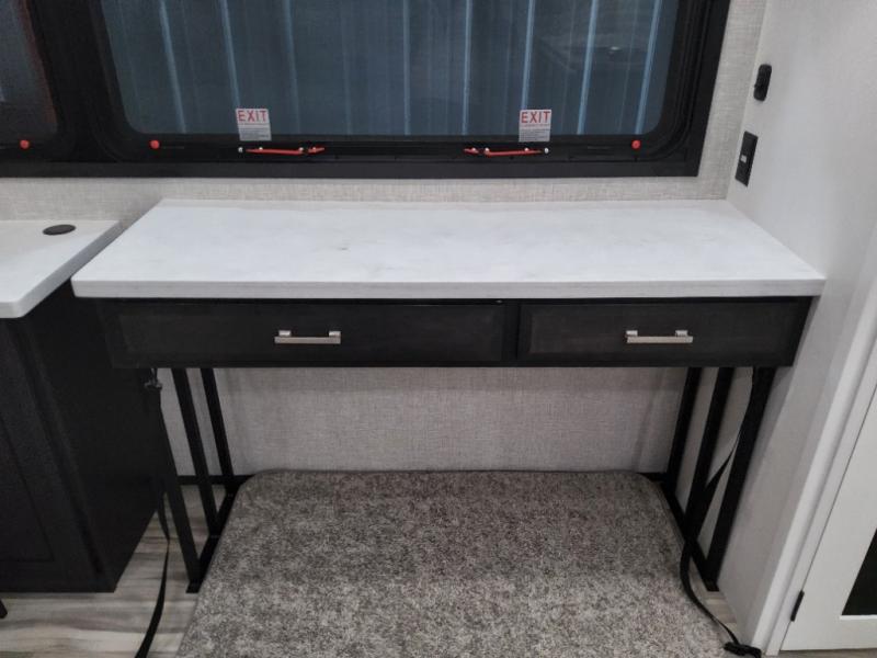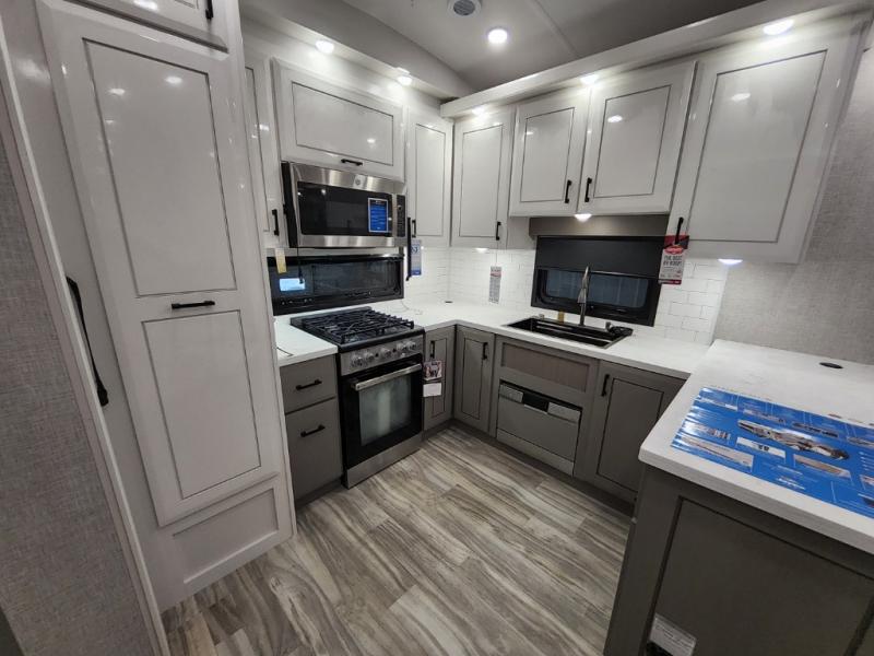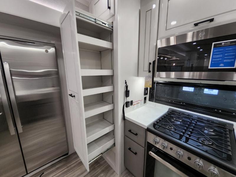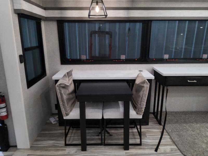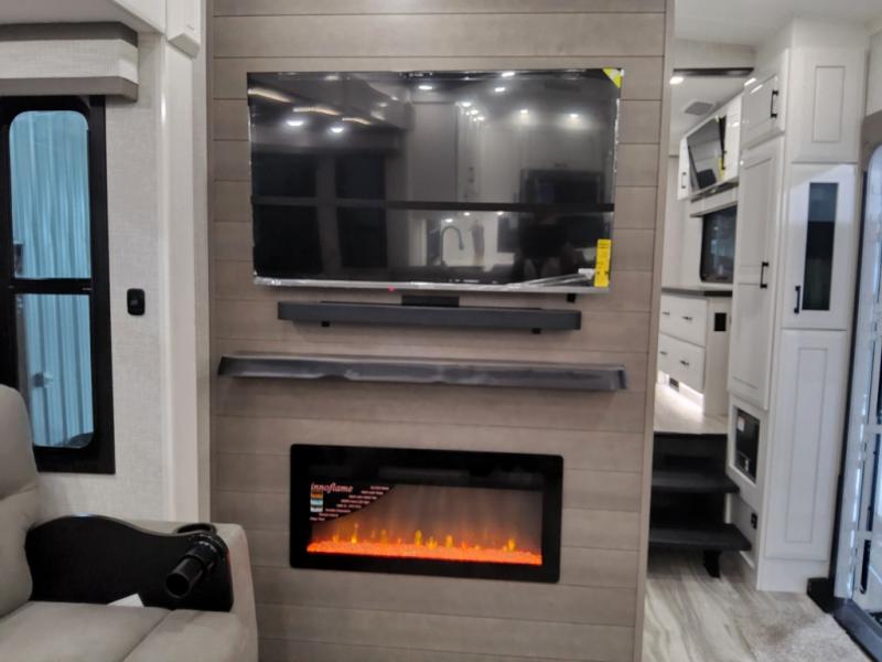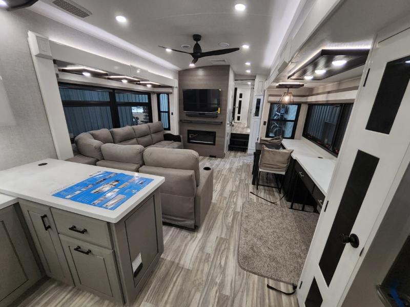 Triples slides, a desk/coffee bar, fireplace, and a huge master bath in front all indicate the kind of vacation you will experience in this Pinnacle Fifth Wheel! As you enter, a convenient half bath is located straight ahead. Slightly to your left, a nice seating area for gathering with family or friends to relax and watch TV, enjoy the fireplace while reading a book or watching a movie, and the dining table with chairs. The dinette slide also houses a 21 cu. ft. residential refrigerator and pantry. The rear kitchen features a u-shaped counter, all the appliances you need to cook like at home, even a pull-out butcher block space for chopping up your veggies. Back through and up the steps to your right in front, the master bedroom will make you feel like royalty with its king bed, plus luxurious full rear bath. A huge vanity with dual bath sinks will allow you both to get ready at the same time, plus there is a walk-in shower with a seat for added convenience. Speaking of walk-in, you will also love the spacious walk-in closet that includes washer/dryer prep.
