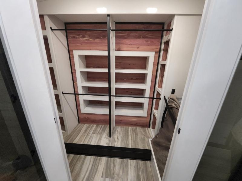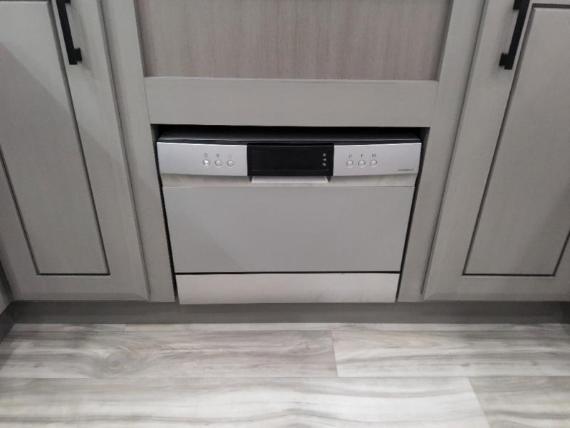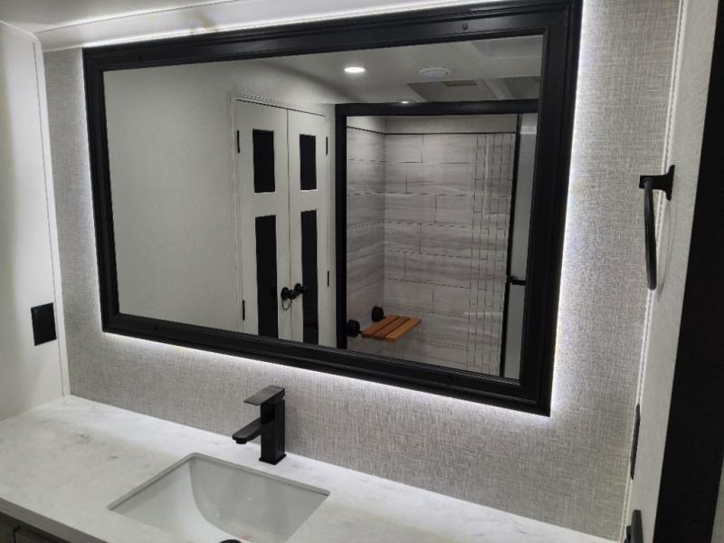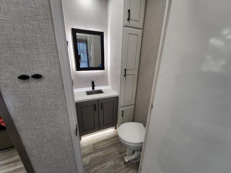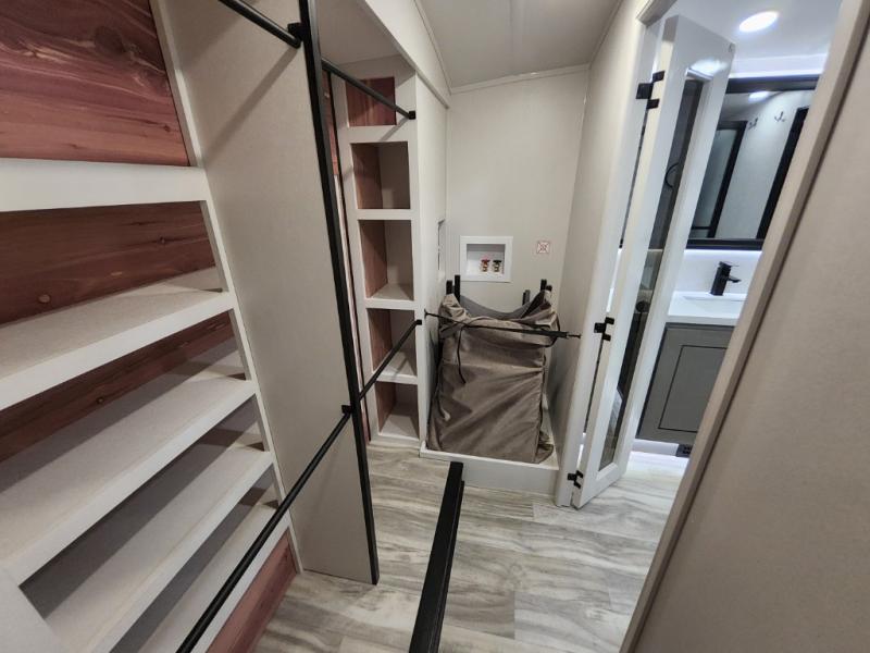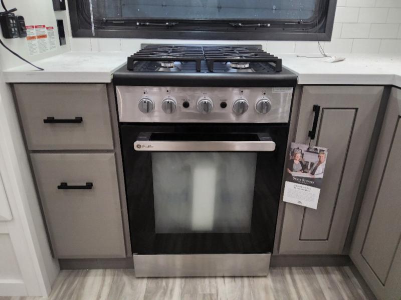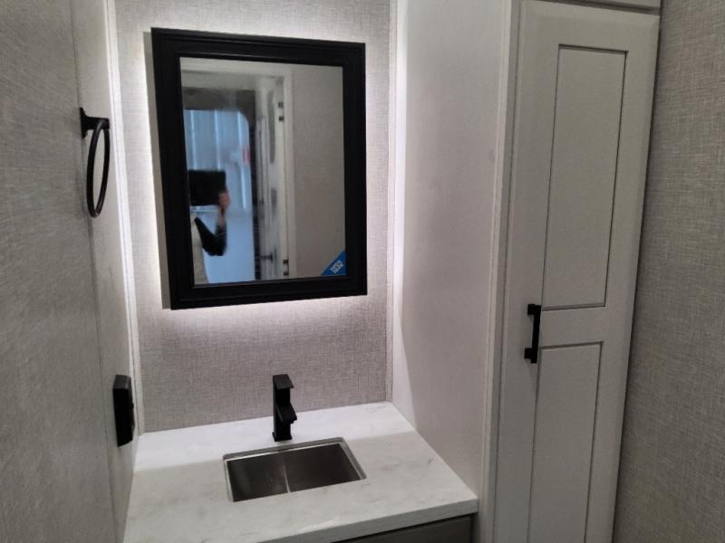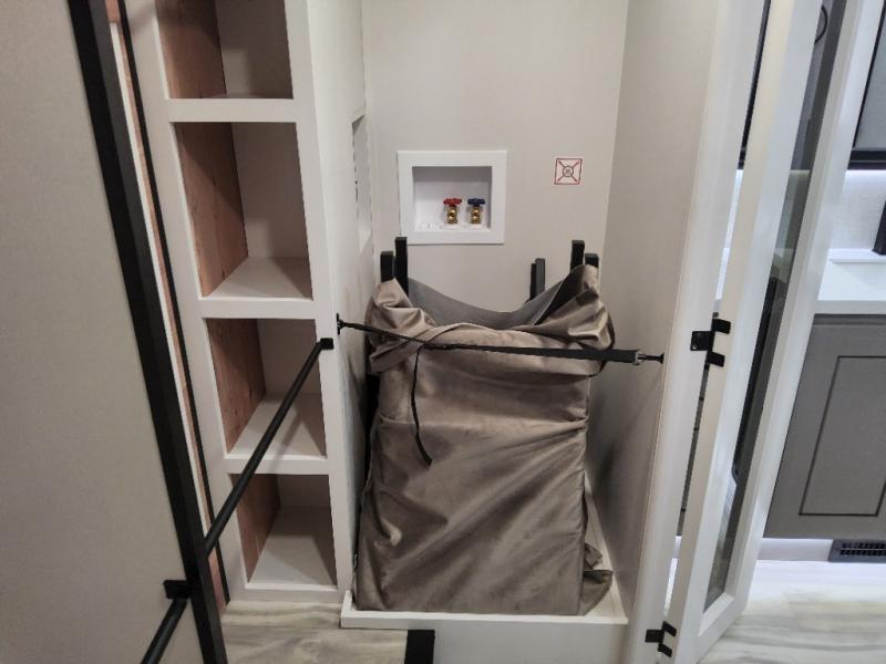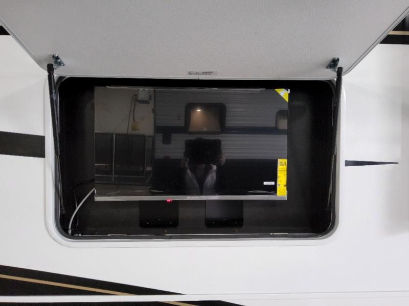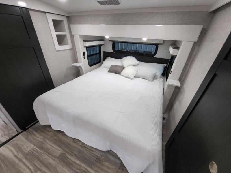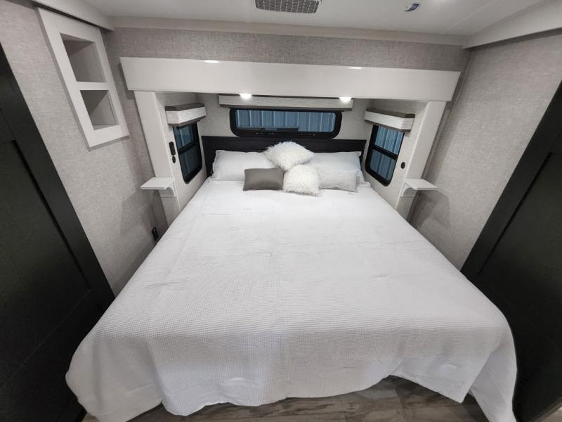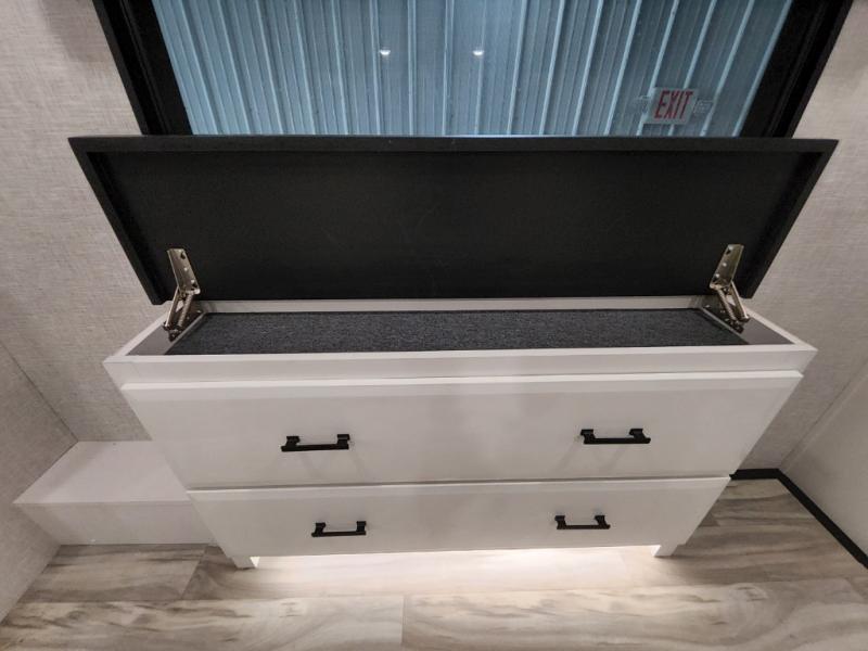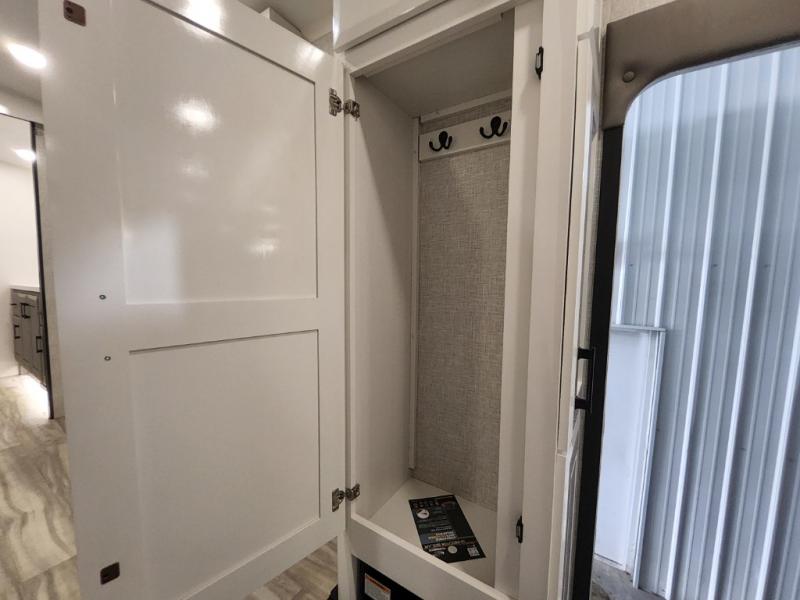 Triples slides, a desk/coffee bar, fireplace, and a huge master bath in front all indicate the kind of vacation you will experience in this Pinnacle Fifth Wheel! As you enter, a convenient half bath is located straight ahead. Slightly to your left, a nice seating area for gathering with family or friends to relax and watch TV, enjoy the fireplace while reading a book or watching a movie, and the dining table with chairs. The dinette slide also houses a 21 cu. ft. residential refrigerator and pantry. The rear kitchen features a u-shaped counter, all the appliances you need to cook like at home, even a pull-out butcher block space for chopping up your veggies. Back through and up the steps to your right in front, the master bedroom will make you feel like royalty with its king bed, plus luxurious full rear bath. A huge vanity with dual bath sinks will allow you both to get ready at the same time, plus there is a walk-in shower with a seat for added convenience. Speaking of walk-in, you will also love the spacious walk-in closet that includes washer/dryer prep.