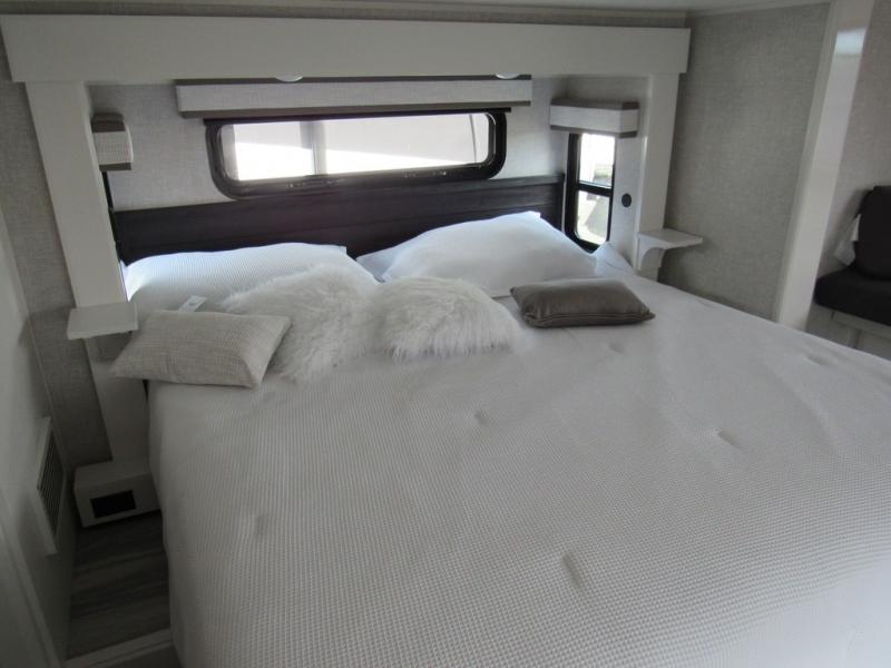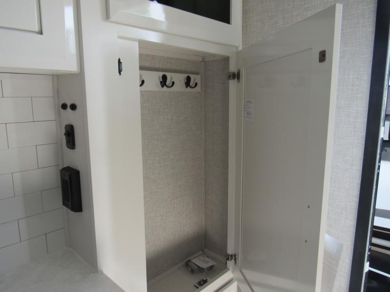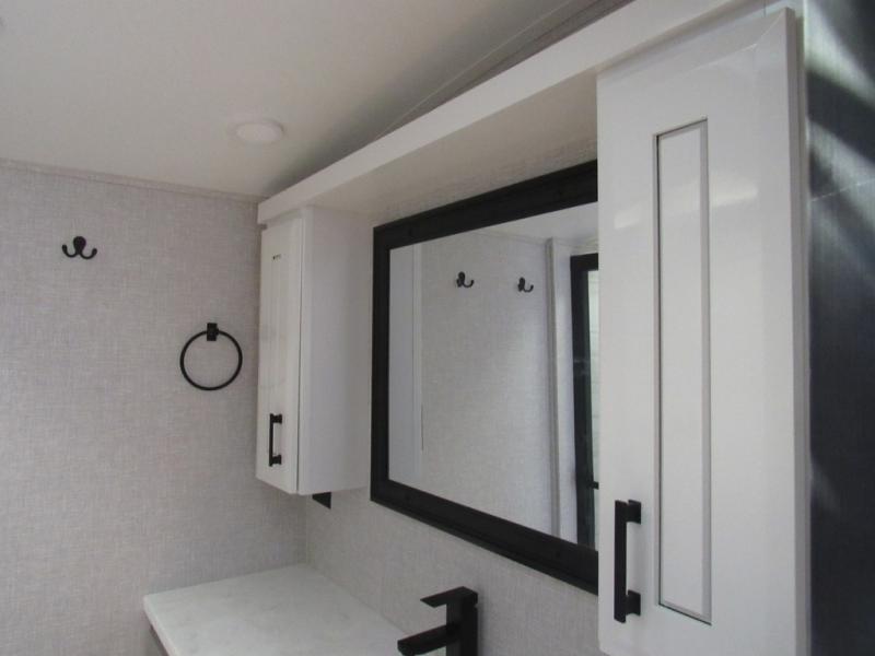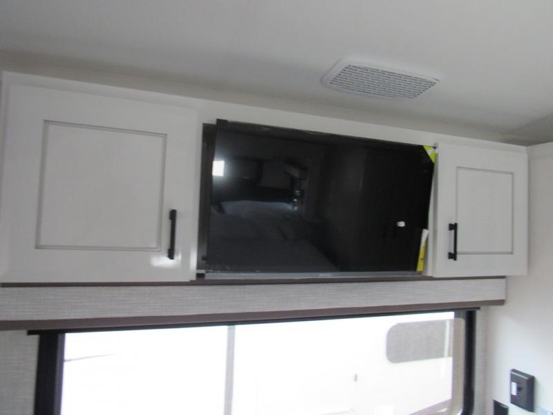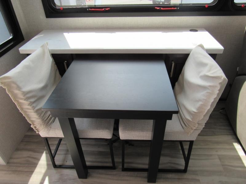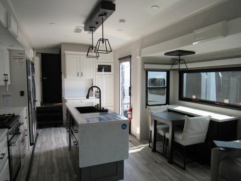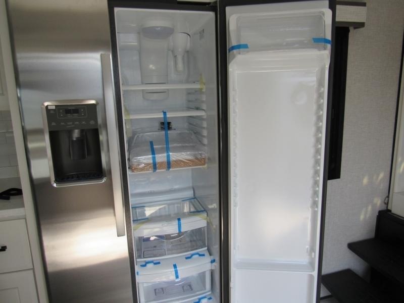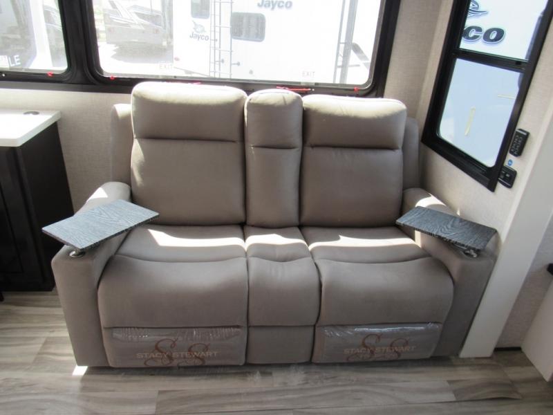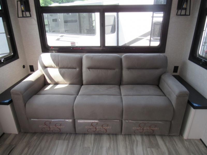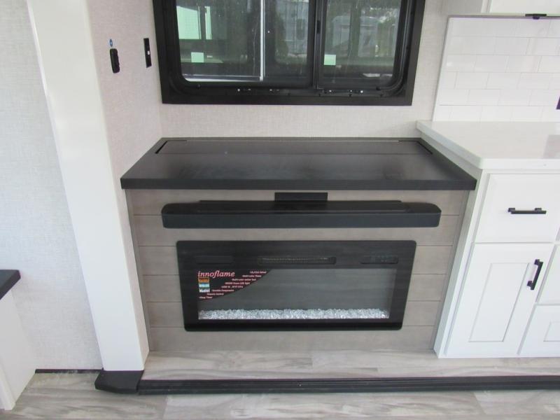 Take your camping trips up a notch in this luxurious fifth wheel! Your family will love to visit in the rear living area on the tri-fold sofa or theater seats, plus there is a credenza with roll-out table here to dine at together. The TV lift and fireplace will make it feel more like home, along with the kitchen island and residential refrigerator. Head up the steps to find cabinets for an optional washer and dryer, a full bath with a large bath vanity, plus a private bedroom up front that you are sure to love. When you aren't resting on the king bed slide out, read a book on the front window seat, or watch a movie with the bedroom TV provided. There is even a bedroom fireplace for added comfort. And check out the exterior with two power awnings with LED lights and a 32" TV!