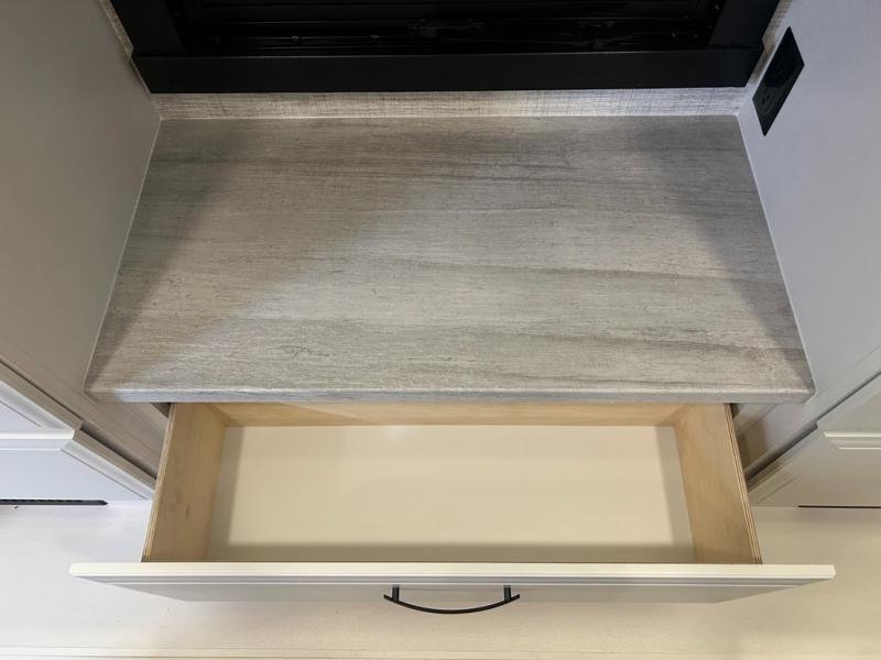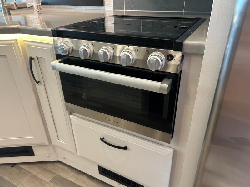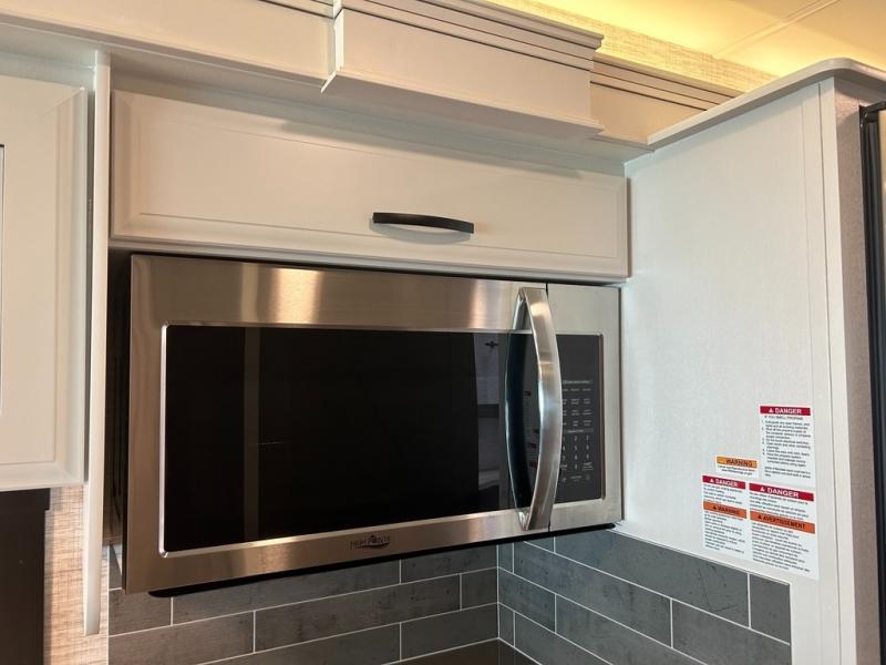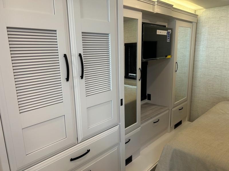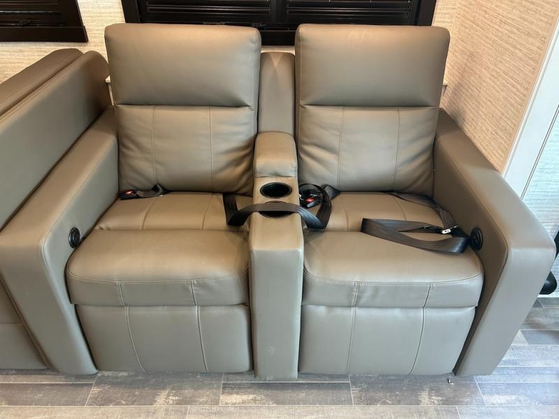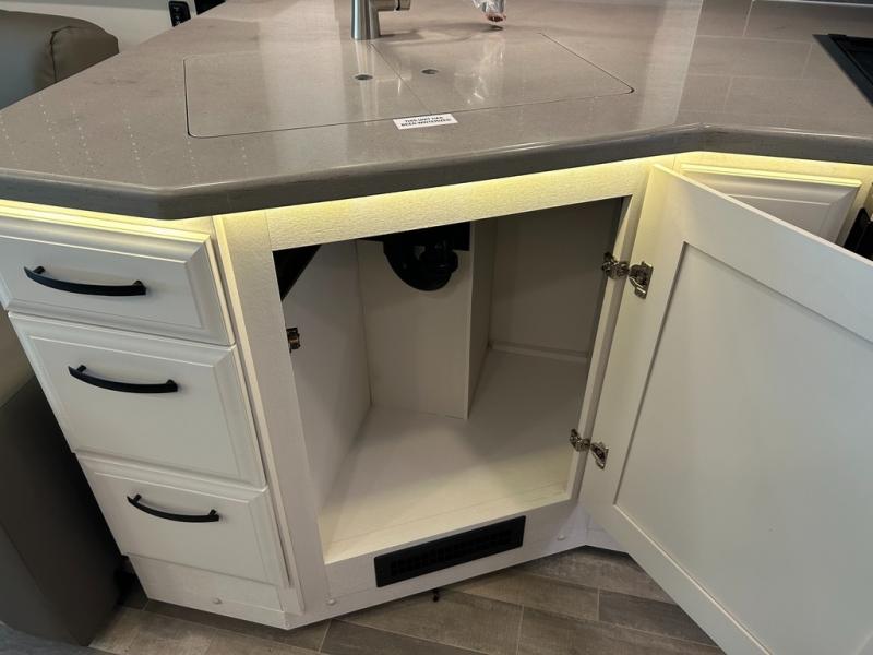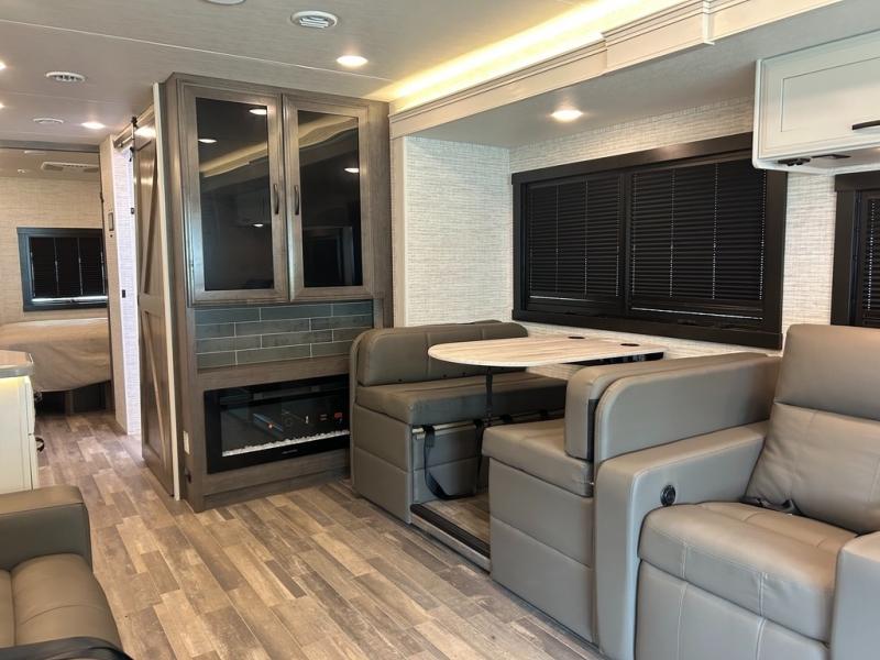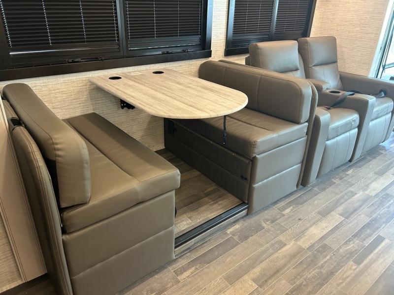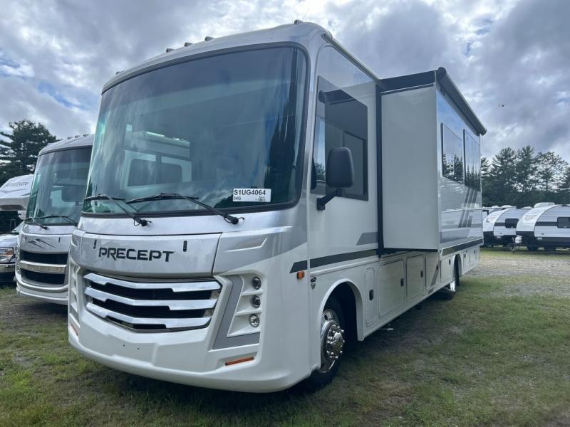 With its full-wall slide and additional slide in the living area, this Precept Class A gas motorhome is full of space! You'll have room to do the things you love, like cooking breakfast on the Furrion all-in-one cooktop and oven, relaxing on the theater sofa, cleaning up in the full bathroom, and playing card games at the booth dinette. You also won't be at a loss for entertainment because this coach offers you three TVs, and you'll even have an extra spot to relax once you turn the swivel cab seats around. In between the cab seats is a removable cockpit table that will allow you to set your glass of wine or cup of coffee down to talk, and you can add some more sleeping space to this coach by choosing the optional drop-down overhead bunk above the cab.