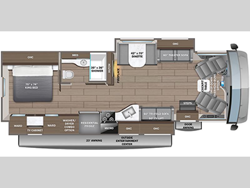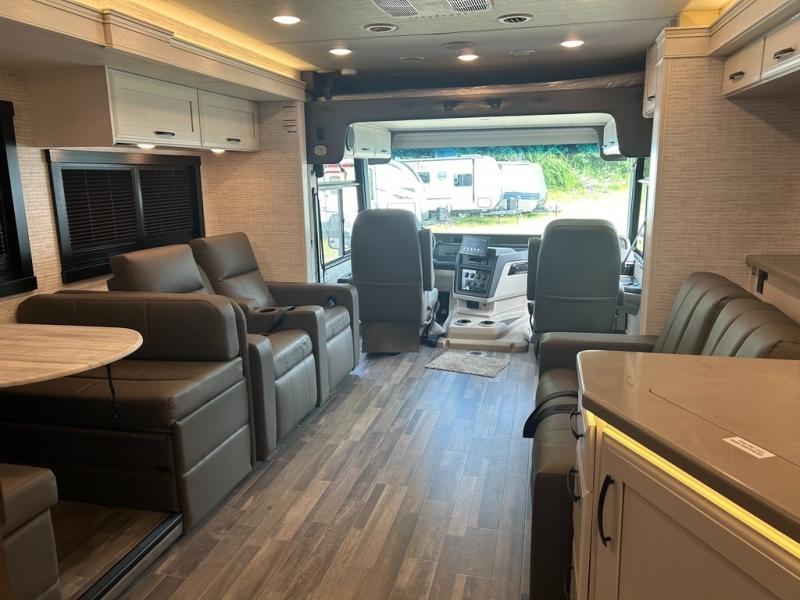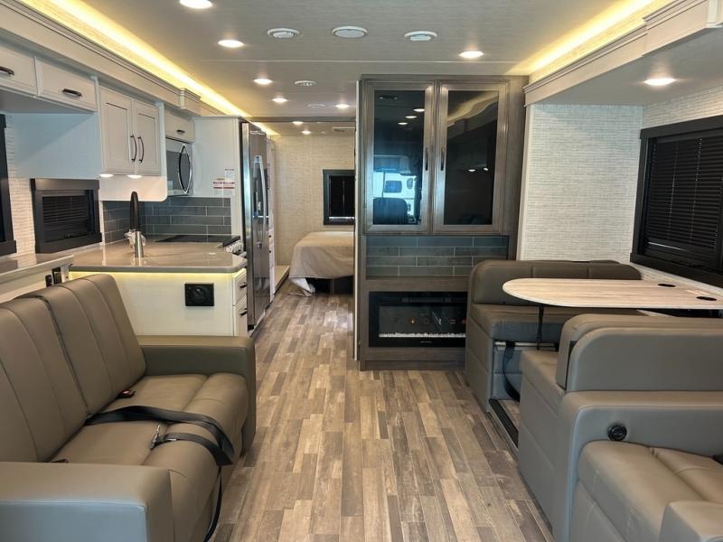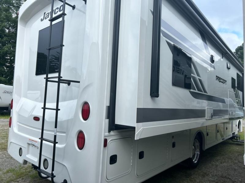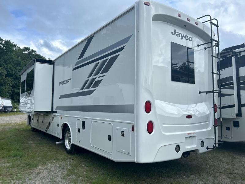 The Jayco Precept Class A gas motorhome comes with some features that you'll only find on a Jayco product, like the JRide Plus which offers you a powerful blend of precise handling and renowned stability on the road and the Firefly total coach control system which allows you to control your coach's operations from just about anywhere with your phone. You'll find two-point lap seatbelts in all designated seating locations, and the one-piece, seamless fiberglass front and rear caps resist wear and tear over the years. The Precept also offers you the lightest yet strongest construction in the industry with the Stronghold VBL lamination on the roof, floor, and sidewalls. You'll also be very pleased to find a 120" panoramic windshield, automatic hydraulic leveling jacks, and a 5,500W generator with auto-gen start.