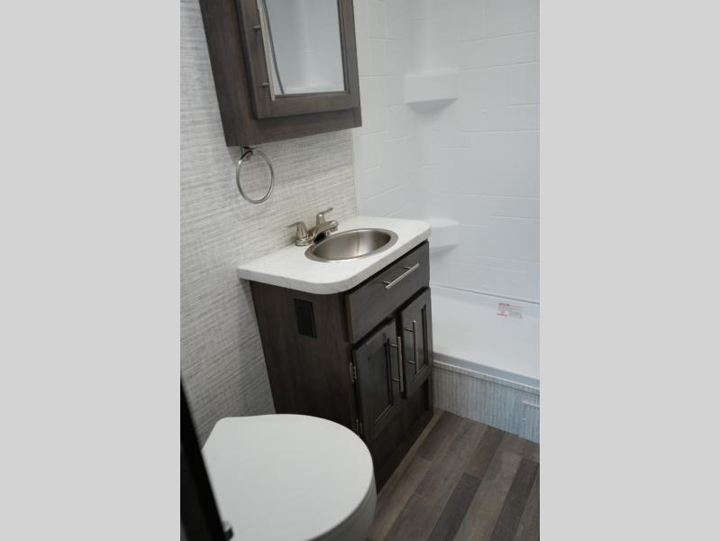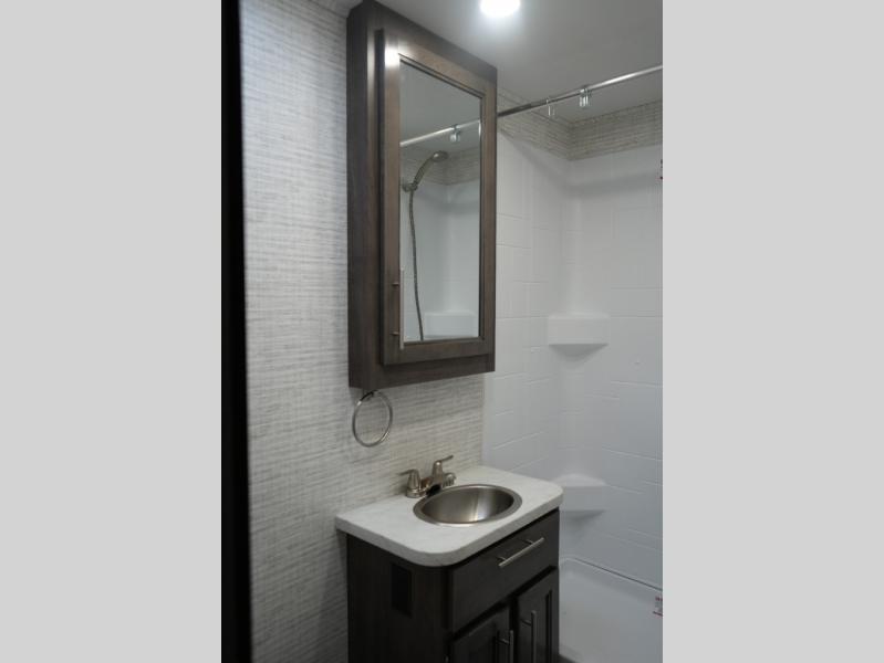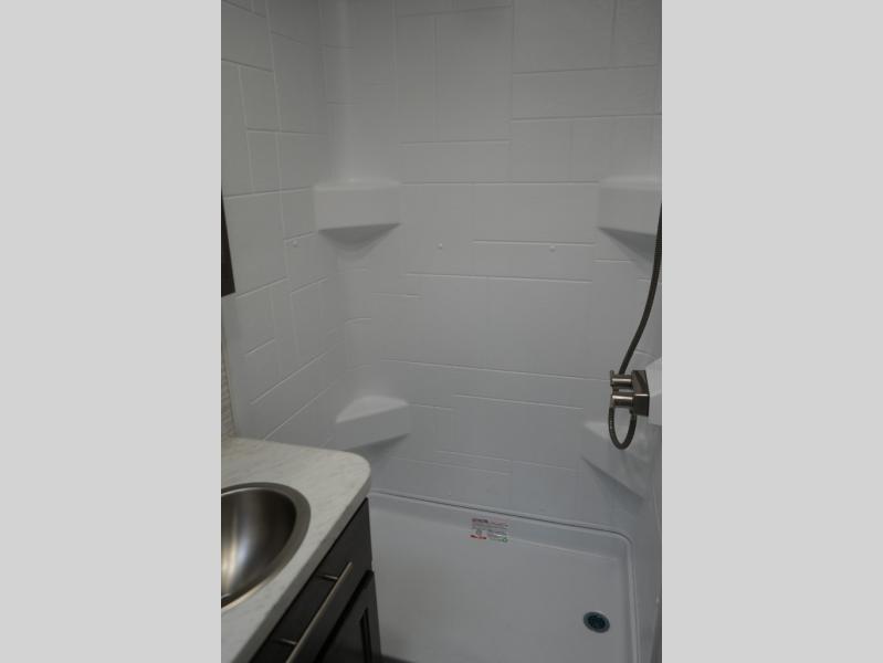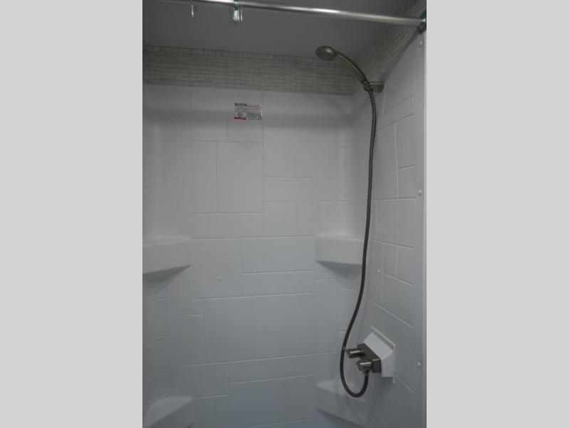 Freshen up after a day of adventure in the 24" x 36" shower, designed for practical use in a compact space. -
