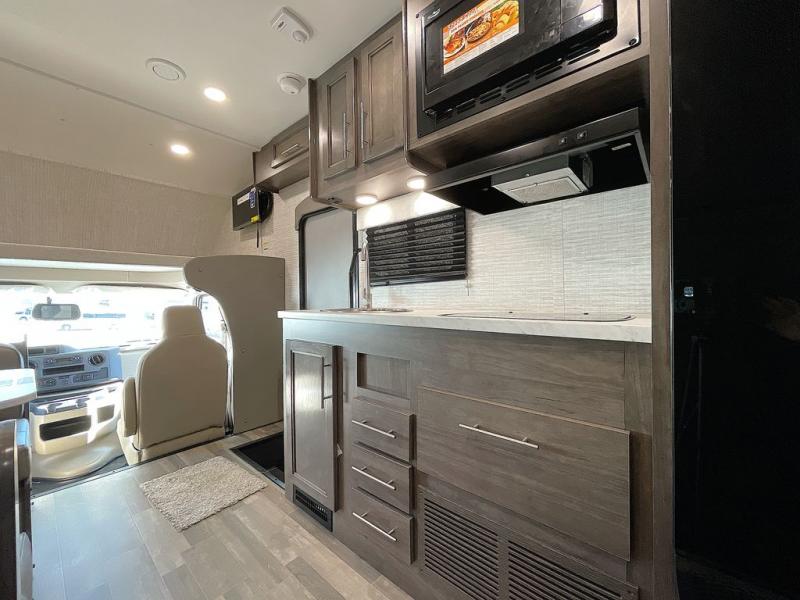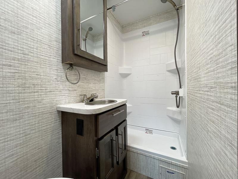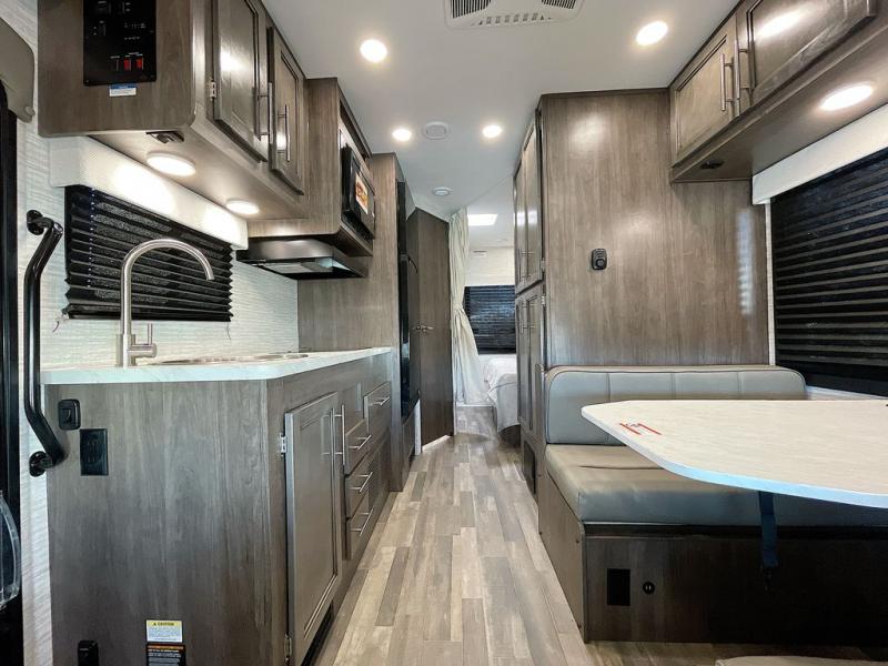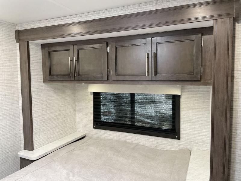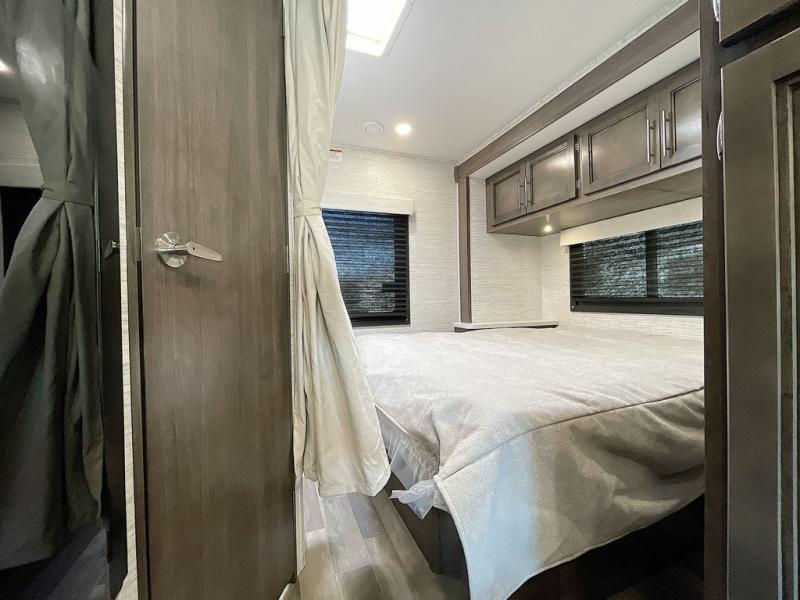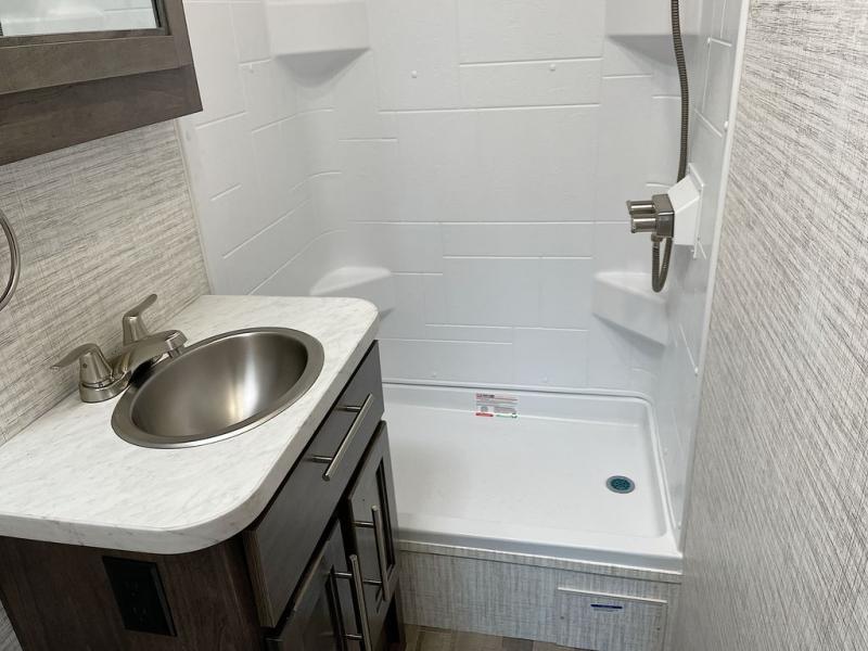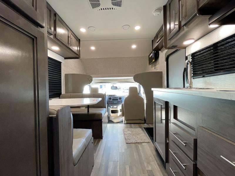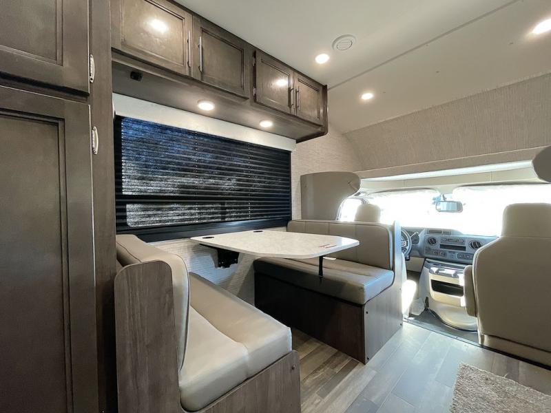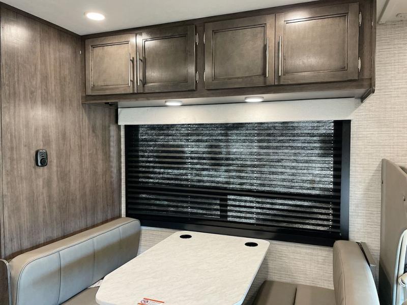 There's a comfortable place to sleep for everyone in this motorhome! From the corner 60" x 70" queen bed that slides out to the bunk over cab, and even the 42" x 70" booth dinette once converted. You can store your favorite snacks and hang up your clothes in the wardrobe/pantry. The chef can prepare delicious meals with the two burner cooktop and if there happens to be any leftovers then they can be stored in the 10 cu. ft. 12V refrigerator. The rear corner bathroom has a 24" x 36" shower that you are sure to enjoy after a long day of traveling!
