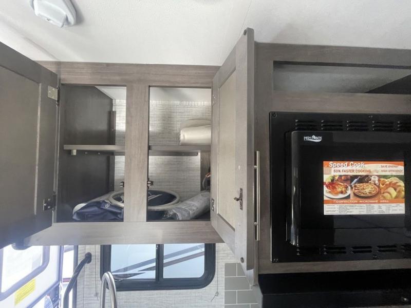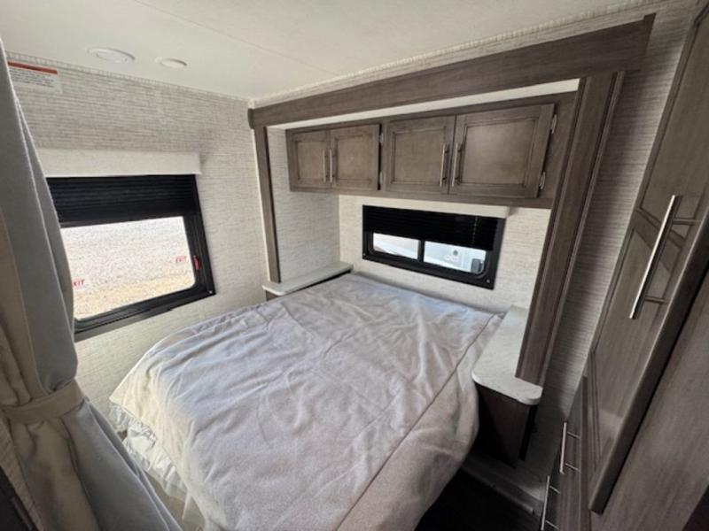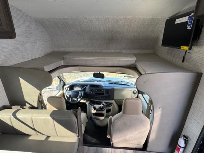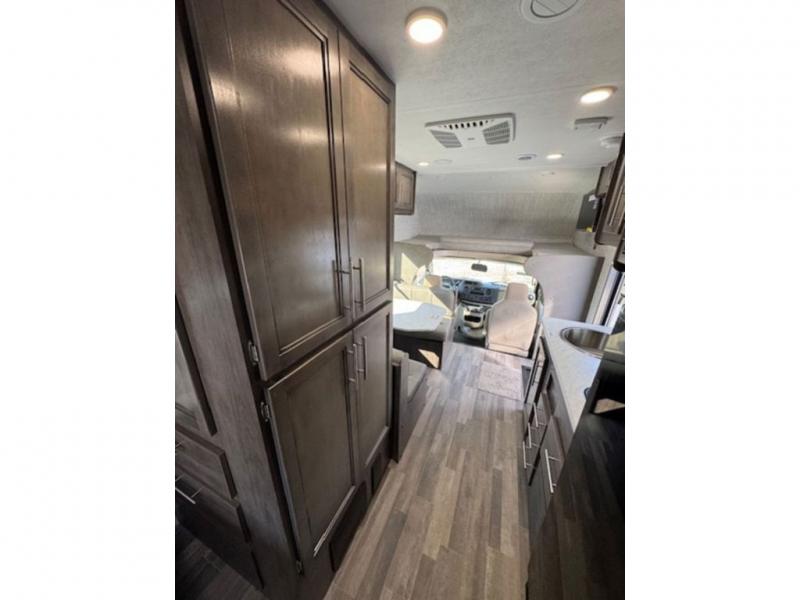 There's a comfortable place to sleep for everyone in this motorhome! From the corner 60" x 70" queen bed that slides out to the bunk over cab, and even the 42" x 70" booth dinette once converted. You can store your favorite snacks and hang up your clothes in the wardrobe/pantry. The chef can prepare delicious meals with the two burner cooktop and if there happens to be any leftovers then they can be stored in the 10 cu. ft. 12V refrigerator. The rear corner bathroom has a 24" x 36" shower that you are sure to enjoy after a long day of traveling!