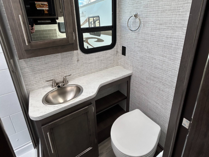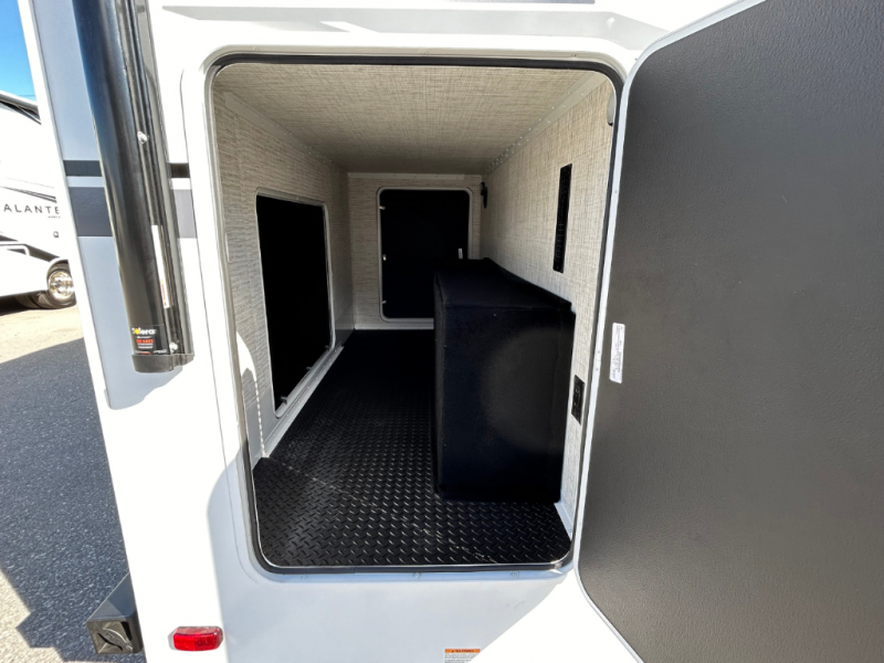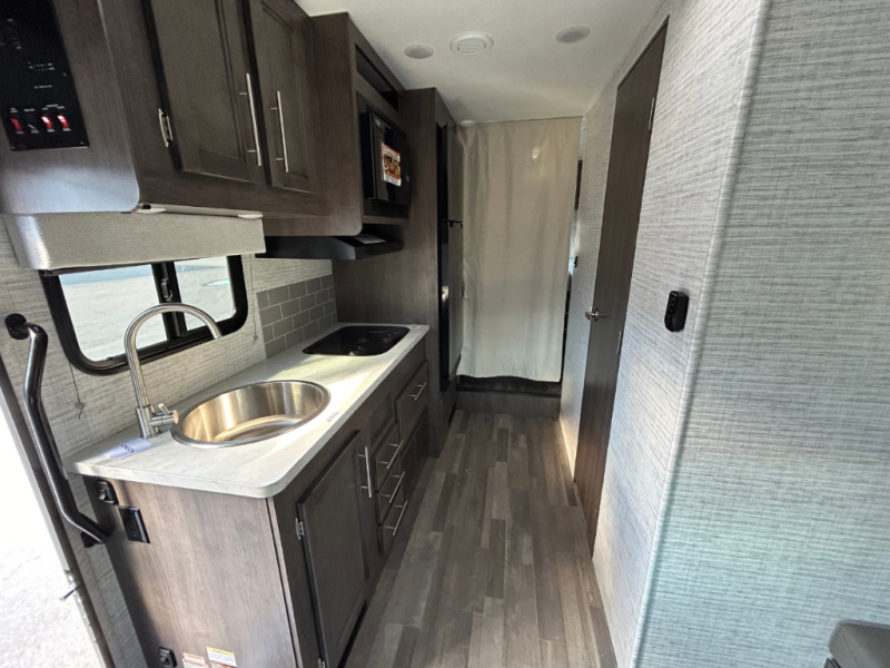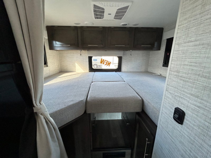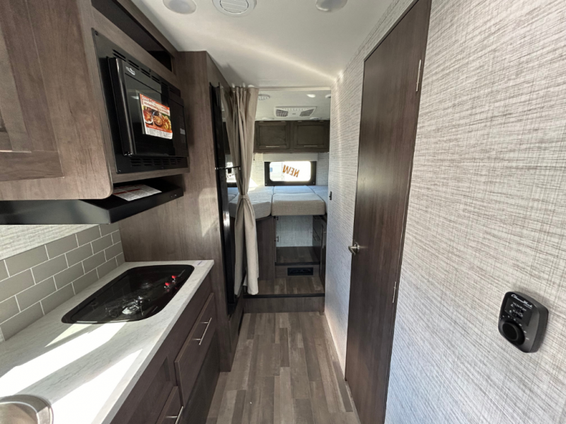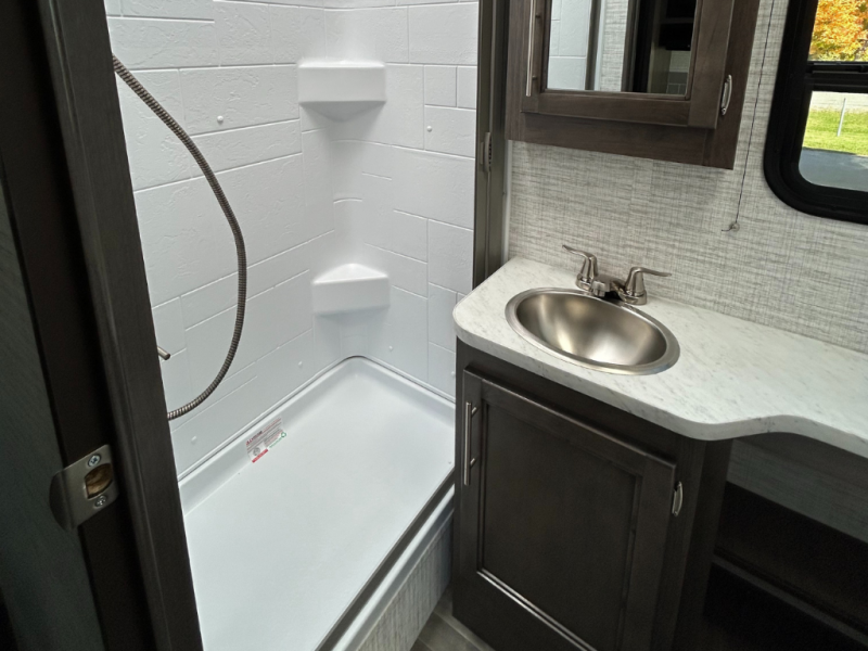 Each journey in this coach will be a journey to remember! Once you arrive at the campground, you can make lunch on the two burner cooktop with a flush cover, or use the convection microwave oven. There is also a 12V refrigerator and overhead cabinets for food, spices, and more. A 48" bench with a removable table will provide a place to dine at, and the mid-coach full bath means you won't have to use the camp's facilities. You'll find two twin beds that convert to a king-size bed in the back, meaning you can camp with your friend or honey!