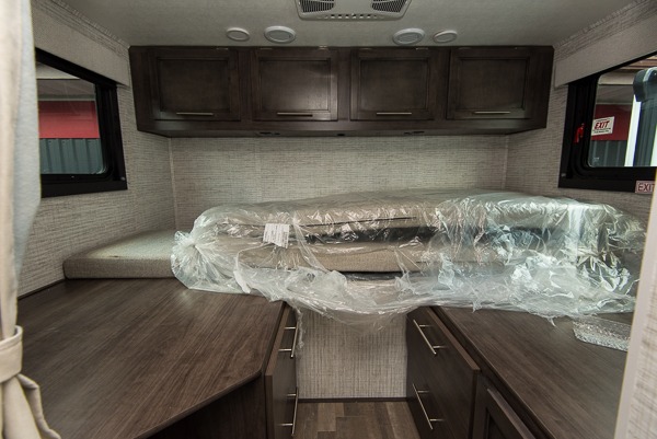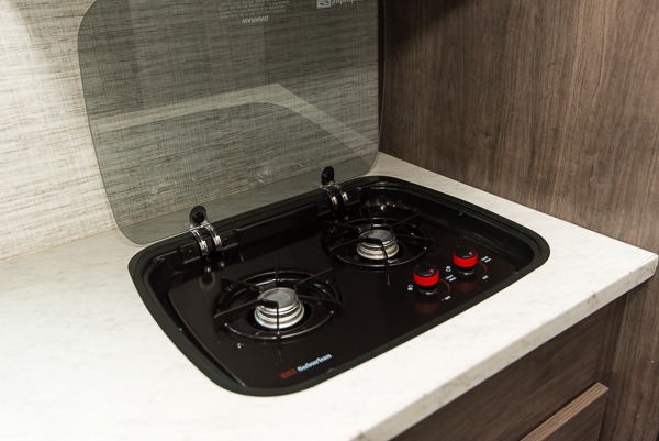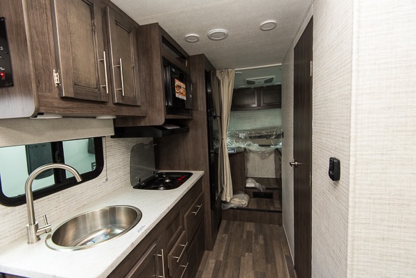 Each journey in this coach will be a journey to remember! Once you arrive at the campground, you can make lunch on the two burner cooktop with a flush cover, or use the convection microwave oven. There is also a 12V refrigerator and overhead cabinets for food, spices, and more. A 48" bench with a removable table will provide a place to dine at, and the mid-coach full bath means you won't have to use the camp's facilities. You'll find two twin beds that convert to a king-size bed in the back, meaning you can camp with your friend or honey!