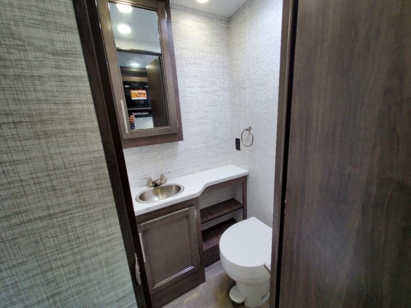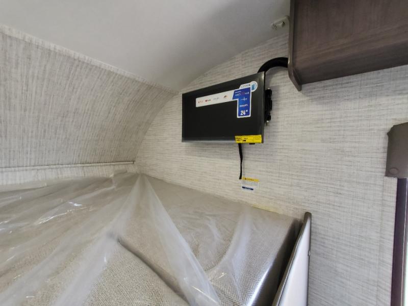 Each journey in this coach will be a journey to remember! Once you arrive at the campground, you can make lunch on the two burner cooktop with a flush cover, or use the convection microwave oven. There is also a 12V refrigerator and overhead cabinets for food, spices, and more. A 48" bench with a removable table will provide a place to dine at, and the mid-coach full bath means you won't have to use the camp's facilities. You'll find two twin beds that convert to a king-size bed in the back, meaning you can camp with your friend or honey!